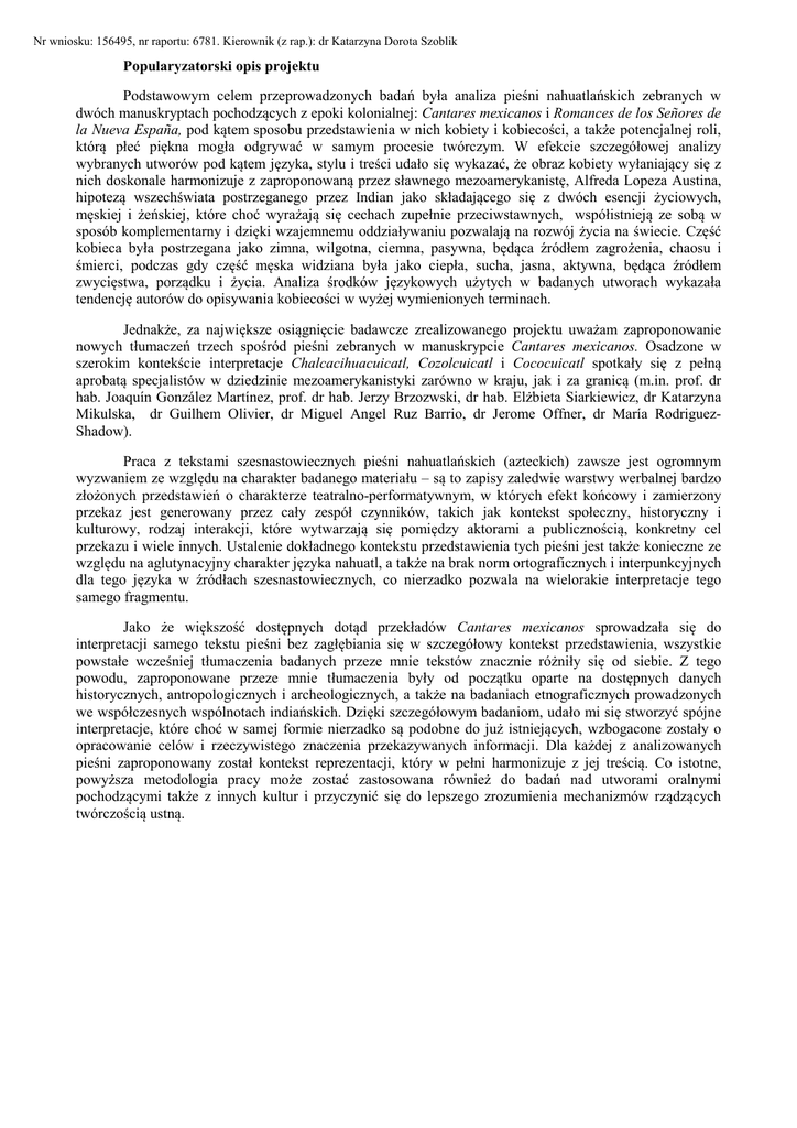 Nr wniosku: 156495, nr raportu: 6781. Kierownik (z rap.): dr Katarzyna Dorota Szoblik Popularyzatorski opis projektu Podstawowym celem przeprowadzonych badań była analiza pieśni nahuatlańskich zebranych w dwóch manuskryptach pochodzących z epoki kolonialnej: Cantares mexicanos i Romances de los Señores de la Nueva España, pod kątem sposobu przedstawienia w nich kobiety i kobiecości, a także potencjalnej roli, którą płeć piękna mogła odgrywać w samym procesie twórczym. W efekcie szczegółowej analizy wybranych utworów pod kątem języka, stylu i treści udało się wykazać, że obraz kobiety wyłaniający się z nich doskonale harmonizuje z zaproponowaną przez sławnego mezoamerykanistę, Alfreda Lopeza Austina, hipotezą wszechświata postrzeganego przez Indian jako składającego się z dwóch esencji życiowych, męskiej i żeńskiej, które choć wyrażają się cechach zupełnie przeciwstawnych, współistnieją ze sobą w sposób komplementarny i dzięki wzajemnemu oddziaływaniu pozwalają na rozwój życia na świecie. Część kobieca była postrzegana jako zimna, wilgotna, ciemna, pasywna, będąca źródłem zagrożenia, chaosu i śmierci, podczas gdy część męska widziana była jako ciepła, sucha, jasna, aktywna, będąca źródłem zwycięstwa, porządku i życia. Analiza środków językowych użytych w badanych utworach wykazała tendencję autorów do opisywania kobiecości w wyżej wymienionych terminach. Jednakże, za największe osiągnięcie badawcze zrealizowanego projektu uważam zaproponowanie nowych tłumaczeń trzech spośród pieśni zebranych w manuskrypcie Cantares mexicanos. Osadzone w szerokim kontekście interpretacje Chalcacihuacuicatl, Cozolcuicatl i Cococuicatl spotkały się z pełną aprobatą specjalistów w dziedzinie mezoamerykanistyki zarówno w kraju, jak i za granicą (m.in. prof. dr hab. Joaquín González Martínez, prof. dr hab. Jerzy Brzozwski, dr hab. Elżbieta Siarkiewicz, dr Katarzyna Mikulska, dr Guilhem Olivier, dr Miguel Angel Ruz Barrio, dr Jerome Offner, dr María RodriguezShadow). Praca z tekstami szesnastowiecznych pieśni nahuatlańskich (azteckich) zawsze jest ogromnym wyzwaniem ze względu na charakter badanego materiału – są to zapisy zaledwie warstwy werbalnej bardzo złożonych przedstawień o charakterze teatralno-performatywnym, w których efekt końcowy i zamierzony przekaz jest generowany przez cały zespół czynników, takich jak kontekst społeczny, historyczny i kulturowy, rodzaj interakcji, które wytwarzają się pomiędzy aktorami a publicznością, konkretny cel przekazu i wiele innych. Ustalenie dokładnego kontekstu przedstawienia tych pieśni jest także konieczne ze względu na aglutynacyjny charakter języka nahuatl, a także na brak norm ortograficznych i interpunkcyjnych dla tego języka w źródłach szesnastowiecznych, co nierzadko pozwala na wielorakie interpretacje tego samego fragmentu. Jako że większość dostępnych dotąd przekładów Cantares mexicanos sprowadzała się do interpretacji samego tekstu pieśni bez zagłębiania się w szczegółowy kontekst przedstawienia, wszystkie powstałe wcześniej tłumaczenia badanych przeze mnie tekstów znacznie różniły się od siebie. Z tego powodu, zaproponowane przeze mnie tłumaczenia były od początku oparte na dostępnych danych historycznych, antropologicznych i archeologicznych, a także na badaniach etnograficznych prowadzonych we współczesnych wspólnotach indiańskich. Dzięki szczegółowym badaniom, udało mi się stworzyć spójne interpretacje, które choć w samej formie nierzadko są podobne do już istniejących, wzbogacone zostały o opracowanie celów i rzeczywistego znaczenia przekazywanych informacji. Dla każdej z analizowanych pieśni zaproponowany został kontekst reprezentacji, który w pełni harmonizuje z jej treścią. Co istotne, powyższa metodologia pracy może zostać zastosowana również do badań nad utworami oralnymi pochodzącymi także z innych kultur i przyczynić się do lepszego zrozumienia mechanizmów rządzących twórczością ustną.