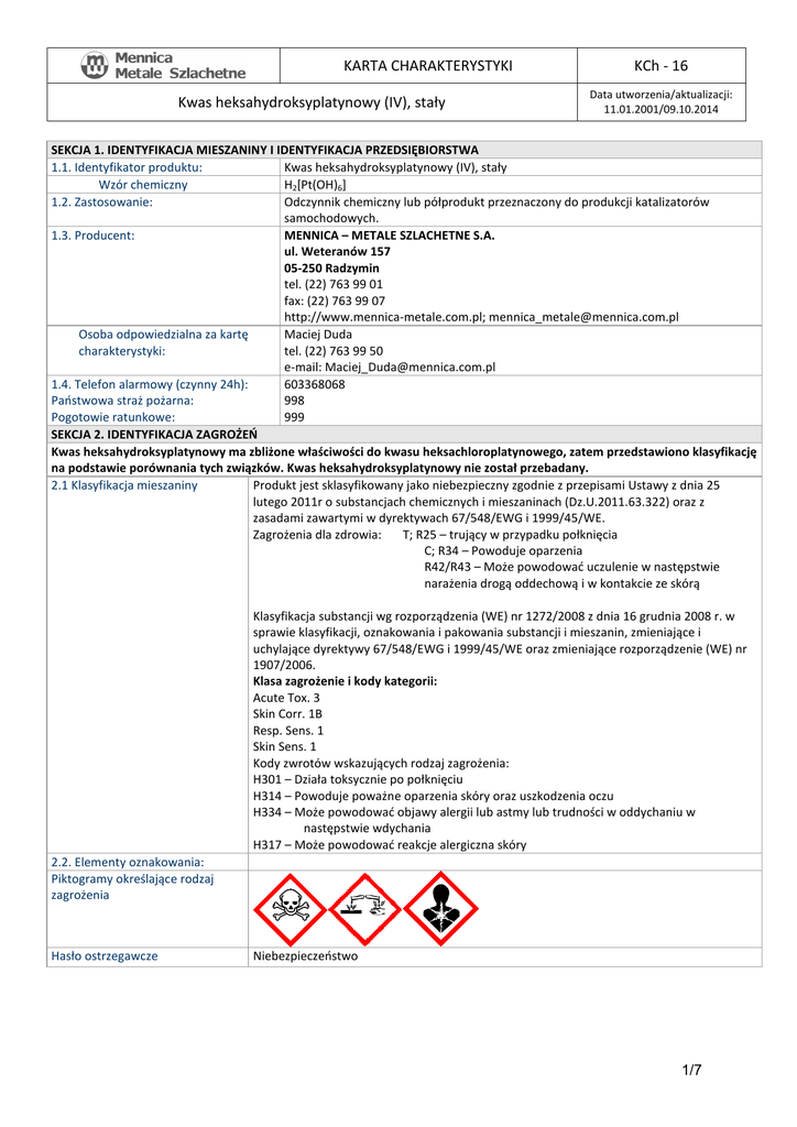 KARTA CHARAKTERYSTYKI Kwas heksahydroksyplatynowy (IV), stały KCh - 16 Data utworzenia/aktualizacji: 11.01.2001/09.10.2014 SEKCJA 1. IDENTYFIKACJA MIESZANINY I IDENTYFIKACJA PRZEDSIĘBIORSTWA 1.1. Identyfikator produktu: Kwas heksahydroksyplatynowy (IV), stały Wzór chemiczny H2[Pt(OH)6] 1.2. Zastosowanie: Odczynnik chemiczny lub półprodukt przeznaczony do produkcji katalizatorów samochodowych. 1.3. Producent: MENNICA – METALE SZLACHETNE S.A. ul. Weteranów 157 05-250 Radzymin tel. (22) 763 99 01 fax: (22) 763 99 07 http://www.mennica-metale.com.pl; [email protected] Osoba odpowiedzialna za kartę Maciej Duda charakterystyki: tel. (22) 763 99 50 e-mail: [email protected] 1.4. Telefon alarmowy (czynny 24h): 603368068 Państwowa straż pożarna: 998 Pogotowie ratunkowe: 999 SEKCJA 2. IDENTYFIKACJA ZAGROŻEŃ Kwas heksahydroksyplatynowy ma zbliżone właściwości do kwasu heksachloroplatynowego, zatem przedstawiono klasyfikację na podstawie porównania tych związków. Kwas heksahydroksyplatynowy nie został przebadany. 2.1 Klasyfikacja mieszaniny Produkt jest sklasyfikowany jako niebezpieczny zgodnie z przepisami Ustawy z dnia 25 lutego 2011r o substancjach chemicznych i mieszaninach (Dz.U.2011.63.322) oraz z zasadami zawartymi w dyrektywach 67/548/EWG i 1999/45/WE. Zagrożenia dla zdrowia: T; R25 – trujący w przypadku połknięcia C; R34 – Powoduje oparzenia R42/R43 – Może powodować uczulenie w następstwie narażenia drogą oddechową i w kontakcie ze skórą Klasyfikacja substancji wg rozporządzenia (WE) nr 1272/2008 z dnia 16 grudnia 2008 r. w sprawie klasyfikacji, oznakowania i pakowania substancji i mieszanin, zmieniające i uchylające dyrektywy 67/548/EWG i 1999/45/WE oraz zmieniające rozporządzenie (WE) nr 1907/2006. Klasa zagrożenie i kody kategorii: Acute Tox. 3 Skin Corr. 1B Resp. Sens. 1 Skin Sens. 1 Kody zwrotów wskazujących rodzaj zagrożenia: H301 – Działa toksycznie po połknięciu H314 – Powoduje poważne oparzenia skóry oraz uszkodzenia oczu H334 – Może powodować objawy alergii lub astmy lub trudności w oddychaniu w następstwie wdychania H317 – Może powodować reakcje alergiczna skóry 2.2. Elementy oznakowania: Piktogramy określające rodzaj zagrożenia Hasło ostrzegawcze Niebezpieczeństwo 1/7 KARTA CHARAKTERYSTYKI Kwas heksahydroksyplatynowy (IV), stały KCh - 16 Data utworzenia/aktualizacji: 11.01.2001/09.10.2014 Zwroty wskazujące rodzaj zagrożenia H301 – Działa toksycznie po połknięciu H314 – Powoduje poważne oparzenia skóry oraz uszkodzenia oczu H334 – Może powodować objawy alergii lub astmy lub trudności w oddychaniu w następstwie wdychania H317 – Może powodować reakcje alergiczna skóry Zwroty wskazujące środki P260 – Nie wdychać rozpylonej cieczy. ostrożności P305+351+338 – W przypadku dostania się do oczu: ostrożnie płukać wodą przez kilka minut. Wyjąć soczewki kontaktowe, jeśli są i można je łatwo usunąć. Nadal płukać. P303+361+353 – W przypadku kontaktu ze skórą: natychmiast usunąć/zdjąć całą zanieczyszczoną odzież. Spłukać skórę pod strumieniem wody/prysznicem P280 – Nosić odpowiednią odzież ochronną, odpowiednie rękawice ochronne i okulary lub ochronę twarzy. P301+330+P310 – W razie połknięcia: wypłukać usta. Natychmiast skontaktować się z ośrodkiem zatruć lub lekarzem. P304+340 – W przypadku dostania się do dróg oddechowych: wyprowadzić lub wynieść poszkodowanego na świeże powietrze i zapewnić warunki do odpoczynku w pozycji umożliwiającej swobodne oddychanie. 2.3. Inne zagrożenia Może gwałtownie reagować z różnymi materiałami z wydzieleniem substancji niebezpiecznych (wodór). SEKCJA 3. SKŁAD I INFORMACJA O SKŁADNIKACH Klasyfikacja CLP Klasyfikacja wg Kody zwrotów Identyfikator produktu Zawartość % Klasa zagrożenia i 67/548/EWG wskazujących rodzaj kody kategorii zagrożenia Kwas heksachloroplatynowy (IV) Acute Tox. 3 H301 T; R25 WE: 241-010-7 Skin Corr. 1B H314 100% C; R34 H334 CAS: 16941-12-1 Resp. Sens. 1 R42/43 Nr indeksowy: 078-009-00-4 Skin Sens. 1 H317 SEKCJA 4. PIERWSZA POMOC 4.1. Opis środków pierwszej Wynieść zatrutego ze skażonej atmosfery. pomocy Wdychanie: Zapewnić zatrutemu spokój, chronić przed utratą ciepła. W razie wystąpienia duszności podać tlen. Usunąć szkła kontaktowe. Przemywać oczy dużą ilością letniej wody co najmniej 15 min. (przy odwiniętych powiekach), unikać silnego strumienia wody ze względu na Kontakt z oczami: ryzyko uszkodzenia rogówki, w przypadku zanieczyszczenia jednego oka chronić w trakcie przemywania drugie oko przed zanieczyszczeniem. Natychmiast zgłosić się do okulisty. Zdjąć nasiąknięte ubrania i buty. Przemyć dużą ilością wody. Kontakt ze skórą: Nie stosować środków zobojętniających. Wezwać lekarza. Nie wywoływać wymiotów. Natychmiast wezwać lekarza lub/i Drogi pokarmowe: skontaktować się z ośrodkiem zatruć, pokazać opakowanie, etykietę lub kartę charakterystyki. Ogólne zalecenia: Zapewnić zatrutemu spokój, chronić przed utratą ciepła, kontrolować oddech i puls; nigdy nie wywoływać wymiotów ani nie podawać niczego doustnie osobie nieprzytomnej lub zamroczonej. W przypadku wystąpienia jakichkolwiek niepokojących objawów wezwać natychmiast lekarza lub odwieźć poszkodowanego do szpitala, pokazać opakowanie produktu lub etykietę. Zalecane jest przeniesienie narażonej osoby z miejsca narażenia na świeże powietrze. Zalecane jest indywidualne wyposażenie ochronne dla osób udzielających pierwszej pomocy. 2/7 KARTA CHARAKTERYSTYKI Kwas heksahydroksyplatynowy (IV), stały 4.2. Najważniejsze ostre i opóźnione objawy oraz skutki narażenia KCh - 16 Data utworzenia/aktualizacji: 11.01.2001/09.10.2014 Wdychanie: Kontakt ze skórą: Może powodować podrażnienie dróg oddechowych Powoduje poważne oparzenia. Kwas heksachloroplatynowy jest trucizną. Może doprowadzić do Spożycie: śmierci. Kontakt z