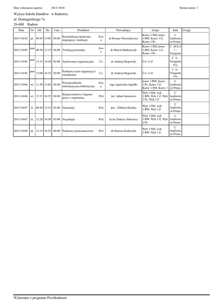 Data wykonania raportu: 2015-10-01 Strona numer: 1 Wyższa Szkoła Handlow w Radomiu ul. Domagalskiego 7a 26-600 Radom Data Dn Od Do Czas Przedmiot Prowadzący Grupa Sala Kon w dr Roman Wawrykowicz Konw 1/SM, konw 1/BW, Konw 1/Z, Konw 1/Ps pon 08:50 12:15 04:00 Trening personalny . Kon w dr Marcin Bednarczyk Konw 1/SM, konw 1/BW, Konw 1/Z, Konw 1/Ps C AULA 1Traugutta 2015-10-05 pon 13:15 14:50 02:00 Zachowania organizacyjne . Ćw dr Andrzej Rogowski Ćw 11/Z C 8Traugutta 61a 2015-10-05 pon Podstawy teorii organizacji i 15:00 16:35 02:00 . zarządzania Ćw dr Andrzej Rogowski Ćw 11/Z C 8Traugutta 61a 2015-10-06 wt. 11:30 13:05 02:00 Przysposobienie informatyczno-biblioteczne Kon w mgr Agnieszka Jagiełło konw 1/BW, Konw C 1/Ps, Konw 1/Z, Auditoriu Konw 1/SM, Konw 1 m Primu 2015-10-06 wt. 13:15 16:35 04:00 Bezpieczeństwo i higiena pracy z ergonomią Wyk inż. Adam Sarnowicz Wyk 1/SM, wyk C 1/BW, Wyk 1/Z, Wyk Auditoriu 1/Ps, Wyk 1/I/ m Primu 2015-10-07 śr. 09:45 12:15 03:00 Ekonomia Wyk doc. Elżbieta Kielska Wyk 1/SM, wyk 1/BW, Wyk 1/Z 2015-10-07 śr. 12:20 14:50 03:00 Socjologia Wyk dr ha Tadeusz Sakowicz 2015-10-09 pt. 13:15 16:35 04:00 Podstawy prawoznawstwa Wyk dr Dariusz Kotłowski 2015-10-02 pt. 09:45 13:05 04:00 2015-10-05 Komunikacja społeczna, negocjacje i mediacje Wykonano z programu ProAkademia C Auditoriu m Primu C Auditoriu m Primu Wyk 1/SM, wyk C 1/BW, Wyk 1/Z, Wyk Auditoriu 1/Ps m Primu Wyk 1/SM, wyk 1/BW, Wyk 1/Z C Auditoriu m Primu Uwagi: