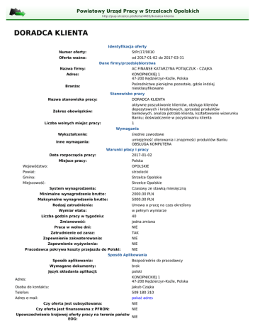 Powiatowy Urząd Pracy w Strzelcach Opolskich http://pup-strzelce.pl/oferta/4405/doradca-klienta DORADCA KLIENTA Identyfikacja oferty Numer oferty: StPr/17/0010 Oferta ważna: od 2017-01-02 do 2017-03-31 Dane firmy/przedsiębiorstwa Nazwa firmy: AC FINANSE KATARZYNA POTAJCZUK - CZAJKA Adres: KONOPNICKIEJ 1 47-200 Kędzierzyn-Koźle, Polska Pośrednictwo pieniężne pozostałe, gdzie indziej niesklasyfikowane Branża: Stanowisko pracy Nazwa stanowiska pracy: DORADCA KLIENTA aktywne poszukiwanie klientów, obsługa klientów depozytowych i kredytowych, sprzedaż produktów bankowych, analiza potrzeb klienta, kształtowanie wizerunku Banku; doświadczenie w pozyskiwaniu klienta Zakres obowiązków: Liczba wolnych miejsc pracy: 1 Wymagania Wykształcenie: średnie zawodowe umiejętność oferowania i znajomości produktów Banku OBSŁUGA KOMPUTERA Inne wymagania: Warunki płacy i pracy Data rozpoczęcia pracy: 2017-01-02 Miejsce pracy: Polska Województwo: OPOLSKIE Powiat: strzelecki Gmina: Strzelce Opolskie Miejscowość: Strzelce Opolskie System wynagrodzenia: Czasowy ze stawką miesięczną Minimalne wynagrodzenie brutto: 2000.00 PLN Maksymalne wynagrodzenie brutto: 5000.00 PLN Rodzaj zatrudnienia: Umowa o pracę na czas określony Wymiar etatu: w pełnym wymiarze Liczba godzin pracy w tygodniu: 40 Zmianowość: jedna zmiana Praca w wolne dni: NIE Zatrudnienie od zaraz: TAK Zapewnienie zakwaterowania: NIE Zapewnienie wyżywienia: NIE Pracodawca pokrywa koszty przejazdu do Polski: NIE Sposób Aplikowania Sposób aplikowania: Bezpośrednio do pracodawcy Wymagane dokumenty: brak Język składania aplikacji: polski Adres: KONOPNICKIEJ 1 47-200 Kędzierzyn-Koźle, Polska Osoba do kontaktu: Jakub Czajka Telefon: 509 180 310 Adres e-mail: pokaż adres Czy oferta jest subsydiowana: NIE Czy oferta jest finansowana z PFRON: NIE Upowszechnienie krajowej oferty pracy na terenie państw NIE EOG: