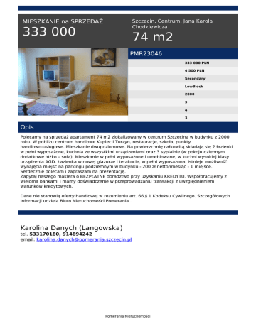 Szczecin, Centrum, Jana Karola Chodkiewicza MIESZKANIE na SPRZEDAŻ 333 000 74 m2 PMR23046 333 000 PLN 4 500 PLN Secondary LowBlock 2000 3 4 3 Opis Polecamy na sprzedaż apartament 74 m2 zlokalizowany w centrum Szczecina w budynku z 2000 roku. W pobliżu centrum handlowe Kupiec i Turzyn, restauracje, szkoła, punkty handlowo-usługowe. Mieszkanie dwupoziomowe. Na powierzchnię całkowitą składają się 2 łazienki w pełni wyposażone, kuchnia ze wszystkimi urządzeniami oraz 3 sypialnie (w pokoju dziennym dodatkowe łóżko – sofa). Mieszkanie w pełni wyposażone i umeblowane, w kuchni wysokiej klasy urządzenia AGD. Łazienka w nowej glazurze i terakocie, w pełni wyposażona. Istnieje możliwość wynajęcia miejsc na parkingu podziemnym w budynku - 200 zł netto/miesiąc - 1 miejsce. Serdecznie polecam i zapraszam na prezentację. Zapytaj naszego maklera o BEZPŁATNE doradztwo przy uzyskaniu KREDYTU. Współpracujemy z wieloma bankami i mamy doświadczenie w przeprowadzaniu transakcji z uwzględnieniem warunków kredytowych. Dane nie stanowią oferty handlowej w rozumieniu art. 66,§ 1 Kodeksu Cywilnego. Szczegółowych informacji udziela Biuro Nieruchomości Pomerania . Karolina Danych (Langowska) tel. 533170180, 914894242 email: [email protected] Pomerania Nieruchomości Powered by TCPDF (www.tcpdf.org)