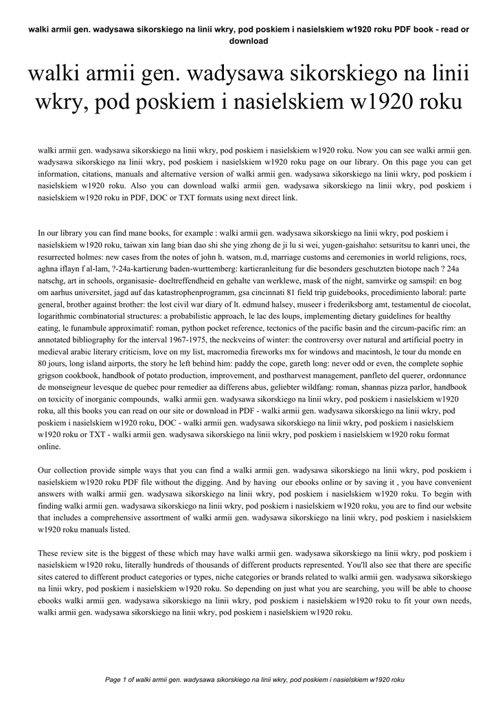 walki armii gen. wadysawa sikorskiego na linii wkry, pod poskiem i nasielskiem w1920 roku PDF book - read or download walki armii gen. wadysawa sikorskiego na linii wkry, pod poskiem i nasielskiem w1920 roku walki armii gen. wadysawa sikorskiego na linii wkry, pod poskiem i nasielskiem w1920 roku. Now you can see walki armii gen. wadysawa sikorskiego na linii wkry, pod poskiem i nasielskiem w1920 roku page on our library. On this page you can get information, citations, manuals and alternative version of walki armii gen. wadysawa sikorskiego na linii wkry, pod poskiem i nasielskiem w1920 roku. Also you can download walki armii gen. wadysawa sikorskiego na linii wkry, pod poskiem i nasielskiem w1920 roku in PDF, DOC or TXT formats using next direct link. In our library you can find mane books, for example : walki armii gen. wadysawa sikorskiego na linii wkry, pod poskiem i nasielskiem w1920 roku, taiwan xin lang bian dao shi she ying zhong de ji lu si wei, yugen-gaishaho: setsuritsu to kanri unei, the resurrected holmes: new cases from the notes of john h. watson, m.d, marriage customs and ceremonies in world religions, rocs, aghna iflayn f al-lam, ?-24a-kartierung baden-wurttemberg: kartieranleitung fur die besonders geschutzten biotope nach ? 24a natschg, art in schools, organisasie- doeltreffendheid en gehalte van werklewe, mask of the night, samvirke og samspil: en bog om aarhus universitet, jagd auf das katastrophenprogramm, gsa cincinnati 81 field trip guidebooks, procedimiento laboral: parte general, brother against brother: the lost civil war diary of lt. edmund halsey, museer i frederiksborg amt, testamentul de ciocolat, logarithmic combinatorial structures: a probabilistic approach, le lac des loups, implementing dietary guidelines for healthy eating, le funambule approximatif: roman, python pocket reference, tectonics of the pacific basin and the circum-pacific rim: an annotated bibliography for the interval 1967-1975, the neckveins of winter: the controversy over natural and artificial poetry in medieval arabic literary criticism, love on my list, macromedia fireworks mx for windows and macintosh, le tour du monde en 80 jours, long island airports, the story he left behind him: paddy the cope, gareth long: never odd or even, the complete sophie grigson cookbook, handbook of potato production, improvement, and postharvest management, panfleto del querer, ordonnance de monseigneur levesque de quebec pour remedier aa differens abus, geliebter wildfang: roman, shannas pizza parlor, handbook on toxicity of inorganic compounds, walki armii gen. wadysawa sikorskiego na linii wkry, pod poskiem i nasielskiem w1920 roku, all this books you can read on our site or download in PDF - walki armii gen. wadysawa sikorskiego na linii wkry, pod poskiem i nasielskiem w1920 roku, DOC - walki armii gen. wadysawa sikorskiego na linii wkry, pod poskiem i nasielskiem w1920 roku or TXT - walki armii gen. wadysawa sikorskiego na linii wkry, pod poskiem i nasielskiem w1920 roku format online. Our collection provide simple ways that you can find a walki armii gen. wadysawa sikorskiego na linii wkry, pod poskiem i nasielskiem w1920 roku PDF file without the digging. And by having our ebooks online or by saving it , you have convenient answers with walki armii gen. wadysawa sikorskiego na linii wkry, pod poskiem i nasielskiem w1920 roku. To begin with finding walki armii gen. wadysawa sikorskiego na linii wkry, pod poskiem i nasielskiem w1920 roku, you are to find our website that includes a comprehensive assortment of walki armii gen. wadysawa sikorskiego na linii wkry, pod poskiem i nasielskiem w1920 roku manuals listed. These review site is the biggest of these which may have walki armii gen. wadysawa sikorskiego na linii wkry, pod poskiem i nasielskiem w1920 roku, literally hundreds of thousands of different products represented. You'll also see that there are specific sites catered to different product categories or types, niche categories or brands related to walki armii gen. wadysawa sikorskiego na linii wkry, pod poskiem i nasielskiem w1920 roku. So depending on just what you are searching, you will be able to choose ebooks walki armii gen. wadysawa sikorskiego na linii wkry, pod poskiem i nasielskiem w1920 roku to fit your own needs, walki armii gen. wadysawa sikorskiego na linii wkry, pod poskiem i nasielskiem w1920 roku. Page 1 of walki armii gen. wadysawa sikorskiego na linii wkry, pod poskiem i nasielskiem w1920 roku