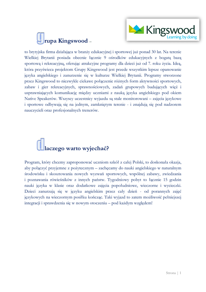 rupa Kingswood – to brytyjska firma działająca w branży edukacyjnej i sportowej już ponad 30 lat. Na terenie Wielkiej Brytanii posiada obecnie łącznie 9 ośrodków edukacyjnych z bogatą bazą sportową i rekreacyjną, oferując atrakcyjne programy dla dzieci już od 7. roku życia. Ideą, która przyświeca projektom Grupy Kingswood jest przede wszystkim lepsze opanowanie języka angielskiego i zanurzenie się w kulturze Wielkiej Brytanii. Programy stworzone przez Kingswood to niezwykle ciekawe połączenie różnych form aktywności sportowych, zabaw i gier rekreacyjnych, sprawnościowych, zadań grupowych budujących więź i usprawniających komunikację między uczniami z nauką języka angielskiego pod okiem Native Speakerów. Wszyscy uczestnicy wyjazdu są stale monitorowani – zajęcia językowe i sportowe odbywają się na jednym, zamkniętym terenie - i znajdują się pod nadzorem nauczycieli oraz profesjonalnych trenerów. laczego warto wyjechać? Program, który chcemy zaproponować uczniom szkół z całej Polski, to doskonała okazja, aby połączyć przyjemne z pożytecznym – zachęcamy do nauki angielskiego w naturalnym środowisku i skosztowania nowych wyzwań sportowych, wspólnej zabawy, zwiedzania i poznawania rówieśników z innych państw. Tygodniowy pobyt to łącznie 15 godzin nauki języka w klasie oraz dodatkowe zajęcia popołudniowe, wieczorne i wycieczki. Dzieci zanurzają się w języku angielskim przez cały dzień - od porannych zajęć językowych na wieczornym posiłku kończąc. Taki wyjazd to zatem możliwość pełniejszej integracji i sprawdzenia się w nowym otoczeniu – pod każdym względem! Strona | 1 Z przyjemnością informujemy o korzystnych zmianach, które z nowym rokiem wprowadzone zostaną we wszystkich centrach edukacyjnych Grupy Kingswood. - nowi nauczyciele - nową kadrę prowadzącą zajęcia językowe stanowić będą nauczyciele zewnętrzni, z odpowiednimi kwalifikacjami uprawniającymi do nauczania języka angielskiego jako obcego, co z pewnością przyczyni się do zwiększenia efektywności nauki, zwiększenia atrakcyjności zajęć i szybszego progresu językowego wśród uczniów. Chwaleni za profesjonalne podejście i dbałość o bezpieczeństwo uczestników instruktorzy sportowi pozostają nadal we współpracy z Kingswood. - program wycieczek - dodatkowa półdniowa wycieczka edukacyjna będzie w planie każdego pobytu tygodniowego (oprócz standardowej wycieczki całodniowej); grupom towarzyszyć będzie profesjonalny przewodnik zewnętrzny lub przeszkoleni pracownicy Kingswood, aby wycieczki stały się jeszcze bardziej atrakcyjne i wartościowe dla uczestników - akredytacje - Kingswood stara się o akredytację ważnej instytucji angielskiej British Council, której regularne inspekcje zapewniają wysoki poziom zakwaterowania oraz programów sportowych, przede wszystkim jednak oceniają ośrodki pod kątem programów edukacyjno-językowych i kontrolują standardy nauczania; dzięki uzyskanej akredytacji Kingswood będzie mogło zaoferować jeszcze lepsze usługi wszystkim swoim klientom Dodatkowo, jak podczas pierwszego wyjazdu w bieżącym roku, Project Travel proponuje zajęcia wieczorne prowadzone przez swoich animatorów, które wzbogacą program o integracyjne gry, zabawy i projekty grupowe dla dzieci oraz ułatwią zacieśnienie więzów miedzy opiekunami. Strona | 2 Centrum Grosvenor Hall niedaleko Londynu, zostało udostępnione dla studentów z całego świata w marcu 2010 roku. Powstało na ponad 20 hektarach terenu, który wcześniej służył jako ośrodek treningowy policji brytyjskiej – łatwo zatem sobie wyobrazić niesamowite możliwości zagospodarowania czasu wolnego. Na terenie kampusu znajdują się wszystkie budynki, z których uczniowie korzystają podczas pobytu: pokoje, sale do zajęć z angielskiego, stołówka, a także sale ćwiczeń, pokoje gier i zabaw oraz basen, korty, boiska i jeden z największych parków linowych w Europie. To właśnie mnogość możliwości aktywnego wypoczynku podoba się odwiedzającym najbardziej - w Grosvenor Hall jest ok. 60 dyscyplin i form aktywności! Dostępne formy aktywności, to m.in.: zjazdy linowe, wspinaczki po linach, skoki z wysokości (wszystkie tego typu formy sportowe realizowane są w pełnym zabezpieczeniu i w obecności instruktora) ćwiczenia na równowagę na wysokości, ścianki wspinaczkowe szermierka, quady, gry i zabawy na basenie laser zone – zabawy drużynowe w hali lub na zewnątrz tradycyjne sporty, jak siatkówka, piłka nożna, ale także frisbee, zadania logiczne, rywalizacje drużyn w Mini-Olimpiadzie, taniec na matach z użyciem konsoli karaoke, Mam Talent, quizy i konkursy indywidualne i grupowe, bingo rozprawa sądowa – zajęcia w specjalnie przygotowanej sali rozpraw wspólne ognisko, tańcem i zabawami wspólna dyskoteka i wiele innych atrakcji, które dopasowane są do wieku oraz poziomu uczestników. Strona | 3 tygodniowy pobyt (8 dni/7 nocy) w wybranym przez grupę w okresie w marcu/kwietniu 2015 460 £ Program językowy English in Action - 20 lekcji języka angielskiego z Native Speakerami (20 x 45 minut) Całodniowe zajęcia sportowo-edukacyjne – 3 różne formy aktywności dziennie Pełne wyżywienie (3 posiłki dziennie – lunch i kolacja to posiłki ciepłe w formie bufetu) Zakwaterowanie w pokojach wieloosobowych Wieczory integracyjne organizowane przez Kingswood oraz animatorów Project Travel Gry, zabawy, projekty językowe Zadania sprawnościowe drużynowe i indywidualne 1 wycieczka całodniowa do Londynu połączona ze zwiedzaniem (z przewodnikiem) 1 wycieczka półdniowa do Canterbury połączona ze zwiedzaniem 1 miejsce dla opiekuna na 10 uczestników + udział we wszystkich zajęciach organizowanych dla uczestników (program sportowy + wycieczki) Cena nie zawiera przelotu na miejsce oraz transferu z/na lotnisko w przypadku lotu samolotem, a także ubezpieczenia na czas wyjazdu (obowiązkowe