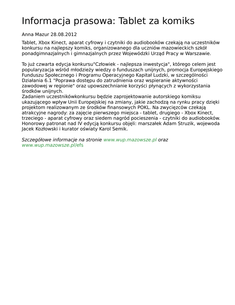 Informacja prasowa: Tablet za komiks Anna Mazur 28.08.2012 Tablet, Xbox Kinect, aparat cyfrowy i czytniki do audiobooków czekają na uczestników konkursu na najlepszy komiks, organizowanego dla uczniów mazowieckich szkół ponadgimnazjalnych i gimnazjalnych przez Wojewódzki Urząd Pracy w Warszawie. To już czwarta edycja konkursu"Człowiek - najlepsza inwestycja", którego celem jest popularyzacja wśród młodzieży wiedzy o funduszach unijnych, promocja Europejskiego Funduszu Społecznego i Programu Operacyjnego Kapitał Ludzki, w szczególności Działania 6.1 "Poprawa dostępu do zatrudnienia oraz wspieranie aktywności zawodowej w regionie" oraz upowszechnianie korzyści płynących z wykorzystania środków unijnych. Zadaniem uczestnikówkonkursu będzie zaprojektowanie autorskiego komiksu ukazującego wpływ Unii Europejskiej na zmiany, jakie zachodzą na rynku pracy dzięki projektom realizowanym ze środków finansowych POKL. Na zwycięzców czekają atrakcyjne nagrody: za zajęcie pierwszego miejsca - tablet, drugiego - Xbox Kinect, trzeciego - aparat cyfrowy oraz siedem nagród pocieszenia - czytniki do audiobooków. Honorowy patronat nad IV edycją konkursu objęli: marszałek Adam Struzik, wojewoda Jacek Kozłowski i kurator oświaty Karol Semik. Szczegółowe informacje na stronie www.wup.mazowsze.pl oraz www.wup.mazowsze.pl/efs