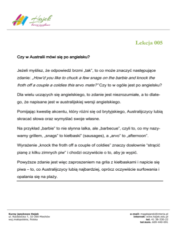 Lekcja 005 Czy w Australii mówi się po angielsku? Jeżeli myślisz, że odpowiedź brzmi „tak”, to co może znaczyć następujące zdanie: „How’d you like to chuck a few snags on the barbie and knock the froth off a couple a coldies this arvo mate?” Czy to w ogóle jest po angielsku? Dla wielu uczących się angielskiego, to zdanie jest niezrozumiałe, a to dlatego, że napisane jest w australijskiej wersji angielskiego. Pomijając kwestię akcentu, który różni się od brytyjskiego, Australijczycy lubią skracać słowa oraz wymyślać swoje własne. Na przykład „barbie” to nie słynna lalka, ale „barbecue”, czyli to, co my nazywamy grillem, „snags” to kiełbaski” (sausages), a „arvo” to „afternoon”. Wyrażenie „knock the froth off a couple of coldies” znaczy dosłownie “strącić pianę z kilku zimnych piw” i chodzi oczywiście o to, aby je wypić. Powyższe zdanie jest więc zaproszeniem na grila z kiełbaskami i napicie się piwa – to, co Australijczycy lubią najbardziej, oprócz oczywiście surfowania i opalania się na plaży. Kursy językowe Hajek ul. Racławicka 7, 32-200 Miechów woj.małopolskie, Polska e-mail: [email protected] internet: www.hajek.edu.pl tel. 41 38-330-22 tel.kom. 609-440-091 Lekcja 005 Każdy kraj, w którym mówi się oficjalnie po angielsku ma swoje specyficzne „klimaty językowe” – inne słowa, inny akcent, czasem te same słowa mają inne znaczenie. Poniżej znajdziecie listę kilku innych słów lub zwrotów używanych w australijskim angielskim wraz z ich odpowiednikami w standardowym angielskim: Amber fluid : Aussie : Beaut, beauty : To have a Blue : Bodgy : Bonzer : Cark it : Chocka : Click : beer Australian great, fantastic to have an argument poor quality great to die, stop working full up kilometre - "it's 20 clicks away" Cost big bikkies : expensive Dead set : the truth Dinky-di : the real thing, genuine Fair dinkum : true, genuine G'Day : hello! Good onya : well done Grouse : great, terrific It's gone walkabout : it's lost, can't be found Kangaroos loose in the top paddock : Intellectually inadequate Rack off : get lost! get out of here! Kursy językowe Hajek ul. Racławicka 7, 32-200 Miechów woj.małopolskie, Polska e-mail: [email protected] internet: www.hajek.edu.pl tel. 41 38-330-22 tel.kom. 609-440-091 Lekcja 005 Ridgy-didge : Rooted : She'll be right : Strewth : Hit the turps: Kursy językowe Hajek ul. Racławicka 7, 32-200 Miechów woj.małopolskie, Polska original, genuine ruined, broken it'll be okay exclamation go for a beer e-mail: [email protected] internet: www.hajek.edu.pl tel. 41 38-330-22 tel.kom. 609-440-091