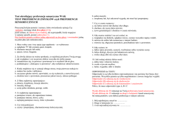 Test określający preferencje sensoryczne WAK TEST PREFERENCJI ZMYSŁÓW czyli PREFERENCJI SENSORYCZNYCH Przeczytaj kolejno pytania i zaznacz, które stwierdzenie opisuję Cię: najlepiej, stawiając obok dwa plusy (++); jeżeli uznasz, że zdarza się to rzadziej, ale są przypadki, kiedy reagujesz w opisany sposób, postaw jeden plus (+). Przy każdym pytaniu wybierz jedną odpowiedź na dwa plusy i ewentualnie jedną na jeden plus (ale niekoniecznie). 1. Masz wolny czas i trzy opcje jego spędzenia – co wybierzesz: a. oglądanie TV lub czytanie gazet, książek; b. słuchanie muzyki lub radia; c. spacer, rower, bieganie. 2. Za chwilę idziesz na ważne spotkanie, co najsilniej przykuwa Twoją uwagę: a. jak wyglądasz i czy na pewno dobrze wszystko do siebie pasuje; b. zastanawiasz się, co powiesz i powtarzasz to w myślach lub na głos; c. podskakujesz i „boksujesz w powietrzu”, aby rozładować zdenerwowanie. 3. Kiedy znajdziesz się w sytuacji silnego stresu, twoja pierwsza reakcja to: a. siadasz bez ruchu i milkniesz; b. zaczynasz głośno mówić, opowiadać, co się wydarzyło, a nawet krzyczeć; c. chodzisz tam i z powrotem, przesuwasz jakieś rzeczy, idziesz pobiegać. 4. Z filmu najłatwiej zapamiętujesz: a. plenery, krajobrazy, kreacje aktorów; b. muzykę, dialogi; c. sceny pełne działania, pościgi, walki. 5. Co najłatwiej zapamiętujesz: a. pamiętasz twarze, ale zapominasz imiona; b. pamiętasz imiona, słowa, cyfry; c. najlepiej pamiętasz rzeczy, które wykonałeś. 6. Czy twój pokój jest: a. czysty i posprzątany, zharmonizowany kolorystycznie; b. pełen muzyki; c. urządzony tak, byś odczuwał wygodę, nie musi być posprzątany. 7. Czy w czasie rozmowy: a. nie lubisz mówić lub słuchać zbyt długo; b. słuchasz, ale raczej dużo mówisz; c. żywo gestykulujesz i chodzisz w czasie mówienia. 8. Gdy musisz siedzieć i na coś czekać, to: a. rozglądasz się dookoła, oglądasz rzeczy, czytasz wszystkie napisy wokół; b. mówisz do siebie lub rozmawiasz z innymi ludźmi; c. wiercisz się, obgryzasz paznokcie, przechadzasz tam i z powrotem. 9. Gdy czytasz, to: a. lubisz opisy przyrody, scenerii, wyobrażasz sobie wyraźnie sceny; b. lubisz dialogi, słyszysz jak bohaterowie mówią; c. wolisz akcję albo nie czytasz zbyt dużo. 10. Jaki rodzaj odzieży lubisz nosić: a. dobry krój i właściwe kolory; b. wcale o tym nie myślisz; c. luźne, wygodne, miłe w dotyku ODPOWIEDZI do TESTU Odpowiedzi te są tylko krótkim wprowadzeniem i nie powinny być brane zbyt poważnie. Wszystkie pytania są tylko uogólnieniem i zawsze mogą być wyjątki. Odpowiedzi (A) odnoszą się do wzrokowców Odpowiedzi (B) odnoszą się do słuchowców Odpowiedzi (C) odnoszą się do kinestetyków i czuciowców Policz, ile masz odpowiedzi typu A, B i C Wynik zbliżony do 20 wskazuje na Twój preferowany kanał sensoryczny. Wynik zbliżony do 10 wskazuje na drugi w kolejności kanał sensoryczny. Im mniej punktów, tym słabsza preferencja w danym zakresie 1. Mój najsilniejszy zmysł to: ………….. 2. Drugi w kolejności to: ……………. 3. A ten najrzadziej używany to: ……………