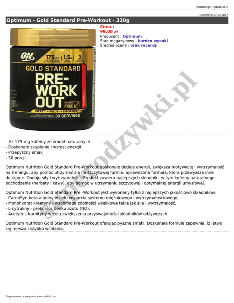 Informacje o produkcie Utworzono 07-03-2017 Optimum - Gold Standard Pre-Workout - 330g Cena : 99,00 zł ro dz y w ki .p l Producent : Optimum Stan magazynowy : bardzo wysoki Średnia ocena : brak recenzji Aż 175 mg kofeiny ze źródeł naturalnych - Doskonałe skupienie i wzrost energii - Przepyszny smak - 30 porcji - pe Optimum Nutrition Gold Standard Pre-Workout doskonale dodaje energii, zwiększa motywację i wytrzymałość na treningu, aby pomóc utrzymać się na szczytowej formie. Sprawdzona formuła, która przewyższa inne dostępne. Dodaje siły i wytrzymałości. Produkt zawiera najlepszych składniki, w tym kofeiny naturalnego pochodzenia (herbaty i kawy), aby pomóc w utrzymaniu szczytowej i optymalnej energii umysłowej. su Optimum Nutrition Gold Standard Pre -Workout jest wykonany tylko z najlepszych jakościowo składników: - CarnoSyn beta-alaniny w celu wsparcia systemu mięśniowego i wytrzymałościowego, - Monohydrat kreatyny - wspomaga zdolności wysiłkowe takie jak siła i wytrzymałość, - L-cytruliny - prekursor tlenku azotu (NO), - Acetylo-L-karnityny w celu zwiększenia przyswajalności składników odżywczych. Optimum Nutrition Gold Standard Pre-Workout oferując pyszne smaki. Doskonała formuła zapewnia, iż łatwo się miesza i szybko wchłania. Wygenerowano w programie www.oscGold.com
