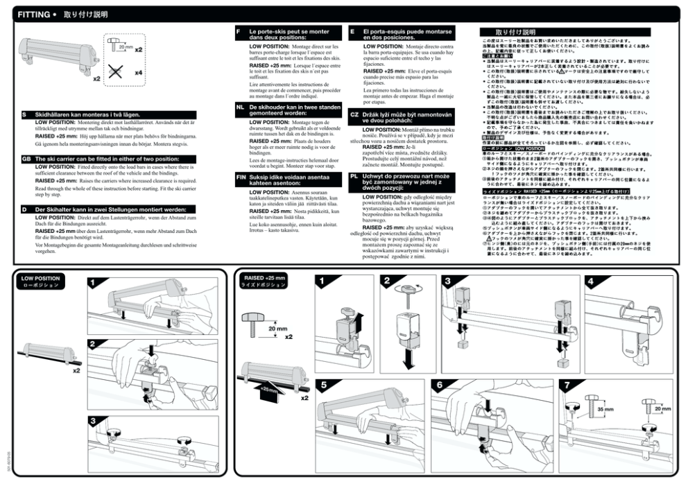 FITTING • F 20 mm x2 x4 x2 S Skidhållaren kan monteras i två lägen. LOW POSITION: Montering direkt mot lasthållarröret. Används när det är tillräckligt med utrymme mellan tak och bindningar. RAISED +25 mm: Höj upp hållarna när mer plats behövs för bindningarna. Gå igenom hela monteringsanvisningen innan du börjar. Montera stegvis. GB The ski carrier can be fitted in either of two position: LOW POSITION: Fitted directly onto the load bars in cases where there is sufficient clearance between the roof of the vehicle and the bindings. RAISED +25 mm: Raises the carriers where increased clearance is required. Read through the whole of these instruction before starting. Fit the ski carrier step by step. D Der Skihalter kann in zwei Stellungen montiert werden: LOW POSITION: Direkt auf dem Lastenträgerrohr wenn der Abstand zum Dach für die Bindungen ausreicht. RAISED +25 mm über dem Lastenträgerrohr wenn mehr Abstand zum Dach für die Bindungen benötigt wird. Vor Montagebeginn die gesamte Montageanleitung durchlesen und schrittweise vorgehen. LOW POSITION 1 Le porte-skis peut se monter dans deux positions: LOW POSITION: Montage direct sur les barres porte-charge lorsque l´espace est suffisant entre le toit et les fixations des skis. RAISED +25 mm: Lorsque l´espace entre le toit et les fixation des skis n´est pas suffisant. Lire attentivemente les instructions de montage avant de commencer, puis procéder au montage dans l´ordre indiqué. NL De skihouder kan in twee standen gemonteerd worden: LOW POSITION: Montage tegen de dwarsstang. Wordt gebruikt als er voldoende ruimte tussen het dak en de bindingen is. RAISED +25 mm: Plaats de houders hoger als er meer ruimte nodig is voor de bindingen. Lees de montage-instructies helemaal door voordat u begint. Monteer stap voor stap. FIN Suksip idike voidaan asentaa kahteen asentoon: LOW POSITION: Asennus souraan taakkatelineputkea vasten. Käytetään kun katon ja siteiden väliin jää riittävästi tilaa. RAISED +25 mm: Nosta pidikkeitä kun siteille tarvitaan lisää tilaa. Lue koko asennusohje ennen kuin aloitat. Irrotus kasto takasivu. RAISED +25 mm 1 E El porta-esquis puede montarse en dos posiciones. LOW POSITION: Montaje directo contra la barra porta-equipajes. Se usa cuando hay espacio suficiente entre el techo y las fijaciones. RAISED +25 mm: Eleve el porta-esquís cuando precise más espasio para las fijaciones. Lea primero todas las instrucciones de montaje antes de empezar. Haga el montaje por etapas. CZ Držák lyží může být namontován ve dvou polohách: LOW POSITION: Montáž přímo na trubku nosiče. Používá se v případě, kdy je mezi střechou vozu a nosičem dostatek prostoru. RAISED +25 mm: Je-li zapotřebí více místa, zvedněte držáky. Prostudujte celý montážní návod, než začnete montáž. Montujte postupně. PL Uchwyt do przewozu nart może być zamontowany w jednej z dwóch pozycji: LOW POSITION: gdy odległość między powierzchnią dachu a wiązaniami nart jest wystarczająca, uchwyt montuje się bezpośrednio na belkach bagażnika bazowego. RAISED +25 mm: aby uzyskać większą odległość od powierzchni dachu, uchwyt mocuje się w pozycji górnej. Przed montażem proszę zapoznać się ze wskazówkami zawartymi w instrukcji i postępować zgodnie z nimi. 2 3 4 20 mm x2 2 x2 +25 m 5 m 6 7 x2 35 mm 501-6079-05 3 20 mm REMOVING • S Demontering av skidhållaren! GB Dismounting the ski carrier! D Abnehmen des Skihalters! F Démontage du porte-skis! NL Demontage van de skihouder! FIN Suksipidikkeen irrotus! E ¡Desmontaje del porta-esquis! CZ Demontáž nosiče lyží! PL Demontaż bagażnika do nart! ONE KEY SYSTEM 1 544 596 588 N N N N N N N N N N N N N N N N N N Nu kan du få en och samma nyckel till nästan alla dina låsbara Thuleprodukter. Med vårt nya smarta låssystem, Thule One Key System, låser du t.ex. lasthållaren, skidhållaren och cykelhållaren med en och samma nyckel. Enkelt och bekvämt. 2 S S GB D F NL FIN E CZ PL Monteringsanvisning Fitting instructions Montageanleitung Instructions de montage Montage-instructies Asennusohje Instrucciones de montaje Návod na montáž Instrukcja montażu I Se la vostra lingua non č compresa nelle istruzioni, prendete contatto conil rivenditore per informazioni. PT Caso sua língua não esteja nas instruções, contate a loja para informações. RU Если в инструкции нет Вашего языка, обращайтесь за получением информации в магазин. GB Now you can use one and the same key for almost all Thule lockable products. Our new Thule One Key System means you can lock your load carrier, ski carrier and bike carrier, all with the same key. What could be simpler or more convenient? KR Jetzt genügt ein einziger Schlüssel für fast alle abschließbaren Thule-Produkte. Mit dem neuen Sicherungssystem von Thule können Sie mit nur einem Schlüssel Lastenträger, Fahrrad-, Skihalter und Dachbox(en) abschließen. Einfach und bequem. D Il vous suffit d'une seule et même clé pour verrouiller presque tous les produits Thule munis d'une serrure. Grâce à notre nouveau système ingénieux de verrouillage, le Thule One Key System, vous mettrez sous clé non seulement votre porte-charge, mais entre autres votre porte-skis et votre porte-bicyclettes. Avec une seule et même clé. Facile et commode. F HANDLING • NL Nu heeft u maar één sleutel nodig om nagenoeg al uw vergrendelbare Thule produkten te vergrendelen. Met ons nieuw intelligent vergrendelsysteem, het Thule One Key System vergrendelt u b.v. de allesdrager, de skihouder en de fietshouder met en dezelfde sleutel. Eenvoudig en comfortabel. FIN Nyt yksi ja sama avain käy lähes kaikkiin lukittaviin Thule-tuotteisiin. Uusi nerokas lukitusjärjestelmämme, Thule One Key System, lukitsee esim. Taakkatelineen, suksipidikkeen ja polkupyöräpidikkeen samalla avaimella. Helposti ja mukavasti. Ahora puede tener una sola llave par