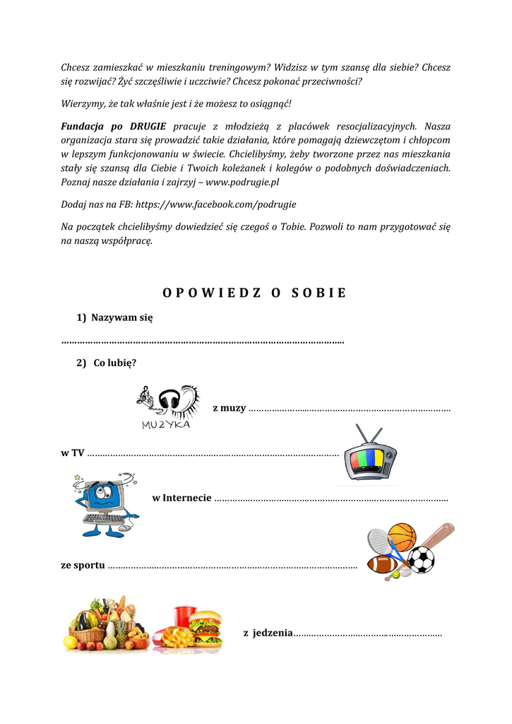 Chcesz zamieszkać w mieszkaniu treningowym? Widzisz w tym szansę dla siebie? Chcesz się rozwijać? Żyć szczęśliwie i uczciwie? Chcesz pokonać przeciwności? Wierzymy, że tak właśnie jest i że możesz to osiągnąć! Fundacja po DRUGIE pracuje z młodzieżą z placówek resocjalizacyjnych. Nasza organizacja stara się prowadzić takie działania, które pomagają dziewczętom i chłopcom w lepszym funkcjonowaniu w świecie. Chcielibyśmy, żeby tworzone przez nas mieszkania stały się szansą dla Ciebie i Twoich koleżanek i kolegów o podobnych doświadczeniach. Poznaj nasze działania i zajrzyj – www.podrugie.pl Dodaj nas na FB: https://www.facebook.com/podrugie Na początek chcielibyśmy dowiedzieć się czegoś o Tobie. Pozwoli to nam przygotować się na naszą współpracę. OPOWIEDZ O SOBIE 1) Nazywam się …………………………………………………………………………………………….. 2) Co lubię? z muzy …………………...………………………………………………. w TV ………………………………………………..…………………………………… w Internecie ……………………………….……………………………………………… ze sportu ……………………………………………………………………………………. z jedzenia……………………………….………………… jaka zabawa/rozrywka………………………………………………….. jakie książki …………………………………………..……………………… 3) Moje mocne strony to: …………………………………………………………………… …………………………………………………………........... ………………………………………………………………….. …………………………………………………………………. ………………………………………………………………….. …………………………………………………………………… …………………………………………………………........... ………………………………………………………………….. …………………………………………………………………. ………………………………………………………………….. 4) W trudnych chwila najbardziej pomaga mi ……………………………………………………………………………………………………… …...........…………………………………………………………………..………………………… ……………………………………………………………………………………………………...... .....…………………………………………………………………..……………………………… ………………………………………………………………………… 5) Moje plany na pierwszy rok po opuszczeniu placówki? ………………………………………………………………………................................. …………………………………………………………...........………………………………… ………………………………..………………………………………………………………….. ………………………………………………………………….………………………………… ………………………………..………………………………………………………………….. ………………………………………………………………………................................. …………………………………………………………...........………………………………… ………………………………..…………………………………………………………………..………………………… ……………………………………….…………………………………………………………………..…………………… …………………………………………….. 6) Co muszę zrobić, żeby zrealizować moje plany? ………………………………………………………………………………………… ……………………………………...........…………………………………………… ……………………..…………………………………………………………………… …………………………………………………………...........……………………… …………………………………………..……………………………………………… ………………………………………………………………………………………… ……………………………………...........…………………………………………… ……………………..………………………………………………………………………………………………………… ……………………...........…………………………………………………………………..……………………………… ……………… 7) Co mogłoby mi przeszkodzić w realizacji tych planów? …………………………………………………………………………………………………… …………………………...........……………………………………………………………… …..……………………………………………………………………………………………… ………………………………...........………………………………………………………… ………..………………………………………………………………………………………… 8) O jakiej przyszłości marzę? 