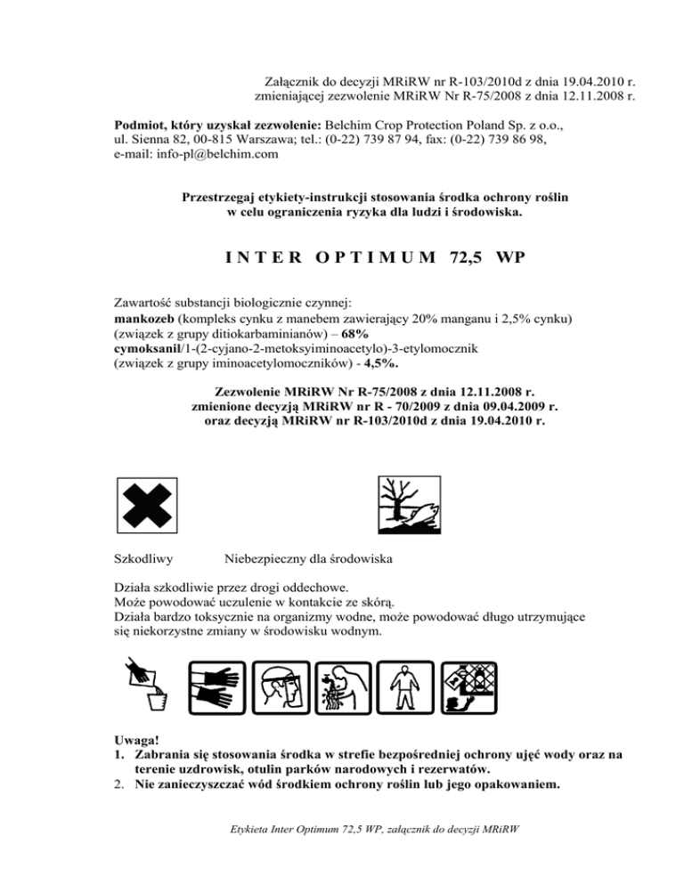 Załącznik do decyzji MRiRW nr R-103/2010d z dnia 19.04.2010 r. zmieniającej zezwolenie MRiRW Nr R-75/2008 z dnia 12.11.2008 r. Podmiot, który uzyskał zezwolenie: Belchim Crop Protection Poland Sp. z o.o., ul. Sienna 82, 00-815 Warszawa; tel.: (0-22) 739 87 94, fax: (0-22) 739 86 98, e-mail: [email protected] Przestrzegaj etykiety-instrukcji stosowania środka ochrony roślin w celu ograniczenia ryzyka dla ludzi i środowiska. I N T E R O P T I M U M 72,5 WP Zawartość substancji biologicznie czynnej: mankozeb (kompleks cynku z manebem zawierający 20% manganu i 2,5% cynku) (związek z grupy ditiokarbaminianów) – 68% cymoksanil/1-(2-cyjano-2-metoksyiminoacetylo)-3-etylomocznik (związek z grupy iminoacetylomoczników) - 4,5%. Zezwolenie MRiRW Nr R-75/2008 z dnia 12.11.2008 r. zmienione decyzją MRiRW nr R - 70/2009 z dnia 09.04.2009 r. oraz decyzją MRiRW nr R-103/2010d z dnia 19.04.2010 r. Szkodliwy Niebezpieczny dla środowiska Działa szkodliwie przez drogi oddechowe. Może powodować uczulenie w kontakcie ze skórą. Działa bardzo toksycznie na organizmy wodne, może powodować długo utrzymujące się niekorzystne zmiany w środowisku wodnym. Uwaga! 1. Zabrania się stosowania środka w strefie bezpośredniej ochrony ujęć wody oraz na terenie uzdrowisk, otulin parków narodowych i rezerwatów. 2. Nie zanieczyszczać wód środkiem ochrony roślin lub jego opakowaniem. Etykieta Inter Optimum 72,5 WP, załącznik do decyzji MRiRW I OPIS DZIAŁANIA Inter Optimum 72,5 WP jest środkiem grzybobójczym w formie proszku do sporządzania zawiesiny wodnej o działaniu wgłębnym i kontaktowym do stosowania zapobiegawczego i interwencyjnego w ochronie ziemniaka przed zarazą ziemniaka. II ZAKRES STOSOWANIA, TERMINY I DAWKI Środek stosować w zalecanej dawce nie więcej niż 4 razy w sezonie wegetacyjnym. ROŚLINY ROLNICZE ZIEMNIAK zaraza ziemniaka Zalecana dawka: 2 kg/ha. Zalecana ilość wody: 200-400 l/ha. Zalecane opryskiwanie: drobnokropliste. Większą ilość wody stosować w uprawach zagęszczonych lub o silnie rozwiniętej naci ziemniaczanej. Pierwszy zabieg wykonywać zgodnie z sygnalizacją lub: na odmianach wczesnych - w okresie zwierania się roślin w międzyrzędziach, na odmianach późnych - z chwilą wystąpienia pierwszych objawów choroby w danym rejonie na odmianach wczesnych. Po wykonaniu pierwszego zabiegu środkiem o działaniu układowym lub środkiem Inter-Optimum72,5 WP, następne zabiegi wykonywać w miarę potrzeby co 7-14 dni. Krótszy odstęp między zabiegami co 7-10 dni zachowywać w warunkach większego zagrożenia chorobą oraz na odmianach podatnych na zarazę ziemniaka. III OKRES KARENCJI okres od dnia ostatniego zabiegu do dnia zbioru i przeznaczenia do konsumpcji ZIEMNIAKI – 11 DNI IV OKRES PREWENCJI DLA PSZCZÓŁ, LUDZI I ZWIERZĄT okres zapobiegający zatruciu NIE DOTYCZY 2 Etykieta Inter Optimum 72,5 WP, załącznik do decyzji MRiRW V SPORZĄDZANIE CIECZY UŻYTKOWEJ Przed przystąpieniem do sporządzania cieczy użytkowej dokładnie ustalić potrzebną jej ilość. Odważoną ilość środka wymieszać w osobnym naczyniu z małą ilością wody, następnie wlać przez sito do zbiornika opryskiwacza napełnionego częściowo wodą (z włączonym mieszadłem) i uzupełnić wodą do potrzebnej ilości. Po wlaniu cieczy użytkowej do zbiornika opryskiwacza nie wyposażonego w mieszadło hydrauliczne ciecz mechaniczne wymieszać. Opryskiwać z włączonym mieszadłem. Opróżnione opakowania po środku przepłukać trzykrotnie wodą, a popłuczyny wlać do zbiornika opryskiwacza z cieczą użytkową. Po pracy aparaturę dokładnie wymyć. VI PRZECHOWYWANIE Przechowywać wyłącznie w oryginalnych szczelnie zamkniętych opakowaniach, w dobrze wentylowanych miejscach, w temperaturze nie niższej niż 0oC i nie wyższej niż 30oC, z dala od źródeł ciepła. Nie przechowywać w pobliżu kwasów. Chronić przed dziećmi. Nie przechowywać razem z żywnością, napojami i paszami dla zwierząt. VII WARUNKI BEZPIECZNEGO STOSOWANIA ŚRODKA – Nie jeść i nie pić oraz nie palić tytoniu podczas stosowania produktu. – Unikać zanieczyszczenia skóry. – Nosić odpowiednią odzież ochronną, odpowiednie rękawice ochronne i okulary lub ochronę twarzy. – W razie połknięcia niezwłocznie zasięgnij porady lekarza pokaż opakowanie lub etykietę. – Środek i opakowanie usuwać jako odpad niebezpieczny. – W przypadku zatrucia drogą oddechową wyprowadzić lub wynieść poszkodowanego na – świeże powietrze i zapewnić warunki do odpoczynku. – Opróżnione opakowania po środku zwrócić do sprzedawcy, u którego środek został zakupiony. – Zabrania się spalania opakowań po środku ochrony roślin we własnym zakresie. – Resztki cieczy użytkowej rozcieńczyć wodą i wypryskać na powierzchni poprzednio opryskanej. Wodę użytą do mycia aparatury wypryskać na powierzchni poprzednio opryskanej, stosując te same środki ochrony osobistej. UWAGA Etykieta Inter Optimum 72,5 WP, załącznik do decyzji MRiRW 3 ZABRANIA SIĘ WYKORZYSTYWANIA OPRÓŻNIONYCH OPAKOWAŃ PO ŚRODKACH OCHRONY ROŚLIN DO INNYCH CELÓW, W TYM TAKŻE TRAKTOWANIA ICH JAKO SUROWCE WTÓRNE. VIII ANTIDOTUM BRAK, STOSOWAĆ LECZENIE OBJAWOWE. IX POMOC MEDYCZNA W zaistniałych sytuacjach, kiedy wymagana jest lub konieczna inna pomoc medyczna niż ujęta w wyżej wymienionych ostrzeżeniach skontaktować się z najbliższym ośrodkiem toksykologicznym: Gdańsk – (0-58) 682 04 04 Rzeszów – (0-17) 866 40 25 Kraków – (0-12) 411 99 99 Sosnowiec – (0-32) 266 11 45 Lublin – (0-81) 740 89 83 Tarnów – (0-14) 631 54 09 Łódź – (0-42) 657 99 00 Warszawa – (0-22) 619 66 54 Poznań – (0-61) 847 69 46 Wrocław – (0-71) 343 30 08 Okres ważności - 2 lata Data produkcji - ........ Zawartość netto - ........ Nr partii - ........ 4 Etykieta Inter Optimum 72,5 WP, załącznik do decyzji MRiRW
