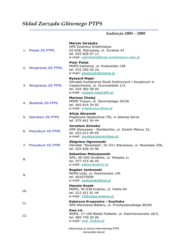 Skład Zarządu Głównego PTPS kadencja 2005 - 2008 1. Prezes ZG PTPS, Maryla Jarzęcka OPS Dzielnicy Śródmieście 02-638, Warszawa, ul. Żurawia 43 tel. 022 628 07 12 e-mail: [email protected] 2. Wiceprezes ZG PTPS, Piotr Polok MOPS Katowice, ul. Krakowska 138 tel. 032 250 50 16 e-mail: [email protected] 3. Wiceprezes ZG PTPS Ryszard Majer Ośrodek Kształcenia Służb Publicznych i Socjalnych w Częstochowie, ul. Grunwaldzka 1/3. tel. 034 365 58 04 e-mail: [email protected] 4. Skarbnik ZG PTPS Mariusz Chołuj MOPS Tuszyn, ul. Żeromskiego 24/26 tel. 042 614 34 92 e-mail: [email protected] 5. Sekretarz ZG PTPS Alicja Abramek Pogotowie Opiekuńcze TIS, w Jeleniej Górze tel. 075 641 54 44 6. Prezydium ZG PTPS Jarosław Gnioska OPS Warszawa - Rembertów, ul. Dwóch Mieczy 22, tel. 022 612 94 65 e-mail: [email protected] 7. Prezydium ZG PTPS Zbigniew Ogonowski Ośrodek "Nowolipie", 01-011 Warszawa, ul. Nowolipie 25b, tel. 022 838 34 96 8. Sebastian Matuszewski OPS, 49-200 Grodków, ul. Wiejska 1c tel. 077 415 46 44 e-mail: [email protected] 9. Bogdan Jankowski MOPS Łódź, ul. Piotrkowska 149 tel. 601075658 e-mail: [email protected] 10. Danuta Kosek MOPS, 30-038 Kraków, ul. Dietla 64 tel. 012 421 61 44 e-mail: [email protected] 11. Katarzna Krupowicz - Kuzińska OPS Warszawa Bielany, ul. Przybyszewskiego 80/82 12. Ewa Lis MOPS, 17-100 Bielsk Podlaski, ul. Kazimierzowska 18/3, tel. 085 730 20 06 e-mail: [email protected] Informacja ze strony internetowej PTPS www.ptps.ops.pl Nr konta bankowego ZG PTPS: Bank PKO BP S.A. 88 1020 1013 0000 0702 0003 2698 Główna Komisja Rewizyjna Halina Hanczaruk MOPR Białystok, tel. 087 644 54 30 Paweł Jamroż OPS Warszawa Wawer, ul. Korkowa 119/124 Bogdan Kotlicki MOPS Łódź - Śródmieście, ul. Piotrkowska 149 Teresa Rabenda MOPS Kamienna Góra, Al. Wojska Polskiego 1 Marzena Sedlaczek MOPR Opole, tel. 4535119 Główny Sąd Koleżeński Piotr Biernacki - przewodniczący Szpital Specjalistyczny im. J. Babińskiego w Krakowie, ul. Babińskiego 29. tel. 012 652 43 19 lub 012 652 43 17, 502283969 e-mail: [email protected] Marianna Artwik OPS Nysa, ul. Kościuszki 11 tel. 077 433 67 46 Krystyna Barczycka MOPS Legnica, ul. Poselska 13 tel. 076 722 18 00 Ingryda Bożek, MOPR Opole, ul. Barlickiego 1-3. e-mail: [email protected] Teresa Wilczyńska OPS Nysa, ul. Kościuszki 11 tel. 077 433 67 46 Anna Wiśniewska - Mucha OPS Warszawa Żoliborz, ul. Dembińskiego 3 tel. 022 833 64 24 Informacja ze strony internetowej PTPS www.ptps.ops.pl