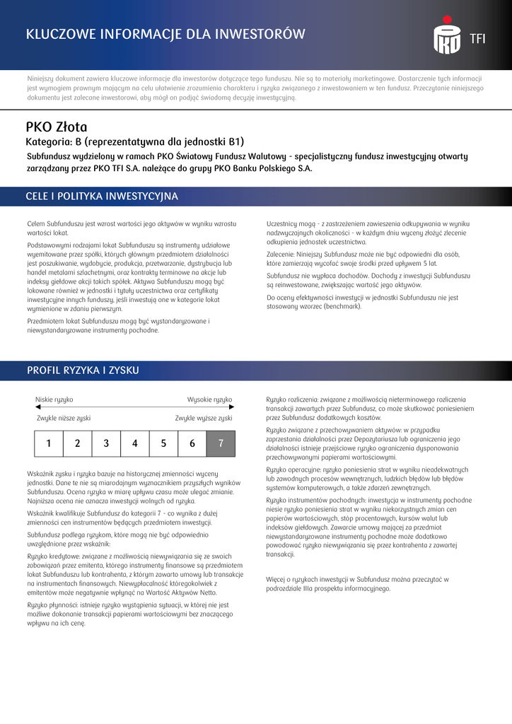 K` KLUCZOWE INFORMACJE DLA INWESTORÓW Niniejszy dokument zawiera kluczowe informacje dla inwestorów dotyczące tego funduszu. Nie są to materiały marketingowe. Dostarczenie tych informacji jest wymogiem prawnym mającym na celu ułatwienie zrozumienia charakteru i ryzyka związanego z inwestowaniem w ten fundusz. Przeczytanie niniejszego dokumentu jest zalecane inwestorowi, aby mógł on podjąć świadomą decyzję inwestycyjną. PKO Złota Kategoria: B (reprezentatywna dla jednostki B1) Subfundusz wydzielony w ramach PKO Światowy Fundusz Walutowy - specjalistyczny fundusz inwestycyjny otwarty zarządzany przez PKO TFI S.A. należące do grupy PKO Banku Polskiego S.A. CELE I POLITYKA INWESTYCYJNA Celem Subfunduszu jest wzrost wartości jego aktywów w wyniku wzrostu wartości lokat. Podstawowymi rodzajami lokat Subfunduszu są instrumenty udziałowe wyemitowane przez spółki, których głównym przedmiotem działalności jest poszukiwanie, wydobycie, produkcja, przetwarzanie, dystrybucja lub handel metalami szlachetnymi, oraz kontrakty terminowe na akcje lub indeksy giełdowe akcji takich spółek. Aktywa Subfunduszu mogą być lokowane również w jednostki i tytuły uczestnictwa oraz certyfikaty inwestycyjne innych funduszy, jeśli inwestują one w kategorie lokat wymienione w zdaniu pierwszym. Uczestnicy mogą - z zastrzeżeniem zawieszenia odkupywania w wyniku nadzwyczajnych okoliczności - w każdym dniu wyceny złożyć zlecenie odkupienia jednostek uczestnictwa. Zalecenie: Niniejszy Subfundusz może nie być odpowiedni dla osób, które zamierzają wycofać swoje środki przed upływem 5 lat. Subfundusz nie wypłaca dochodów. Dochody z inwestycji Subfunduszu są reinwestowane, zwiększając wartość jego aktywów. Do oceny efektywności inwestycji w jednostki Subfunduszu nie jest stosowany wzorzec (benchmark). Przedmiotem lokat Subfunduszu mogą być wystandaryzowane i niewystandaryzowane instrumenty pochodne. PROFIL RYZYKA I ZYSKU Niskie ryzyko Wysokie ryzyko Zwykle niższe zyski 1 2 Zwykle wyższe zyski 3 4 5 6 7 Wskaźnik zysku i ryzyka bazuje na historycznej zmienności wyceny jednostki. Dane te nie są miarodajnym wyznacznikiem przyszłych wyników Subfunduszu. Ocena ryzyka w miarę upływu czasu może ulegać zmianie. Najniższa ocena nie oznacza inwestycji wolnych od ryzyka. Wskaźnik kwalifikuje Subfundusz do kategorii 7 - co wynika z dużej zmienności cen instrumentów będących przedmiotem inwestycji. Subfundusz podlega ryzykom, które mogą nie być odpowiednio uwzględnione przez wskaźnik: Ryzyko kredytowe: związane z możliwością niewywiązania się ze swoich zobowiązań przez emitenta, którego instrumenty finansowe są przedmiotem lokat Subfunduszu lub kontrahenta, z którym zawarto umowy lub transakcje na instrumentach finansowych. Niewypłacalność któregokolwiek z emitentów może negatywnie wpłynąć na Wartość Aktywów Netto. Ryzyko płynności: istnieje ryzyko wystąpienia sytuacji, w której nie jest możliwe dokonanie transakcji papierami wartościowymi bez znaczącego wpływu na ich cenę. Ryzyko rozliczenia: związane z możliwością nieterminowego rozliczenia transakcji zawartych przez Subfundusz, co może skutkować poniesieniem przez Subfundusz dodatkowych kosztów. Ryzyko związane z przechowywaniem aktywów: w przypadku zaprzestania działalności przez Depozytariusza lub ograniczenia jego działalności istnieje przejściowe ryzyko ograniczenia dysponowania przechowywanymi papierami wartościowymi. Ryzyko operacyjne: ryzyko poniesienia strat w wyniku nieadekwatnych lub zawodnych procesów wewnętrznych, ludzkich błędów lub błędów systemów komputerowych, a także zdarzeń zewnętrznych. Ryzyko instrumentów pochodnych: inwestycja w instrumenty pochodne niesie ryzyko poniesienia strat w wyniku niekorzystnych zmian cen papierów wartościowych, stóp procentowych, kursów walut lub indeksów giełdowych. Zawarcie umowy mającej za przedmiot niewystandaryzowane instrumenty pochodne może dodatkowo powodować ryzyko niewywiązania się przez kontrahenta z zawartej transakcji. Więcej o ryzykach inwestycji w Subfundusz można przeczytać w podrozdziale IIIa prospektu informacyjnego. OPŁATY Opłaty ponoszone przez inwestora służą pokryciu kosztów działania Subfunduszu, w tym kosztów dystrybucji i wprowadzania jego jednostek do obrotu. Opłaty te zmniejszają potencjalny wzrost inwestycji. Jednorazowe opłaty pobierane przed zainwestowaniem lub po zainwestowaniu: Opłata za nabycie Wartość liczbowa opłat bieżących opiera się na kosztach z roku poprzedniego. W związku z tym wysokość opłat bieżących może co roku ulegać zmianie. Podana wartość opłat bieżących przedstawia koszty Subfunduszu w 2012 r. brak Opłata za odkupienie 1,50% Jest to maksymalna kwota, jaka może zostać pobrana z Państwa środków przed ich zainwestowaniem / przed wypłaceniem środków z inwestycji Opłata za nabycie i opłata za odkupienie są podawane w wysokości maksymalnej. W określonych przypadkach inwestor może ponosić niższe opłaty. Informacje o bieżącej wysokości opłat można uzyskać u Dystrybutora. Opłaty pobierane z Subfunduszu w ciągu roku: Opłaty bieżące 2,18% Więcej informacji na temat opłat można znaleźć w podrozdziale IIIa prospektu informacyjnego. Prospekt dostępny jest na stronie internetowej www.pkotfi.pl oraz u Dystrybutorów. Opłaty pobierane z Subfunduszu w określonych warunkach: Opłaty za wyniki brak WYNIKI OSIĄGNIĘTE W PRZESZŁOŚCI Subfundusz uruchomiono 3 listopada 2005 r. Roczne stopy zwrotu PKO Złota Wyniki historyczne nie stanowią gwarancji podobnych rezultatów inwestycji w przyszłości. Wyniki przedstawiono w PLN z uwzględnieniem kosztów ponoszonych przez Subfundusz. Kalkulacja nie obejmuje opłat za nabycie/odkupienie jednostek uczestnictwa oraz podatku od zysków kapitałowych. 20% 15% Z uwagi na brak pełnej historii, do kalkulacji i prezentacji wyników użyto danych 