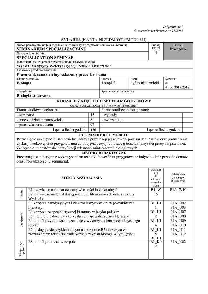 Załącznik nr 1 do zarządzenia Rektora nr 97/2012 SYLABUS (KARTA PRZEDMIOTU/MODUŁU) Nazwa przedmiotu/modułu (zgodna z zatwierdzonym programem studiów na kierunku) Punkty ECTS SEMINARIUM SPECJALIZACYJNE Numer katalogowy 4 Nazwa w j. angielskim SPECIALIZATION SEMINAR Jednostka(i) realizująca(e) przedmiot/moduł (instytut/katedra) Wydział Medycyny Weterynaryjnej i Nauk o Zwierzętach Kierownik przedmiotu/modułu Pracownik samodzielny wskazany przez Dziekana Kierunek studiów Stopień Profil Semestr Biologia 1 stopień ogólnoakademicki 6 Specjalność Specjalizacja magisterska 4 - od 2015/2016 Biologia stosowana RODZAJE ZAJĘĆ I ICH WYMIAR GODZINOWY (zajęcia zorganizowane i praca własna studenta) Forma studiów: stacjonarne seminaria inne z udziałem nauczyciela praca własna studenta Łączna liczba godzin: 15 8 97 120 Forma studiów: niestacjonarne wykłady ćwiczenia … Łączna liczba godzin: CEL PRZEDMIOTU/MODUŁU Rozwinięcie umiejętności samodzielnej pracy i prezentacji jej wyników podczas seminariów oraz prowadzenia dyskusji naukowej oraz przygotowania do podjęcia decyzji dotyczącej tematyki przyszłej pracy magisterskiej. Zachęcenie studentów do identyfikacji własnych zainteresowań biologicznych. METODY DYDAKTYCZNE Prezentacje seminaryjne z wykorzystaniem techniki PowerPoint przygotowane indywidualnie przez Studentów oraz Prowadzącego (2 seminaria). Kompetencje społeczne Umiejętności Wiedza EFEKTY KSZTAŁCENIA E1 ma wiedzę na temat ochrony własności intelektualnych E2 ma wiedzę na temat dostępnych baz literaturowych oraz struktury Wydziału E3 korzysta z tradycyjnych i elektronicznych źródeł w poszukiwaniu literatury E4 korzysta ze specjalistycznej literatury w języku polskim E5 interpretuje dane z wykorzystaniem specjalistycznej literatury E6 potrafi przygotować prezentację z wykorzystaniem specjalistycznego języka E7 posługuje się językiem obcym na poziomie B2 oraz czyta ze zrozumieniem teksty specjalistyczne z zakresu biologii w tym języku E8 potrafi pracować w zespole Odniesie nie do efektów kierunko wych Odniesienie do efektów obszarowych B1_W 15 P1A_W10 B1_U1 1 B1_U1 2 B1_U1 4 B1_U1 5 B1_U1 B1_K0 6 2 P1A_U02 P1A_U03 P1A_U07 P1A_U08 P1A_U09 P1A_U10 P1A_U11 P1A_U12 P1A_K02 Numery efektów Metody weryfikacji efektów kształcenia Ocena prezentacji podczas seminariów Ocena aktywności podczas dyskusji seminaryjnych E1- E8 E1, E2, E4, E6 TREŚCI KSZTAŁCENIA Prezentacja wybranych przez studentów artykułów popularno-naukowych, przeglądowych artykułów naukowych, oryginalnych prac twórczych, książek naukowych lub popularno-naukowych wyszukiwanych m.in. przy pomocy dostępnych baz danych (PubMed, Web of Knowledge, Scopus itp.). Tematami seminariów są: charakterystyka działalności naukowej katedr macierzystego Wydziału, prezentacja wybranego przez studenta artykułu naukowego pracownika Wydziału, opis planowanej tematyki pracy magisterskiej, prezentacja oryginalnej pracy twórczej, której autorem jest pracownik macierzystego Wydziału. Formy i kryteria zaliczenia przedmiotu/modułu Prezentacje własne podczas seminariów Czynny udział w seminariach Procentowy udział w końcowej ocenie 80% 20% WYKAZ LITERATURY Czasopisma naukowe i popularno-naukowe: Kosmos Wszechświat Postępy Biologii Komórki Postępy Biochemii Postępy Mikrobiologii BioTechnologia Bazy literatury (PubMed, Web of Knowledge, Scopus itp.)