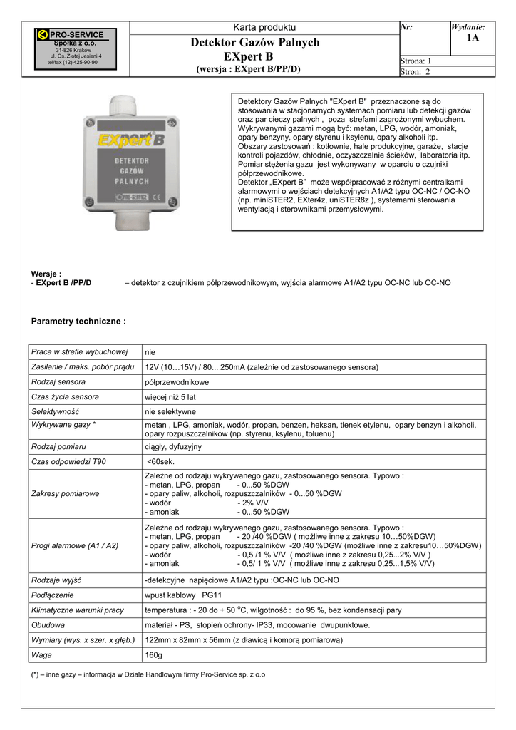 Karta produktu PRO-SERVICE Detektor Gazów Palnych EXpert B Spółka z o.o. 31-826 Kraków ul. Os. Złotej Jesieni 4 tel/fax (12) 425-90-90 (wersja : EXpert B/PP/D) Nr: Wydanie: 1A Strona: 1 Stron: 2 Detektory Gazów Palnych "EXpert B" przeznaczone są do stosowania w stacjonarnych systemach pomiaru lub detekcji gazów oraz par cieczy palnych , poza strefami zagrożonymi wybuchem. Wykrywanymi gazami mogą być: metan, LPG, wodór, amoniak, opary benzyny, opary styrenu i ksylenu, opary alkoholi itp. Obszary zastosowań : kotłownie, hale produkcyjne, garaże, stacje kontroli pojazdów, chłodnie, oczyszczalnie ścieków, laboratoria itp. Pomiar stężenia gazu jest wykonywany w oparciu o czujniki półprzewodnikowe. Detektor „EXpert B” może współpracować z różnymi centralkami alarmowymi o wejściach detekcyjnych A1/A2 typu OC-NC / OC-NO (np. miniSTER2, EXter4z, uniSTER8z ), systemami sterowania wentylacją i sterownikami przemysłowymi. Wersje : - EXpert B /PP/D – detektor z czujnikiem półprzewodnikowym, wyjścia alarmowe A1/A2 typu OC-NC lub OC-NO Parametry techniczne : Praca w strefie wybuchowej nie Zasilanie / maks. pobór prądu 12V (10…15V) / 80... 250mA (zależnie od zastosowanego sensora) Rodzaj sensora półprzewodnikowe Czas życia sensora więcej niż 5 lat Selektywność nie selektywne Wykrywane gazy * metan , LPG, amoniak, wodór, propan, benzen, heksan, tlenek etylenu, opary benzyn i alkoholi, opary rozpuszczalników (np. styrenu, ksylenu, toluenu) Rodzaj pomiaru ciągły, dyfuzyjny Czas odpowiedzi T90 <60sek. Zakresy pomiarowe Zależne od rodzaju wykrywanego gazu, zastosowanego sensora. Typowo : - metan, LPG, propan - 0...50 %DGW - opary paliw, alkoholi, rozpuszczalników - 0...50 %DGW - wodór - 2% V/V - amoniak - 0...50 %DGW Progi alarmowe (A1 / A2) Zależne od rodzaju wykrywanego gazu, zastosowanego sensora. Typowo : - metan, LPG, propan - 20 /40 %DGW ( możliwe inne z zakresu 10…50%DGW) - opary paliw, alkoholi, rozpuszczalników -20 /40 %DGW (możliwe inne z zakresu10…50%DGW) - wodór - 0,5 /1 % V/V ( możliwe inne z zakresu 0,25...2% V/V ) - amoniak - 0,5/ 1 % V/V ( możliwe inne z zakresu 0,25...1,5% V/V) Rodzaje wyjść -detekcyjne napięciowe A1/A2 typu :OC-NC lub OC-NO Podłączenie wpust kablowy PG11 Klimatyczne warunki pracy temperatura : - 20 do + 50 C, wilgotność : do 95 %, bez kondensacji pary Obudowa materiał - PS, stopień ochrony- IP33, mocowanie dwupunktowe. Wymiary (wys. x szer. x głęb.) 122mm x 82mm x 56mm (z dławicą i komorą pomiarową) Waga 160g o (*) – inne gazy – informacja w Dziale Handlowym firmy Pro-Service sp. z o.o Karta produktu PRO-SERVICE Nr: Detektor Gazów Palnych EXpert B Spółka z o.o. 31-826 Kraków ul. Os. Złotej Jesieni 4 tel/fax (12) 425-90-90 (wersja : EXpert B/PP/D) Dławica kablowa Widok Wkręty mocujące dekiel Komora pomiarowa Listwa zaciskowa KONFIG + Off 6 5 4 3 2 1 - A1A2 S On Wyjścia + A1 R1 Al1 12V 1,2k T1 R2 A2 1,2k Al2 T2 Wyjścia detekcyjne A1/A2 (typ OC-NC lub OC-NO) Wydanie: 1A Strona: 2 Stron: 2