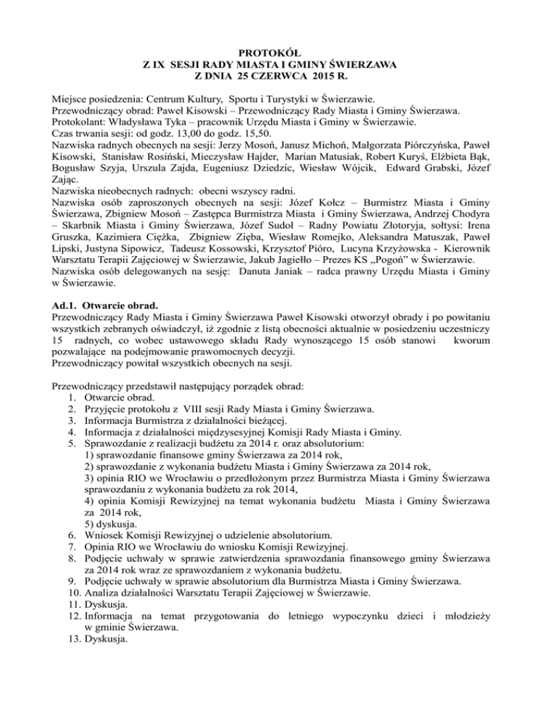 PROTOKÓŁ Z IX SESJI RADY MIASTA I GMINY ŚWIERZAWA Z DNIA 25 CZERWCA 2015 R. Miejsce posiedzenia: Centrum Kultury, Sportu i Turystyki w Świerzawie. Przewodniczący obrad: Paweł Kisowski – Przewodniczący Rady Miasta i Gminy Świerzawa. Protokolant: Władysława Tyka – pracownik Urzędu Miasta i Gminy w Świerzawie. Czas trwania sesji: od godz. 13,00 do godz. 15,50. Nazwiska radnych obecnych na sesji: Jerzy Mosoń, Janusz Michoń, Małgorzata Piórczyńska, Paweł Kisowski, Stanisław Rosiński, Mieczysław Hajder, Marian Matusiak, Robert Kuryś, Elżbieta Bąk, Bogusław Szyja, Urszula Zajda, Eugeniusz Dziedzic, Wiesław Wójcik, Edward Grabski, Józef Zając. Nazwiska nieobecnych radnych: obecni wszyscy radni. Nazwiska osób zaproszonych obecnych na sesji: Józef Kołcz – Burmistrz Miasta i Gminy Świerzawa, Zbigniew Mosoń – Zastępca Burmistrza Miasta i Gminy Świerzawa, Andrzej Chodyra – Skarbnik Miasta i Gminy Świerzawa, Józef Sudoł – Radny Powiatu Złotoryja, sołtysi: Irena Gruszka, Kazimiera Ciężka, Zbigniew Zięba, Wiesław Romejko, Aleksandra Matuszak, Paweł Lipski, Justyna Sipowicz, Tadeusz Kossowski, Krzysztof Pióro, Lucyna Krzyżowska - Kierownik Warsztatu Terapii Zajęciowej w Świerzawie, Jakub Jagiełło – Prezes KS „Pogoń” w Świerzawie. Nazwiska osób delegowanych na sesję: Danuta Janiak – radca prawny Urzędu Miasta i Gminy w Świerzawie. Ad.1. Otwarcie obrad. Przewodniczący Rady Miasta i Gminy Świerzawa Paweł Kisowski otworzył obrady i po powitaniu wszystkich zebranych oświadczył, iż zgodnie z listą obecności aktualnie w posiedzeniu uczestniczy 15 radnych, co wobec ustawowego składu Rady wynoszącego 15 osób stanowi kworum pozwalające na podejmowanie prawomocnych decyzji. Przewodniczący powitał wszystkich obecnych na sesji. Przewodniczący przedstawił następujący porządek obrad: 1. Otwarcie obrad. 2. Przyjęcie protokołu z VIII sesji Rady Miasta i Gminy Świerzawa. 3. Informacja Burmistrza z działalności bieżącej. 4. Informacja z działalności międzysesyjnej Komisji Rady Miasta i Gminy. 5. Sprawozdanie z realizacji budżetu za 2014 r. oraz absolutorium: 1) sprawozdanie finansowe gminy Świerzawa za 2014 rok, 2) sprawozdanie z wykonania budżetu Miasta i Gminy Świerzawa za 2014 rok, 3) opinia RIO we Wrocławiu o przedłożonym przez Burmistrza Miasta i Gminy Świerzawa sprawozdaniu z wykonania budżetu za rok 2014, 4) opinia Komisji Rewizyjnej na temat wykonania budżetu Miasta i Gminy Świerzawa za 2014 rok, 5) dyskusja. 6. Wniosek Komisji Rewizyjnej o udzielenie absolutorium. 7. Opinia RIO we Wrocławiu do wniosku Komisji Rewizyjnej. 8. Podjęcie uchwały w sprawie zatwierdzenia sprawozdania finansowego gminy Świerzawa za 2014 rok wraz ze sprawozdaniem z wykonania budżetu. 9. Podjęcie uchwały w sprawie absolutorium dla Burmistrza Miasta i Gminy Świerzawa. 10. Analiza działalności Warsztatu Terapii Zajęciowej w Świerzawie. 11. Dyskusja. 12. Informacja na temat przygotowania do letniego wypoczynku dzieci i młodzieży w gminie Świerzawa. 13. Dyskusja. - 2 14. Przedstawienie projektów uchwał, dyskusja i podjęcie uchwał: 1) nr 36 w sprawie powołania Zespołu do Zaopiniowania kandydatów na ławników Sądu Okręgowego w Legnicy i Sądu Rejonowego w Złotoryi, 2) nr 37 w sprawie zmian w budżecie na 2015 rok. 15. Interpelacje i zapytania radnych. 16. Odpowiedzi na interpelacje. 17. Wolne wnioski. 18. Sprawy różne. 19. Zamknięcie sesji. Nikt z radnych nie zgłosił uwag, porządek obrad został przyjęty. Ad 2. Przyjęcie protokołu z VIII sesji Rady Miasta i Gminy Świerzawa. Nikt z radnych nie zgłosił uwag do protokołu. W głosowaniu: za – 15, przeciw – 0, wstrzymujących się – 0 radnych protokół został przyjęty. Ad 3. Informacja Burmistrza z działalności bieżącej. Burmistrz MiG J. Kołcz przedstawił informację z działalności bieżącej (zał. nr 1). Nikt z radnych nie zabierał głosu w dyskusji nad informacją Burmistrza. Ad.4. Informacja z działalności międzysesyjnej Komisji Rady Miasta i Gminy. 1. Przewodniczący Komisji Rewizyjnej M. Matusiak przedstawił informację o działalności Komisji w okresie międzysesyjnym (załącznik nr 2). 2. Przewodniczący Komisji Budżetowo-Finansowej, Oświaty i Spraw Społecznych J. Michoń przedstawił informację o działalności Komisji w okresie międzysesyjnym (załącznik nr 3). 3. Przewodniczący Komisji Rolnictwa, Infrastruktury Technicznej i Ochrony Środowiska E. Grabski przedstawił informację o działalności Komisji w okresie międzysesyjnym (załącznik nr 4). Ad.5. Sprawozdanie z realizacji budżetu za 2014 r. oraz absolutorium: 1) sprawozdanie finansowe gminy Świerzawa za 2014 rok. Skarbnik A. Chodyra przedstawił sprawozdanie finansowe Miasta i Gminy Świerzawa za 2014 rok (zał. nr 5). 2) sprawozdanie z wykonania budżetu Miasta i Gminy Świerzawa za 2014 rok. Burmistrz MiG J. Kołcz przedstawił sprawozdanie z wykonania budżetu Miasta i Gminy Świerzawa za 2014 rok (zał. nr 6). 3)opinia RIO we Wrocławiu o przedłożonym przez Burmistrza Miasta i Gminy Świerzawa sprawozdaniu z wykonania budżetu za rok 2014. Przewodniczący Rady MiG P. Kisowski odczytał uchwałę Składu Orzekającego Regionalnej Izby Obrachunkowej we Wrocławiu z dnia 22 kwietnia 2015 r. w sprawie opinii o przedłożonym przez Burmistrza Miasta i Gminy Świerzawa sprawozdaniu z wykonania budżetu Miasta i Gminy Świerzawa za 2014 rok (zał. nr 7). 4)opinia Komisji Rewizyjnej na temat wykonania budżetu Miasta i Gminy Świerzawa za 2014 rok. Przewodniczący Komisji Rewizyjnej M. Matusiak przedstawił opinię Komisji na temat wykonania budżetu MiG Świerzawa za 2014 rok (zał. nr 8). 5)dyskusja. Nikt z radnych nie zabierał głosu w dyskusji. - 3 Ad.6. Wniosek Komisji Rewizyjnej o udzielenie absolutorium. Przewodniczący Komisji Rewizyjnej M. Matusiak przedstawił wniosek Komisji o udzielenie absolutorium dla Burmistrza Miasta i Gminy Świ