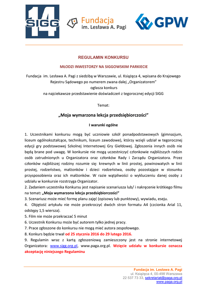 REGULAMIN KONKURSU MŁODZI INWESTORZY NA SIGGOWSKIM PARKIECIE Fundacja im. Lesława A. Pagi z siedzibą w Warszawie, ul. Książęca 4, wpisana do Krajowego Rejestru Sądowego po numerem zwana dalej „Organizatorem” ogłasza konkurs na najciekawsze przedstawienie doświadczeń z tegorocznej edycji SIGG Temat: „Moja wymarzona lekcja przedsiębiorczości” I warunki ogólne 1. Uczestnikami konkursu mogą być uczniowie szkół ponadpodstawowych (gimnazjum, liceum ogólnokształcące, technikum, liceum zawodowe), którzy wzięli udział w tegorocznej edycji gry podstawowej Szkolnej Internetowej Gry Giełdowej. Zgłoszenia innych osób nie będą brane pod uwagę. W konkursie nie mogą uczestniczyć członkowie najbliższych rodzin osób zatrudnionych u Organizatora oraz członków Rady i Zarządu Organizatora. Przez członków najbliższej rodziny rozumie się: krewnych w linii prostej, powinowatych w linii prostej, rodzeństwo, małżonków i dzieci rodzeństwa, osoby pozostające w stosunku przysposobienia oraz ich małżonków. W razie wątpliwości o wykluczeniu danej osoby z udziału w konkursie rozstrzyga Organizator. 2. Zadaniem uczestnika Konkursu jest napisanie scenariusza lub/ i nakręcenie krótkiego filmu na temat: „Moja wymarzona lekcja przedsiębiorczości” 3. Scenariusz może mieć formę planu zajęć (opisowy lub punktowy), wywiadu, eseju. 4. Objętość artykułu nie może przekroczyć dwóch stron formatu A4 (czcionka Arial 11, odstępy 1,5 wiersza). 5. Film nie może przekraczać 5 minut 6. Uczestnik Konkursu może być autorem tylko jednej pracy. 7. Prace zgłoszone do konkursu nie mogą mieć autora zespołowego. 8. Konkurs będzie trwał od 25 stycznia 2016 do 29 lutego 2016. 9. Regulamin wraz z kartą zgłoszeniową zamieszczony jest na stronie internetowej Organizatora: www.sigg.org.pl, www.paga.org.pl. Wzięcie udziału w konkursie oznacza akceptację niniejszego Regulaminu Fundacja im. Lesława A. Pagi ul. Książęca 4, 00-498 Warszawa 22 537 73 33, [email protected] www.paga.org.pl II Zgłoszenia 1. Zgłoszenie do konkursu powinno obejmować: a/ pracę konkursową w formie elektronicznej (na adres [email protected]), oraz papierowej (przesłać pocztą) b/ wypełnioną i podpisaną przez Uczestnika oraz jego rodzica lub opiekuna (w przypadku osób niepełnoletnich) kartę zgłoszeniową (załącznik do Regulaminu Konkursu). 2. Prace konkursowe należy przesłać na adres Organizatora: Fundacja im. Lesława A. Pagi Ul. Książęca 4, 00-498 Warszawa, pok. 8030 z dopiskiem na kopercie: „Moja wymarzona lekcja przedsiębiorczości ” 3. UWAGA! Zgłoszenia będą przyjmowane do dnia 29 lutego 2016 roku – liczy się data stempla pocztowego. 4. Prace przekazane tylko w wersji elektronicznej lub nie zawierające karty zgłoszeniowej oraz nie spełniające innych wymogów formalnych nie będą rozpatrywane. 5. Organizator zastrzega sobie prawo do wykluczenia z konkursu prac zawierających treści bezprawne. III Nagrody 1. Organizator powoła Jury Konkursu w skład którego wchodzić będą m.in. przedstawiciele Fundacji im. Lesława A. Pagi. 2. Przy ocenie prac Jury Konkursu weźmie pod uwagę następujące kryteria: a/ zgodność z tematem, b/ kreatywność, pomysłowość, oryginalność, c/ samodzielność, d/ formę. 3. Dla autorów trzech najciekawszych pomysłów przedstawienia doświadczeń nadesłanych przez uczniów Organizator ufundował nagrody - upominki elektroniczne oraz książkowe zestawy edukacyjne. 4. Wyniki konkursu zostaną ogłoszone 22.03.2016 r. na stronach internetowych: www.sigg.org.pl, www.paga.org.pl Fundacja im. Lesława A. Pagi ul. Książęca 4, 00-498 Warszawa 22 537 73 33, [email protected] www.paga.org.pl 5. Autorzy nagrodzonych prac zostaną powiadomieni o zwycięstwie telefonicznie albo za pomocą poczty elektronicznej. 6. Nagrody będą wręczone autorom najlepszych prac na Finałowej Gali tegorocznej edycji projektu „Szkolna Internetowa Gra Giełdowa”. W przypadku nie zgłoszenia się po odbiór nagrody, Organizator nie jest zobowiązany do ich przesłania autorowi nagrodzonej pracy. IV Ustalenia dodatkowe 1. Autorzy prac przenoszą na Organizatora bez prawa do wynagrodzenia, niczym nieograniczone majątkowe prawa autorskie do udostępnionych prac oraz własność przesłanego Fundacji egzemplarza prac, bez ograniczeń czasowych i terytorialnych, zgodnie z oświadczeniem zawartym w karcie zgłoszeniowej. Autorzy prac odpowiadają wobec Organizatora w przypadku gdyby okazało się, że udostępniona przez autora praca narusza prawa (w szczególności prawa autorskie) osób trzecich. 2. Wszystkie zgłoszone do konkursu prace mogą być w całości lub fragmentach wykorzystane przez Organizatora w materiałach edukacyjnych, informacyjnych i promocyjnych Organizatora. 3. Dane osobowe uczestników Projektu będą wykorzystywane zgodnie z ustawą z 29 sierpnia 1997r. o ochronie danych osobowych. Podanie danych jest dobrowolne, aczkolwiek odmowa ich podania jest równoznaczna z brakiem możliwości udzielenia wsparcia w ramach Projektu (brakiem możliwości uczestnictwa). Administratorem danych osobowych jest Instytucja Zarządzająca dla Programu Operacyjnego Kapitał Ludzki – Ministerstwo Rozwoju Regionalnego, ul. Wspólna 2/4, 00-926 Warszawa, która może przetwarzać dane wyłącznie w celach udzielenia wsparcia i realizacji Projektu. Projekt jest realizowany w ramach Programu Operacyjnego Kapitał Ludzki. Uczestnik Projektu ma prawo wglądu do swoich danych osobowych, a także żądania ich poprawiania lub usunięcia. Uczestnicy wyrażają zgodę na przesyłanie im informacji o niniejszym Projekcie - w szczególności drogą pocztową lub elektroniczną. Każdy uczestnik Projektu wyraża zgodę na przekazanie swoich danych osobowych administratorowi Projektu – Ministerstwu Rozwoju Regionalnego. 4. Prace nadesłane na Konkurs nie będą zwracane Autorom. 5. Organizator zastrzega sobie prawo do przerwania lub odwo