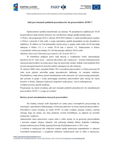 Projekt współfinansowany przez Unię Europejską w ramach Europejskiego Funduszu Społecznego Jaki jest stosunek polskich pracodawców do pracowników 45/50+? Społeczeństwo polskie nieuchronnie się starzeje. W perspektywie najbliższych 10-20 lat pracodawcy będą musieli zmierzyć się z problemem silnego spadku podaży pracy w Polsce. Jak prognozuje GUS w okresie 2010-2035 ludność w wieku produkcyjnym zmaleje w Polsce o przeszło 4 mln osób, z czego największy spadek przypadnie na lata stosunkowo najbliższe. W efekcie za 9 lat potencjalne zasoby pracy w grupie osób wieku 24-26 lata będą mniejsze o blisko 1/3, a w wieku 25-34 lata o prawie 1/5. Jednocześnie w Polsce w przedziale wiekowym między 55 a 64 lata pracuje zaledwie 39,6% osób. (Badanie Aktywności Ekonomicznej Ludności, III kwartał 2012 r.) W kontekście podjęcia przez rząd decyzji o wydłużeniu wieku emerytalnego docelowo do 67. roku życia – zarówno dla kobiet, jak i mężczyzn – kwestia funkcjonowania starszych pracowników na rynku pracy staje się niezwykle istotna. Jednak wiele polskich firm nie jest przygotowanych do nowych realiów starzejącej się siły roboczej. W sektorze MSP, który zatrudnia blisko 78% wszystkich pracowników w Polsce powyżej 50 roku życia jedynie niewielka grupa pracodawców deklaruje, że zarządza wiekiem. Przedsiębiorcy mają obawy przed zatrudnianiem osób starszych, nie wykorzystują potencjału, jaki posiada ta grupa i wciąż postrzegają emerytury pracowników jako okazję do cięcia kosztów w firmie. Zdaniem większości ekspertów rynku pracy - jest to niebezpieczny i krótkowzroczny sposób myślenia. Przyjrzyjmy się zatem uważniej, jaki jest stosunek polskich pracodawców do zatrudnionych pracowników 45/50+ i z czego on wynika? Bariery przed zatrudnianiem starszych pracowników Do trudnej sytuacji osób dojrzałych na rynku pracy niewątpliwie przyczyniają się stereotypy i uprzedzenia funkcjonujące wśród pracodawców na temat starszych pracowników. Pracodawcy często uważają, że osoby 45/50+ są mało wydajne, pracują wolniej, częściej chorują, boją się zmian, nie chcą podnosić swoich kwalifikacji, są odporne na nowinki techniczne i naukowe. Jednocześnie starsi pracownicy często sami o sobie myślą, że są gorszymi pracownikami i powinni ustąpić miejsca młodym. Jak pokazują badania Bilans Kapitału Ludzkiego przeprowadzone przez Polską Agencję Rozwoju Przedsiębiorczości w 2011 wraz z wiekiem w mniejszym lub większym stopniu spada samoocena respondentów w zakresie wszystkich kompetencji, z wyjątkiem zdolności technicznych (ale to tylko u mężczyzn). Projekt współfinansowany przez Unię Europejską w ramach Europejskiego Funduszu Społecznego Największy spadek zaobserwować można w przypadku kompetencji komputerowych – umiejętności związane z obsługą komputera i korzystania z Internetu oceniane są przez osoby powyżej 55 roku życia wyraźnie najgorzej. Eksperci rynku pracy zwracają uwagę, że starsi pracownicy są przez pracodawców niechętnie kierowani na kursy podnoszące ich kwalifikacje. Tę sytuację doskonale obrazuje wypowiedź 60-letniej kobiety: „Kiedy skończyłam 50 lat, specjalizację robiłam sama, jeżdżąc do Warszawy. W zakładzie słyszałam: „Ha, ha! A po co pani w tym wieku specjalizacja?”. Nawet jeśli pracodawca godzi się na skierowanie pracowników na kursy, to są one zwykle krótsze i tańsze niż te, na które delegowani są młodsi pracownicy. Dzieje się tak dlatego, że niektórzy przedsiębiorcy uważają podnoszenie kompetencji swoich starszych pracowników za nieracjonalne i niepotrzebne - ze względu na fakt ich rychłego przejścia na emeryturę. Ponadto sami zainteresowani często nie chcą się dokształcać i nie wyrażają chęci uczestniczenia w szkoleniach. Wśród osób w wieku 55-64 lat w Polsce w kursach i szkoleniach bierze udział mniej niż 1 % osób, w porównaniu z nieco poniżej 5% w Europie. Jak pokazuje wspomniane już wcześniej Badanie Bilans Kapitału Ludzkiego najrzadziej uczą się osoby z wykształceniem zasadniczym zawodowym oraz gimnazjalnym i niższym. Osoby posiadające wykształcenie wyższe generalnie uczą się chętniej, ale i tak ich aktywność na tym polu dramatycznie spada po 55. roku. Dlaczego tak się dzieje? Otóż ww. badania BKL pokazały, że w grupie wiekowej powyżej 50 lat najczęściej wskazywanym powodem rezygnacji ze szkolenia się było przekonanie, że w tym wieku nie ma sensu się dokształcać. Zdaniem wielu pracodawców barierą przed zatrudnianiem osób starszych jest także 4-letni okres ochronny, czyli sytuacja w której pracodawca nie może wypowiedzieć umowy o pracę pracownikom, którym do osiągnięcia wieku emerytalnego brakuje czterech lat lub mniej. Okres ochronny został wprowadzony w celu zwiększenia ochrony starszych pracowników przed zwalnianiem, ale wg wielu ekspertów rozwiązanie to przynosi skutek odwrotny do zamierzonego – pracodawcy boją się zatrudniać osoby w wieku przedemerytalnym z obawy, że nie będzie można ich zwolnić. Jednym z najpoważniejszych błędów popełnianych przez pracodawców, prowadzących do izolowania pracowników powyżej 50. roku życia, jest wychodzenie z założenia, że pracownicy ci już nie są zainteresowani swoim rozwojem zawodowym. Powyższą tezę potwierdzają wyniki badań przeprowadzonych przez Akademię Leona Koźmińskiego i Instytut Badawczy MB SMG/KRC w ramach projektu „Kompleksowy program aktywizacji osób starszych 50+”. W jednym z badań zapytano pracodawców, co - ich zdaniem - najbardziej cenią sobie w pracy osoby 50+. Okazało się, że pracodawcy w ogóle nie wskazywali, że dla starszych pracowników istotne jest, ab praca zapewniała możliwość rozwoju zawodowego! Zwracali uwagę głównie na cechy takie jak pewność i stabilność zatrudnienia oraz aspekty ekonomiczne związane z opłacaniem składek ZUS Projekt współfinans