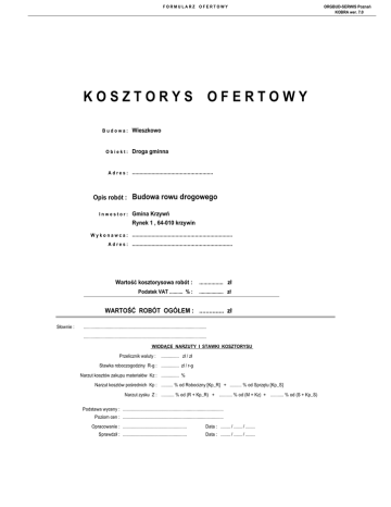 FORMULARZ OFERTOWY KOSZTORYS OFERTOWY Budowa: Obiekt: Adres: Wieszkowo Droga gminna ...................................................... Opis robót : Budowa rowu drogowego Inwestor: Gmina Krzywń Rynek 1 , 64-010 krzywin Wykonawca: ................................................................... Adres: ................................................................... Wartość kosztorysowa robót : ................ zł Podatek VAT .......... % : .................. zł WARTOŚĆ ROBÓT OGÓŁEM : ............... zł Słownie : ........................................................................................................ ........................................................................................................ WIODĄCE NARZUTY I STAWKI KOSZTORYSU Przelicznik waluty : ............... zł / zł Stawka roboczogodziny R-g : ............... zł / r-g Narzut kosztów zakupu materiałów Kz : ............... % Narzut kosztów pośrednich Kp : .......... % od Robocizny [Kp_R] + .......... % od Sprzętu [Kp_S] Narzut zysku Z : ........... % od (R + Kp_R) + ........... % od (M + Kz) + ........... % od (S + Kp_S) Podstawa wyceny : ..................................................................................... Poziom cen : ..................................................................................... Opracowanie : ...................................................... Data : ........ / ....... / ........ Sprawdził : ...................................................... Data : ........ / ....... / ........ ORGBUD-SERWIS Poznań KOBRA wer. 7.0 FORMULARZ OFERTOWY Budowa: Obiekt: Opis robót : ORGBUD-SERWIS Poznań KOBRA wer. 7.0 Wieszkowo Droga gminna Budowa rowu drogowego WIODĄCE NARZUTY I STAWKI KOSZTORYSU Stawka roboczogodziny R-g : ............... zł / r-g Narzut kosztów zakupu materiałów Kz : ............... % Narzut kosztów pośrednich Kp : ............... % od Robocizny [Kp_R] + ............... % od Sprzętu [Kp_S] Narzut zysku Z : ............... % od (R + Kp_R) + ............... % od (M+ Kz) + ............... % od (S + Kp_S) Poziom cen : ....................................................................... Data : 2013-09-11 TABELA ELEMENTÓW SCALONYCH Lp. Opis stanu / elementu Str: 1 Wartość [ zł ] A . STAN : Rów a. Roboty przygotowawcze .................. Razem : Rów .................. B . STAN : Rów b. Roboty ziemne .................. Razem : Rów .................. C . STAN : Rów c. Przepust .................. Razem : Rów .................. KOSZTORYSOWA WARTOŚĆ ROBÓT : .................. FORMULARZ OFERTOWY Budowa: Obiekt: Opis robót : ORGBUD-SERWIS Poznań KOBRA wer. 7.0 Wieszkowo Droga gminna Budowa rowu drogowego WIODĄCE NARZUTY I STAWKI KOSZTORYSU Przelicznik waluty : ............... zł / zł Stawka roboczogodziny R-g : ............... zł / r-g Narzut kosztów zakupu materiałów Kz : ............... % Narzut kosztów pośrednich Kp : ............... % od Robocizny [Kp_R] + ............... % od Sprzętu [Kp_S] Narzut zysku Z : ............... % od (R + Kp_R) + ............... % od (M+ Kz) + ............... % od (S + Kp_S) Poziom cen : ....................................................................... Data : 2013-09-11 Lp. Str: 1 Podstawa kalkulacji / Opis pozycji Ilość J.m. Cena jednostkowa Wartość [ zł ] A. STAN : Rów Numer specyfikacji : ST-01 a. ELEMENT : Roboty przygotowawcze Numer specyfikacji : ST-01 Poz. 1. KNR 201-0119-03-00 IZOiEPB ORGBUD W-wa 0,340 km [ Wydanie - Warszawa 1984 r.z uwzgl.BI do 9/96 ] Roboty pomiarowe przy liniowych robotach ziemnych - trasa dróg w terenie równinnym ................ ................ Numer specyfikacji : ST-01 Razem element : a. Roboty przygotowawcze [ zł ] ....................... Razem stan : A. Rów [ zł ] ....................... B. STAN : Rów Numer specyfikacji : ST-01 b. ELEMENT : Roboty ziemne Numer specyfikacji : ST-01 Poz. 2. KNNR 001-0202-06-00 MRRiB 507,550 m3 [ Wydanie - Warszawa 26.09.2000 r. ] Roboty ziemne wykonywane koparkami podsiębiernymi, z transportem urobku samochodami samowyładowczymi na odległość do 1 km, przy pojemności łyżki koparki: 0,40 m3 /grunt kat. III-IV/ ................ ................ ................ ................ Poz. 4. KNR 231-0105-06-00 IGM Warszawa 139,300 m2 ................ [ Wydanie - Warszawa 1991 r.z uwzgl.BI do 9/96 ] Podsypka cementowo-piaskowa zagęszczona ręcznie, o grubości warstwy po zagęszczeniu: ponad 3 cm dodatek za każdy dalszy 1 cm-krotność =2 ................ Poz. 5. KNNR 001-0514-01-00 MRRiB 107,160 m2 [ Wydanie - Warszawa 26.09.2000 r. ] Umocnienie skarp i dna kanałów płytami prefabrykowanymi. analog. płyty 60x40x8cm-współczynnik 0,6 ................ ................ ................ ................ Numer specyfikacji : ST-01 Poz. 3. KNR 231-0105-07-00 IGM Warszawa 139,300 m2 [ Wydanie - Warszawa 1991 r.z uwzgl.BI do 9/96 ] Podsypka cementowo-piaskowa zagęszczona mechanicznie, o grubości warstwy po zagęszczeniu: 3 cm Numer specyfikacji : ST-01 Poz. 6. KNR 201-0506-07-00 IZOiEPB ORGBUD W-wa 1 012,740 m2 [ Wydanie - Warszawa 1984 r.z uwzgl.BI do 9/96 ] Plantowanie (obrobienie na czysto) powierzchni skarp i korony nasypów, w gruncie kat.I-III Numer specyfikacji : ST-01 FORMULARZ OFERTOWY Opis robót : STAN : ELEMENT : Data : 2013-09-11 Lp. Podstawa kalkulacji ORGBUD-SERWIS Poznań KOBRA wer. 7.0 Budowa rowu drogowego B. Rów b. Roboty ziemne / Opis pozycji Str: 2 Ilość J.m. Cena jednostkowa Poz. 7. KNNR 010-2111-05-00 WACETOB Warszawa 7,670 100 m2 [ Wydanie - Warszawa 2001 r. ] Umocnienie skarp wykopów i nasypów przez humusowanie z obsiewem - warstwa humusu o grub. 5 cm ................ Wartość [ zł ] ................ Numer specyfikacji : ST-01 Razem element : b. Roboty ziemne [ zł ] ....................... Razem stan : B. Rów [ zł ] ....................... C. STAN : Rów Numer specyfikacji : ST-02 c. ELEMENT : Przepust Numer specyfikacji : ST-02 Poz. 8. KNNR 001-0202-06-00