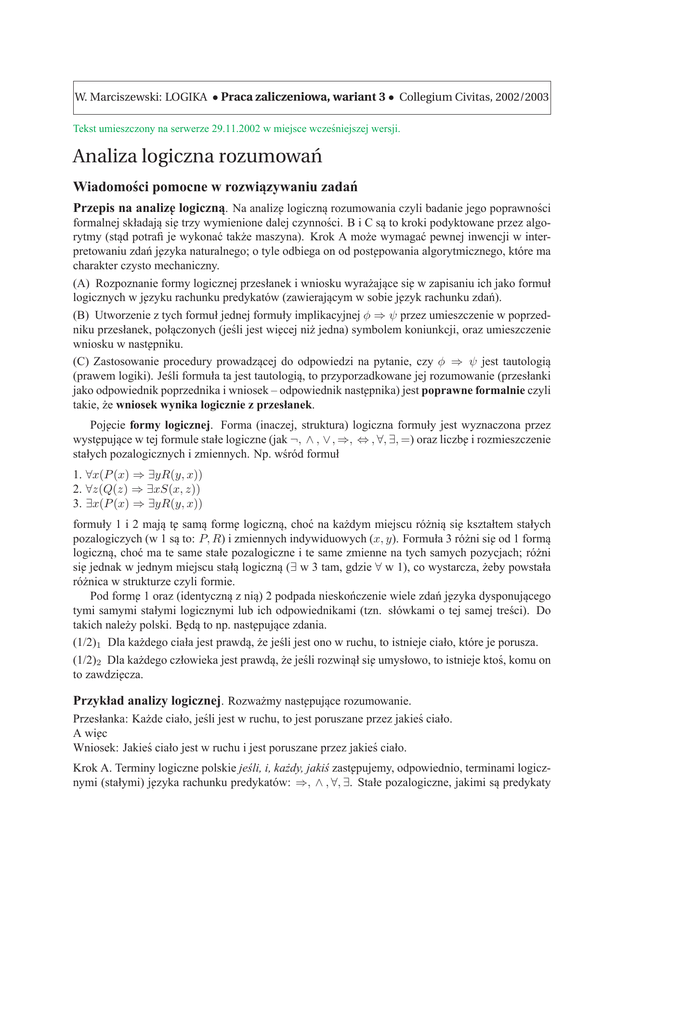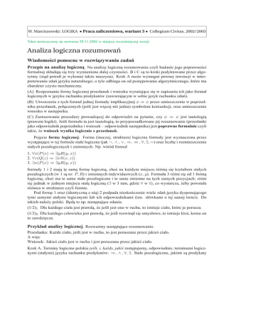 W. Marciszewski: LOGIKA • Praca zaliczeniowa, wariant 3 • Collegium Civitas, 2002/2003 Tekst umieszczony na serwerze 29.11.2002 w miejsce wcześniejszej wersji. Analiza logiczna rozumowań Wiadomości pomocne w rozwiazywaniu ˛ zadań Przepis na analiz˛e logiczna˛. Na analiz˛e logiczna˛ rozumowania czyli badanie jego poprawności formalnej składaja˛ si˛e trzy wymienione dalej czynności. B i C sa˛ to kroki podyktowane przez algorytmy (stad ˛ potrafi je wykonać także maszyna). Krok A może wymagać pewnej inwencji w interpretowaniu zdań j˛ezyka naturalnego; o tyle odbiega on od post˛epowania algorytmicznego, które ma charakter czysto mechaniczny. (A) Rozpoznanie formy logicznej przesłanek i wniosku wyrażajace ˛ si˛e w zapisaniu ich jako formuł logicznych w j˛ezyku rachunku predykatów (zawierajacym ˛ w sobie j˛ezyk rachunku zdań). (B) Utworzenie z tych formuł jednej formuły implikacyjnej φ ⇒ ψ przez umieszczenie w poprzedniku przesłanek, połaczonych ˛ (jeśli jest wi˛ecej niż jedna) symbolem koniunkcji, oraz umieszczenie wniosku w nast˛epniku. (C) Zastosowanie procedury prowadzacej ˛ do odpowiedzi na pytanie, czy φ ⇒ ψ jest tautologia˛ (prawem logiki). Jeśli formuła ta jest tautologia,˛ to przyporzadkowane jej rozumowanie (przesłanki jako odpowiednik poprzednika i wniosek – odpowiednik nast˛epnika) jest poprawne formalnie czyli takie, że wniosek wynika logicznie z przesłanek. Poj˛ecie formy logicznej. Forma (inaczej, struktura) logiczna formuły jest wyznaczona przez wyst˛epujace ˛ w tej formule stałe logiczne (jak ¬, ∧ , ∨, ⇒, ⇔ , ∀, ∃, =) oraz liczb˛e i rozmieszczenie stałych pozalogicznych i zmiennych. Np. wśród formuł 1. ∀x(P (x) ⇒ ∃yR(y, x)) 2. ∀z(Q(z) ⇒ ∃xS(x, z)) 3. ∃x(P (x) ⇒ ∃yR(y, x)) formuły 1 i 2 maja˛ t˛e sama˛ form˛e logiczna,˛ choć na każdym miejscu różnia˛ si˛e kształtem stałych pozalogiczych (w 1 sa˛ to: P, R) i zmiennych indywiduowych (x, y). Formuła 3 różni si˛e od 1 forma˛ logiczna,˛ choć ma te same stałe pozalogiczne i te same zmienne na tych samych pozycjach; różni si˛e jednak w jednym miejscu stała˛ logiczna˛ (∃ w 3 tam, gdzie ∀ w 1), co wystarcza, żeby powstała różnica w strukturze czyli formie. Pod form˛e 1 oraz (identyczna˛ z nia) ˛ 2 podpada nieskończenie wiele zdań j˛ezyka dysponujacego ˛ tymi samymi stałymi logicznymi lub ich odpowiednikami (tzn. słówkami o tej samej treści). Do takich należy polski. B˛eda˛ to np. nast˛epujace ˛ zdania. (1/2)1 Dla każdego ciała jest prawda,˛ że jeśli jest ono w ruchu, to istnieje ciało, które je porusza. (1/2)2 Dla każdego człowieka jest prawda,˛ że jeśli rozwinał ˛ si˛e umysłowo, to istnieje ktoś, komu on to zawdzi˛ecza. Przykład analizy logicznej. Rozważmy nast˛epujace ˛ rozumowanie. Przesłanka: Każde ciało, jeśli jest w ruchu, to jest poruszane przez jakieś ciało. A wi˛ec Wniosek: Jakieś ciało jest w ruchu i jest poruszane przez jakieś ciało. Krok A. Terminy logiczne polskie jeśli, i, każdy, jakiś zast˛epujemy, odpowiednio, terminami logicznymi (stałymi) j˛ezyka rachunku predykatów: ⇒, ∧ , ∀, ∃. Stałe pozalogiczne, jakimi sa˛ predykaty 2 Zadania na analiz˛e logiczna rozumowań mogłyby pozostać bez zmiany, ale dla wygody wprowadzamy skróty R i P , odpowiednio dla predykatu jednoargumentowego jest w Ruchu i dwuargumentowego Porusza. Form˛e logiczna˛ oddaja˛ teraz nast˛epujace ˛ formuły. Forma logiczna przesłanki: ∀x(R(x) ⇒ ∃yP (y, x)) Forma logiczna wniosku: ∃x(R(x) ∧ ∃yP (y, x)). Krok B. Przyporzadkowanie ˛ rozumowaniu formuły implikacyjnej, tj. postaci (φ ⇒ ψ); użyjmy ‘F’ w roli jej nazwy, F: ∀x(R(x) ⇒ ∃yP (y, x)) ⇒ ∃x(R(x) ∧ ∃yP (y, x)). Krok C. Procedura˛ stosowna˛ do rozstrzygni˛ecia, czy F jest prawem logiki, sa˛ tabele analityczne (zob. rozdz. IV, odcinek 5). Stosujac ˛ t˛e procedur˛e, pytamy jakie byłyby konsekwencje, jeśliby formuła F była fałszywa. Pierwsza˛ jest to, że F miałaby prawdziwy poprzednik i fałszywy nast˛epnik, a wi˛ec prawdziwa byłaby negacja nast˛epnika. Mamy zatem jako założenia nast˛epujace ˛ formuły: 1. ∀x(R(x) ⇒ ∃yP (y, x)) 2. ¬∃x(R(x) ∧ ∃yP (y, x)). Wyprowadzamy z nich konsekwencje za pomoca˛ reguł kierujacych ˛ rozbiorem każdej formuły na coraz prostsze składniki, aż dojdzie si˛e do ostatecznych elementów czyli formuł atomowych i ich negacji; jedne i drugie nazywamy formułami elementarnymi. Wywód ten układa si˛e w drzewo majace ˛ rozgał˛ezienia w tych miejscach, gdzie formuła˛ rozkładana˛ na składniki jest alternatywa, implikacja lub negacja koniunkcji. Gdy dojdziemy do końca wywodu, to znaczy pozostana˛ same formuły elementarne (nie poddajace ˛ si˛e dalszemu rozbiorowi), a na każdej gał˛ezi pojawi si˛e jakaś para formuł elementarnych mi˛edzy soba˛ sprzecznych, znaczy to, że zaprzeczenie F musi zawsze prowadzić do sprzeczności. Formuła zaś, której zaprzeczenie zawsze prowadzi do sprzeczności jest tautologia˛ (zawsze to znaczy przy wszelkim doborze stałych indywiduowych, którymi zast˛epujemy zmienne indywiduowe opuszczajac ˛ kwantyfikatory). Jeśli natomiast b˛edzie choć jedna gałaź, ˛ na której nie pojawi si˛e sprzeczność, znaczy to, że dla pewnych indywiduów negacja formuły F jest spełniona, a wi˛ec F nie jest tautologia.˛ Nasza przykładowa formuła, jak si˛e okazuje po sprawdzeniu, nie jest tautologia,˛ a wi˛ec nie zapewnia poprawności formalnej rozumowaniu podpadajacemu ˛ pod zwiazany ˛ z nia˛ schemat wnioskowania. Z a d a n i e 1 – „argumentacja chińska” Dla zwi˛ezłego przedstawienia rozumowań w zadaniach 1-1 do 1-5 potrzebny b˛edzie predykat: — GR tzn. jest krajem majacym ˛ gospodark˛e w rozwoju, przysługujacy ˛ za takie cechy, jak wysoki PKB, konkurencyjność w mi˛edzynarodowej wymianie handlowej, ustabilizowana waluta, nisk