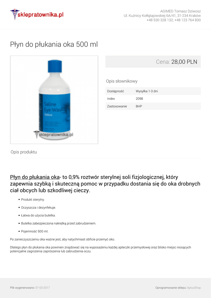 AGIMED Tomasz Dziwosz Ul. Kuźnicy Kołłątajowskiej 6A/41, 31-234 Kraków +48 530 328 132; +48 123 764 830 Płyn do płukania oka 500 ml Cena: 28,00 PLN Opis słownikowy Dostępność Wysyłka 1-3 dni Index 2098 Zastosowanie BHP Opis produktu Płyn do płukania oka- to 0,9% roztwór sterylnej soli fizjologicznej, który zapewnia szybką i skuteczną pomoc w przypadku dostania się do oka drobnych ciał obcych lub szkodliwej cieczy. Produkt sterylny. Oczyszcza i dezynfekuje. Łatwa do użycia butelka. Butelka zabezpieczona nakrętką przed zabrudzeniem. Pojemność 500 ml. Po zanieczyszczeniu oka ważne jest, aby natychmiast obficie przemyć oko. Dlatego płyn do płukania oka powinien znajdować się na wyposażeniu każdej apteczki przemysłowej oraz blisko miejsc niosących potencjalne zagrożenia zaprószenia lub zabrudzenia oczu. Plik wygenerowano: 07-03-2017 Powered by TCPDF (www.tcpdf.org) Oprogramowanie sklepu: AptusShop