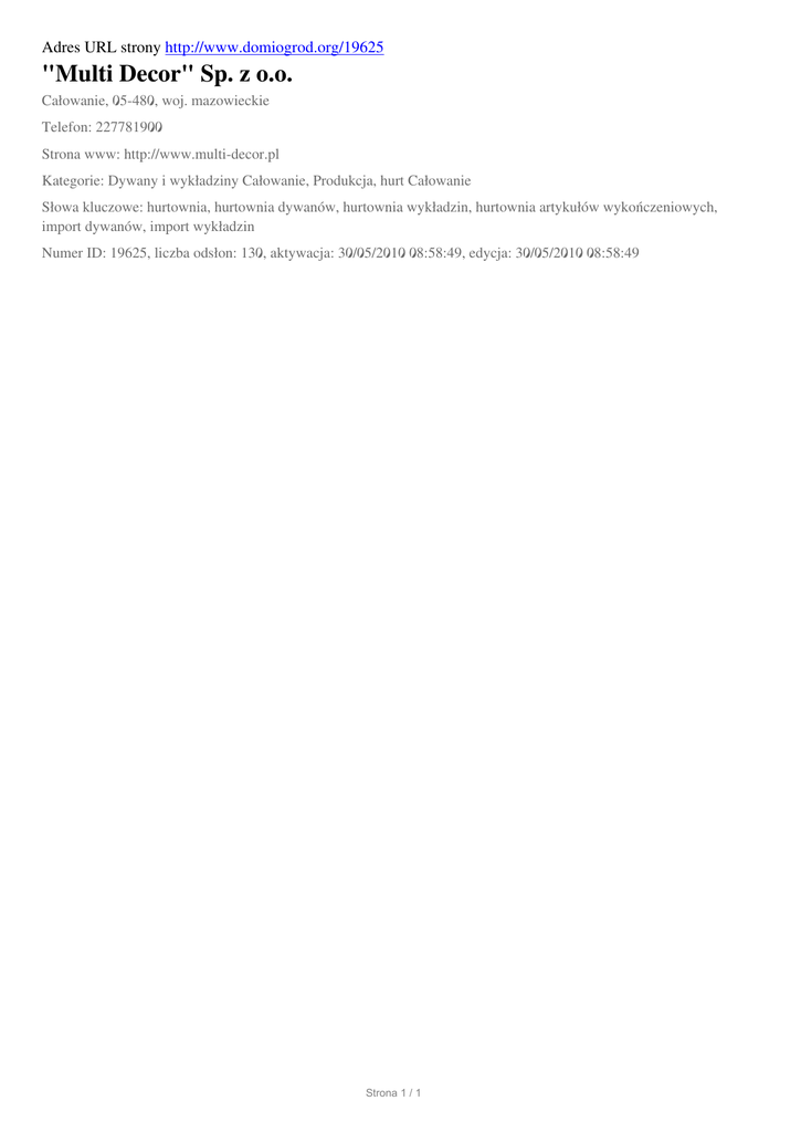 Adres URL strony http://www.domiogrod.org/19625 "Multi Decor" Sp. z o.o. Całowanie, 05-480, woj. mazowieckie Telefon: 227781900 Strona www: http://www.multi-decor.pl Kategorie: Dywany i wykładziny Całowanie, Produkcja, hurt Całowanie Słowa kluczowe: hurtownia, hurtownia dywanów, hurtownia wykładzin, hurtownia artykułów wykończeniowych, import dywanów, import wykładzin Numer ID: 19625, liczba odsłon: 130, aktywacja: 30/05/2010 08:58:49, edycja: 30/05/2010 08:58:49 Strona 1 / 1