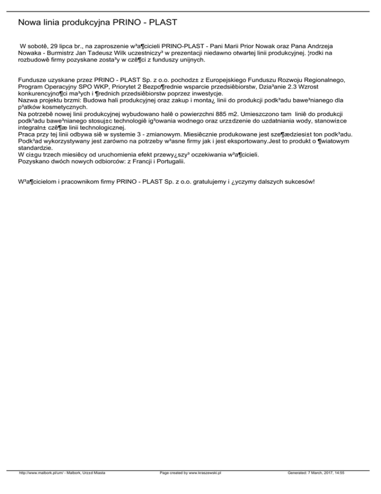 Nowa linia produkcyjna PRINO - PLAST W sobotê, 29 lipca br., na zaproszenie w³a¶cicieli PRINO-PLAST - Pani Marii Prior Nowak oraz Pana Andrzeja Nowaka - Burmistrz Jan Tadeusz Wilk uczestniczy³ w prezentacji niedawno otwartej linii produkcyjnej. ¦rodki na rozbudowê firmy pozyskane zosta³y w czê¶ci z funduszy unijnych. Fundusze uzyskane przez PRINO - PLAST Sp. z o.o. pochodz± z Europejskiego Funduszu Rozwoju Regionalnego, Program Operacyjny SPO WKP, Priorytet 2 Bezpo¶rednie wsparcie przedsiêbiorstw, Dzia³anie 2.3 Wzrost konkurencyjno¶ci ma³ych i ¶rednich przedsiêbiorstw poprzez inwestycje. Nazwa projektu brzmi: Budowa hali produkcyjnej oraz zakup i monta¿ linii do produkcji podk³adu bawe³nianego dla p³atków kosmetycznych. Na potrzebê nowej linii produkcyjnej wybudowano halê o powierzchni 885 m2. Umieszczono tam liniê do produkcji podk³adu bawe³nianego stosuj±c technologiê ig³owania wodnego oraz urz±dzenie do uzdatniania wody, stanowi±ce integraln± czê¶æ linii technologicznej. Praca przy tej linii odbywa siê w systemie 3 - zmianowym. Miesiêcznie produkowane jest sze¶ædziesi±t ton podk³adu. Podk³ad wykorzystywany jest zarówno na potrzeby w³asne firmy jak i jest eksportowany.Jest to produkt o ¶wiatowym standardzie. W ci±gu trzech miesiêcy od uruchomienia efekt przewy¿szy³ oczekiwania w³a¶cicieli. Pozyskano dwóch nowych odbiorców: z Francji i Portugalii. W³a¶cicielom i pracownikom firmy PRINO - PLAST Sp. z o.o. gratulujemy i ¿yczymy dalszych sukcesów! http://www.malbork.pl/um/ - Malbork, Urz±d Miasta Page created by www.kraszewski.pl Generated: 7 March, 2017, 14:55