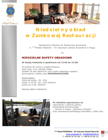 Niedzielny obiad w Zamkowej Restauracji Zapraszamy Państwa do Restauracji Zamkowej w ***Hotelu Podewils – XV-wiecznym Zamku Rycerskim w Krągu na NIEDZIELNE BUFETY OBIADOWE W każdą niedzielę w godzinach od 13.00 do 15.00. W bufecie do wyboru znajdą Państwo: dwie zupy, trzy rodzaje mięsa, dodatki do dań głównych oraz ciasto własnego wypieku. Korzystanie z bufetu jest NIEOGRANICZONE. Koszt bufetu: Cena od osoby: 45,- PLN Dzieci 3-10 lat: 20,- PLN /dziecko Dzieci do 3 lat: GRATIS Napoje płatne oddzielnie. Po obiedzie zapraszamy na zapoznanie z historią zamku, prezentację filmową zdjęć „ Zamek w Krągu - Dawniej a Dzisiaj” oraz zwiedzanie pobliskiego kościółka z 1580 roku. *** Hotel PODEWILS XV-wieczny Zamek Rycerski www.podewils.pl [email protected] T: +48 94 34 70 516 F: +48 94 31 69 111
