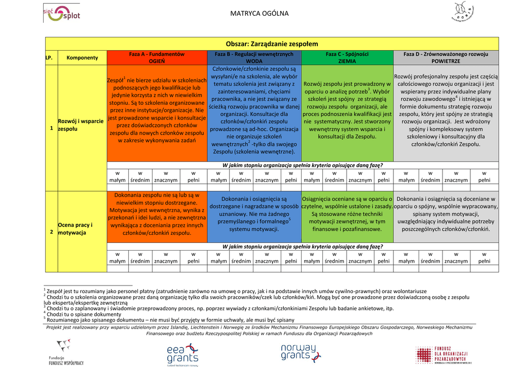 MATRYCA OGÓLNA Obszar: Zarządzanie zespołem LP. Faza A - Fundamentów OGIEŃ Komponenty Faza B - Regulacji wewnętrznych WODA 1 Zespół nie bierze udziału w szkoleniach podnoszących jego kwalifikacje lub jedynie korzysta z nich w niewielkim stopniu. Są to szkolenia organizowane przez inne instytucje/organizacje. Nie jest prowadzone wsparcie i konsultacje Rozwój i wsparcie przez doświadczonych członków 1 zespołu zespołu dla nowych członków zespołu w zakresie wykonywania zadao w w w małym średnim znacznym Ocena pracy i 2 motywacja w pełni Członkowie/członkinie zespołu są wysyłani/e na szkolenia, ale wybór tematu szkolenia jest związany z zainteresowaniami, chęciami pracownika, a nie jest związany ze ścieżką rozwoju pracownika w danej organizacji. Konsultacje dla członków/członkio zespołu prowadzone są ad-hoc. Organizacja nie organizuje szkoleo 2 wewnętrznych -tylko dla swojego Zespołu (szkolenia wewnętrzne). Faza C - Spójności ZIEMIA Faza D - Zrównoważonego rozwoju POWIETRZE Rozwój profesjonalny zespołu jest częścią Rozwój zespołu jest prowadzony w całościowego rozwoju organizacji i jest 3 oparciu o analizę potrzeb . Wybór wspierany przez indywidualne plany 4 szkoleo jest spójny ze strategią rozwoju zawodowego i istniejącą w rozwoju zespołu organizacji, ale formie dokumentu strategię rozwoju proces podnoszenia kwalifikacji jest zespołu, który jest spójny ze strategią nie systematyczny. Jest stworzony rozwoju organizacji. Jest wdrożony wewnętrzny system wsparcia i spójny i kompleksowy system szkoleniowy i konsultacyjny dla konsultacji dla Zespołu. członków/członkio Zespołu. W jakim stopniu organizacja spełnia kryteria opisujące daną fazę? w w w w w w w w małym średnim znacznym pełni małym średnim znacznym pełni w małym w w średnim znacznym w pełni Dokonania zespołu nie są lub są w Dokonania i osiągnięcia są Osiągnięcia oceniane są w oparciu o Dokonania i osiągnięcia są doceniane w niewielkim stopniu dostrzegane. dostrzegane i nagradzane w sposób czytelne, wspólnie ustalone i zasady. oparciu o spójny, wspólnie wypracowany, Motywacja jest wewnętrzna, wynika z uznaniowy. Nie ma żadnego Są stosowane różne techniki spisany system motywacji, przekonao i idei ludzi, a nie zewnętrzna 5 przemyślanego i formalnego motywacji zewnętrznej, w tym uwzględniający indywidualne potrzeby wynikająca z doceniania przez innych systemu motywacji. finansowe i pozafinansowe. poszczególnych członków/członkio. członków/członkio zespołu. w w w małym średnim znacznym w pełni W jakim stopniu organizacja spełnia kryteria opisujące daną fazę? w w w w w w w w małym średnim znacznym pełni małym średnim znacznym pełni w małym w w średnim znacznym 1 Zespół jest tu rozumiany jako personel płatny (zatrudnienie zarówno na umowę o pracy, jak i na podstawie innych umów cywilno-prawnych) oraz wolontariusze Chodzi tu o szkolenia organizowane przez daną organizację tylko dla swoich pracowników/czek lub członków/kio. Mogą byd one prowadzone przez doświadczoną osobę z zespołu lub eksperta/ekspertkę zewnętrzną 3 Chodzi tu o zaplanowany i świadomie przeprowadzony proces, np. poprzez wywiady z członkami/członkiniami Zespołu lub badanie ankietowe, itp. 4 Chodzi tu o spisane dokumenty 5 Rozumianego jako spisanego dokumentu – nie musi byd przyjęty w formie uchwały, ale musi byd spisany 2 Projekt jest realizowany przy wsparciu udzielonym przez Islandię, Liechtenstein i Norwegię ze środków Mechanizmu Finansowego Europejskiego Obszaru Gospodarczego, Norweskiego Mechanizmu Finansowego oraz budżetu Rzeczypospolitej Polskiej w ramach Funduszu dla Organizacji Pozarządowych w pełni MATRYCA OGÓLNA Istnieją już mechanizmy „otwierania” i rozwiązywania sytuacji trudnych / konfliktowych. Zaistniałe sytuacje trudne / konfliktowe Zdarza się, że niektóre konflikty Komunikacja jest otwarta. Pomiędzy są ujawniane incydentalnie. Są one /sytuacje trudne są ujawniane na poszczególnymi członkami zespołu omawiane podczas rozmów forum grupy i udaje się czasem ustanowione są formalne kanały prywatnych, nie są natomiast rozwiązad je na forum całej grupy lub komunikacji. Kluczowym narzędziem podejmowane na zebraniach zespołu. pomiędzy stronami konfliktu (w rozwiązywania konfliktów i radzenia Osoby pozostające ze sobą w trudnej zależności od sytuacji). Jednak sobie z trudnymi sytuacjami jest relacji nie dają sobie informacji Sytuacje trudne / sytuacje te mają charakter mediacja jednej z osób z kadry zwrotnych, pojawiają się natomiast 3 konfliktowe sporadyczny i ujawniają się na ogół zarządzającej. Sytuacje trudne i złośliwości w kuluarach. Komunikacja w po dłuższym czasie od momentu ich konflikty są ujawniane bezpośrednio zespole następuje w większości poprzez po ich zaistnieniu. Konflikty zaistnienia. kanały nieformalne. pomiędzy kadrą zarządzającą i pracownikami nie mają formalnego sposobu rozwiązywania w w w małym średnim znacznym Proces podejmowania 4 decyzji w pełni Albo Lider/ka podejmuje wszelkie decyzje sam/a (jednoosobowe decyzje) Nie konsultuje i nie słucha informacji zwrotnych. Czasami, sporadycznie konsultuje swoje decyzje z poszczególnymi osobami z Zespołu. Albo decyzje są podejmowane przez Zarząd i komunikowane Zespołowi. Zespół nie bierze udziału w procesie podejmowania decyzji i nie są mu przekazywane argumenty podjęcia danej decyzji. w w w małym średnim znacznym w pełni W jakim stopniu organizacja spełnia kryteria opisujące daną fazę? w w w w w w w w małym średnim znacznym pełni małym średnim znacznym pełni Konflikty są rozwiązywane na bieżąco, bądź pomiędzy stronami konfliktu, nie angażując całego zespołu/ lub na forum całego Zespołu jeśli sytuacja dotyczy wszystkich osób Organizacja okresowo bada i analizuje przepływ komunikacji, aby potwierdzid wolny przepływ informacji przez o