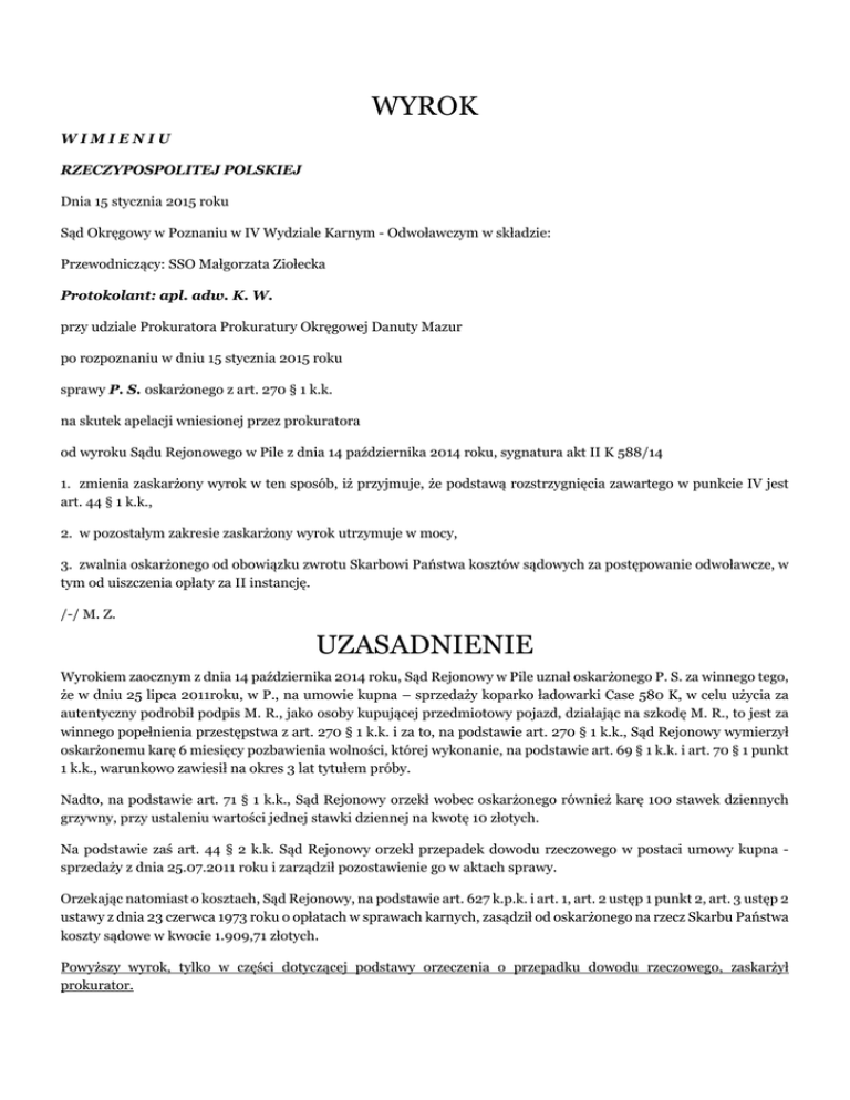 WYROK WIMIENIU RZECZYPOSPOLITEJ POLSKIEJ Dnia 15 stycznia 2015 roku Sąd Okręgowy w Poznaniu w IV Wydziale Karnym - Odwoławczym w składzie: Przewodniczący: SSO Małgorzata Ziołecka Protokolant: apl. adw. K. W. przy udziale Prokuratora Prokuratury Okręgowej Danuty Mazur po rozpoznaniu w dniu 15 stycznia 2015 roku sprawy P. S. oskarżonego z art. 270 § 1 k.k. na skutek apelacji wniesionej przez prokuratora od wyroku Sądu Rejonowego w Pile z dnia 14 października 2014 roku, sygnatura akt II K 588/14 1. zmienia zaskarżony wyrok w ten sposób, iż przyjmuje, że podstawą rozstrzygnięcia zawartego w punkcie IV jest art. 44 § 1 k.k., 2. w pozostałym zakresie zaskarżony wyrok utrzymuje w mocy, 3. zwalnia oskarżonego od obowiązku zwrotu Skarbowi Państwa kosztów sądowych za postępowanie odwoławcze, w tym od uiszczenia opłaty za II instancję. /-/ M. Z. UZASADNIENIE Wyrokiem zaocznym z dnia 14 października 2014 roku, Sąd Rejonowy w Pile uznał oskarżonego P. S. za winnego tego, że w dniu 25 lipca 2011roku, w P., na umowie kupna – sprzedaży koparko ładowarki Case 580 K, w celu użycia za autentyczny podrobił podpis M. R., jako osoby kupującej przedmiotowy pojazd, działając na szkodę M. R., to jest za winnego popełnienia przestępstwa z art. 270 § 1 k.k. i za to, na podstawie art. 270 § 1 k.k., Sąd Rejonowy wymierzył oskarżonemu karę 6 miesięcy pozbawienia wolności, której wykonanie, na podstawie art. 69 § 1 k.k. i art. 70 § 1 punkt 1 k.k., warunkowo zawiesił na okres 3 lat tytułem próby. Nadto, na podstawie art. 71 § 1 k.k., Sąd Rejonowy orzekł wobec oskarżonego również karę 100 stawek dziennych grzywny, przy ustaleniu wartości jednej stawki dziennej na kwotę 10 złotych. Na podstawie zaś art. 44 § 2 k.k. Sąd Rejonowy orzekł przepadek dowodu rzeczowego w postaci umowy kupna sprzedaży z dnia 25.07.2011 roku i zarządził pozostawienie go w aktach sprawy. Orzekając natomiast o kosztach, Sąd Rejonowy, na podstawie art. 627 k.p.k. i art. 1, art. 2 ustęp 1 punkt 2, art. 3 ustęp 2 ustawy z dnia 23 czerwca 1973 roku o opłatach w sprawach karnych, zasądził od oskarżonego na rzecz Skarbu Państwa koszty sądowe w kwocie 1.909,71 złotych. Powyższy wyrok, tylko w części dotyczącej podstawy orzeczenia o przepadku dowodu rzeczowego, zaskarżył prokurator. We wniesionej apelacji skarżący zarzucił wydanemu wyrokowi obrazę przepisów prawa karnego materialnego, a konkretnie art. 44 § 2 k.k., polegającą na wadliwym zastosowaniu tego przepisu, jako podstawy prawnej orzeczenia przepadku dowodu rzeczowego podczas, gdy przepadek tego dokumentu, jako pochodzącego bezpośrednio z przestępstwa, winien nastąpić na podstawie art. 44 § 1 k.k. Formułując powyższe zarzuty prokurator wniósł o zmianę wyroku w punkcie IV poprzez wskazanie jako podstawy prawnej orzeczonego przepadku dowodów rzeczowych art. 44 § 1 k.k. oraz utrzymanie pozostałych rozstrzygnięć w mocy Sąd Okręgowy zważył, co następuje: Apelacja prokuratora okazała się być zasadna. W pierwszej kolejności Sąd Odwoławczy podnosi, iż skarżący nie kwestionował poczynionych przez Sąd Rejonowy ustaleń faktycznych oraz zastosowanej do przypisanego oskarżonemu czynu kwalifikacji prawnej, jak i rodzaju i wysokości orzeczonych kar zasadniczych. Także Sąd Okręgowy nie dostrzegł podstaw do ingerencji w powyższym zakresie w zaskarżony wyrok ( brak przesłanek z art. 439 k.p.k.) i dlatego też rozważania swoje ograniczy tylko do zarzutów apelacji, to jest obrazy przepisu art. 44 § 2 k.k. Przechodząc do szczegółów przypomnieć należy, iż powołany przez Sąd I instancji przepis art. 44 § 2 k.k., jako podstawa orzeczonego przepadku, dotyczy obowiązku lub możliwości orzeczenia przepadku przedmiotów, ale tylko tych, które służyły lub były przeznaczone do popełnienia przestępstwa. W piśmiennictwie i orzecznictwie tak sądów powszechnych, jak i Sądu Najwyższego przyjmuje się, że przepadek przedmiotów na podstawie przepisu art. 44 § 2 k.k., obejmuje narzędzia przestępstwa (instrumenta sceleris) w znaczeniu ścisłym, to jest przedmioty wytworzone specjalnie do popełniania przestępstw (łomy służące do włamań, urządzenia do nielegalnej produkcji alkoholu, narkotyków, do fałszowania pieniędzy i papierów wartościowych itp.), jak też narzędzia w znaczeniu szerszym (sensu largo) w postaci przedmiotów służących celom nieprzestępnym, które zostały wykorzystane do popełnienia przestępstwa (np. nóż kuchenny użyty do zabójstwa, używane w celach legalnych urządzenie kserograficzne, którym posłużono się przy fałszerstwie dokumentu. Odnosząc powyższe na grunt niniejszej sprawy, Sąd II instancji zauważa, iż przedmiot, którego przepadek został orzeczony w punkcie IV zaskarżonego wyroku, w żaden sposób nie posłużył oskarżonemu do popełnienia przestępstwa i to tak w znaczeniu szerokim, jak i wąskim. Umowa kupna sprzedaży z dnia 25 lipca 2011 roku ani nie została wytworzona, aby popełnić przestępstwo, ani także nie posłużyła w celu jego dokonania. Dokument ten powstał przecież w następstwie przestępczego działania P. S.. Umowa ta jest więc niczym innym, jak „owocem”, to jest bezpośrednim „produktem” popełnionego przez oskarżonego przestępstwa. Skoro tak, to podstawą orzeczenia jego przepadku powinien być przepis art. 44 § 1 k.k. Dyspozycja bowiem zawarta w tym przepisie prawa jest jasna i wprost traktuje o konieczności orzeczenia przepadku przedmiotów pochodzących bezpośrednio z przestępstwa. Tak więc w pełni podzielając stanowisko prokuratora, Sąd II instancji zmienił zaskarżony wyrok w ten jedynie sposób, iż przyjął, że podstawą orzeczonego w punkcie IV przepadku, jest art. 44 § 1 k.k., o czym orzekł, jak w punkcie 1 swego orzeczenia. W pozostałym zakresie, Sąd II instancji, nie znajdując podstaw do ingerencji w zaskarżone orzeczenie, wyrok Sądu 