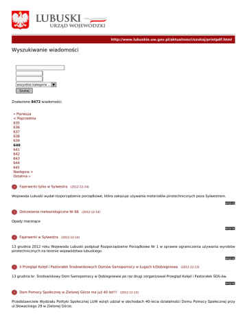 http://www.lubuskie.uw.gov.pl/aktualnosci/szukaj/printpdf.html Wyszukiwanie wiadomości wszystkie kategorie ... ▼ Szukaj Znaleziono 8472 wiadomości. « Pierwsza < Poprzednia 635 636 637 638 639 640 641 642 643 644 645 Następna > Ostatnia » Fajerwerki tylko w Sylwestra (2012-12-14) Wojewoda Lubuski wydał rozporządzenie porządkowe, która zakazuje używania materiałów pirotechnicznych poza Sylwestrem. więcej Ostrzeżenie meteorologiczne Nr 66 (2012-12-14) Opady marznące więcej Fajerwerki w Sylwestra (2012-12-14) 13 grudnia 2012 roku Wojewoda Lubuski podpisał Rozporządzenie Porządkowe Nr 1 w sprawie ograniczenia używania wyrobów pirotechnicznych na terenie województwa lubuskiego więcej II Przegląd Kolęd i Pastorałek Środowiskowych Domów Samopomocy w Ługach k/Dobiegniewa (2012-12-13) 13 grudnia br. Środowiskowy Dom Samopomocy w Dobiegniewie po raz drugi zorganizował Przegląd Kolęd i Pastorałek ŚDS-ów. więcej Dom Pomocy Społecznej w Zielonej Górze ma już 40 lat!!! (2012-12-13) Przedstawiciele Wydziału Polityki Społecznej LUW wzięli udział w obchodach 40-lecia działalności Domu Pomocy Społecznej przy ul.Słowackiego 29 w Zielonej Górze. więcej Zima pod kontrolą (2012-12-13) Wszystkie drogi w regionie są przejezdne. Nie ma problemów z dostawą energii elektrycznej. W ostatnim czasie wzrosła liczba urazów związanych ze śliskimi chodnikami. więcej Upamiętniliśmy ofiary stanu wojennego (2012-12-13) Wojewoda lubuski Marcin Jabłoński zwrócił się do Lubuszan z apelem o upamiętnienie ofiar stanu wojennego. więcej 366 dni wojewody lubuskiego Marcina Jabłońskiego [wideo] (2012-12-12) Ponad tysiąc różnych spotkań, 8 wizyt zagranicznych, 164 konferencje i uroczystości państwowe. Dla Marcina Jabłońskiego to bardzo pracowity pierwszy rok na stanowisku wojewody lubuskiego. więcej Rok wojewody Jabłońskiego (2012-12-12) 12 grudnia ubiegłego roku Marcin Jabłoński otrzymał z rąk premiera Donalda Tuska nominację na funkcję wojewody lubuskiego. więcej Rok wojewody w Radiu Zachód (2012-12-12) Rok swojej pracy podsumował na antenie Radia Zachód wojewoda Marcin Jabłoński. więcej « Pierwsza < Poprzednia 635 636 637 638 639 640 641 642 643 644 645 Następna > Ostatnia »