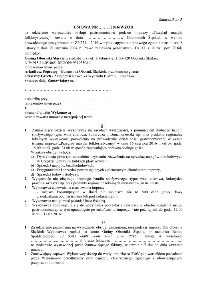 Załącznik nr 3 UMOWA NR ..……/2016/WZÓR na udzielenie wyłączności obsługi gastronomicznej podczas imprezy „Przegląd muzyki folklorystycznej” zawarta w dniu ………….…………...w Obornikach Śląskich w wyniku prowadzonego postępowania nr ZP.271. .2016 w trybie zapytania ofertowego zgodnie z art. 4 ust. 8 ustawy z dnia 29 stycznia 2004 r. Prawo zamówień publicznych (Dz. U. z 2015r., poz. 2164) pomiędzy: Gminą Oborniki Śląskie, z siedzibą przy ul. Trzebnickiej 1, 55-120 Oborniki Śląskie, NIP: 915-16-05-065, REGON: 931935081 reprezentowanym przez: Arkadiusz Poprawę - Burmistrza Obornik Śląskich, przy kontrasygnacie Czesławy Grech - Zastępcy Kierownika Wydziału Budżetu i Finansów zwanego dalej Zamawiającym, a: ……………………………………..……………. z siedzibą przy …………………………..…………….. reprezentowanym przez 1. …………………………………………..………. zwanym/-ą dalej Wykonawcą została zawarta umowa o następującej treści: 1. 2. 3. 4. 5. §1 Zamawiający udziela Wykonawcy na zasadach wyłączności, z pominięciem drobnego handlu spożywczego typu: wata cukrowa, kukurydza prażona, orzeszki itp. oraz produkty regionalne lokalnych wystawców, pozwolenia na prowadzenie działalności gastronomicznej w czasie trwania imprezy „Przegląd muzyki folklorystycznej” w dniu 16 czerwca 2016 r. od ok. godz. 15.00 do ok. godz. 24.00 w sposób zapewniający sprawną obsługę gości. W zakres obsługi wchodzi: a) Dystrybucja piwa (po uprzednim uzyskaniu zezwolenia na sprzedaż napojów alkoholowych w Urzędzie Gminy) w kubkach plastikowych, b) Sprzedaż napojów bezalkoholowych, c) Przygotowanie i sprzedaż potraw zgodnych z plenerowym charakterem imprezy, d) Sprzedaż lodów i słodyczy. Wyłączność nie obejmuje drobnego handlu spożywczego, typu: wata cukrowa, kukurydza prażona, orzeszki itp. oraz produkty regionalne lokalnych wystawców, m.in. ciasta. Wykonawca zapewnia na czas trwania imprezy: - miejsca konsumpcyjne w ilości nie mniejszej niż na 500 osób (stoły, ławy z siedziskami pod parasolami lub pod zadaszeniem); Wykonawca usługi musi posiadać kasę fiskalną. Wykonawca zobowiązuje się do utrzymania porządku i czystości w obrębie działania usługi gastronomicznej, w tym uprzątnięcie po zakończeniu imprezy – nie później niż do godz. 12.00 w dniu 17.07.2016 r. §2 1. Za udzielenie pozwolenia na wyłączność obsługi gastronomicznej podczas imprezy Dni Obornik Śląskich Wykonawca zapłaci na konto Gminy Oborniki Śląskie, nr rachunku Banku Spółdzielczego: 13 9583 0009 0000 1007 2000 0016 kwotę w wysokości ………………..….……………zł brutto (słownie: ……………….…………………………..….) na podstawie wystawionej przez Zamawiającego faktury, w terminie 7 dni od dnia zawarcia umowy. 2. Zamawiający zapewni Wykonawcy dostęp do wody oraz złącza 230V pod warunkiem posiadania przez Wykonawcę przedłużaczy oraz osprzętu elektrycznego zgodnego z obowiązującymi przepisami i normami. Załącznik nr 3 3. Wykonawca zobowiązuje się do przeprowadzenia obsługi zgodnie z ofertą złożoną przez Wykonawcę, a zaakceptowana przez Zamawiającego w trybie wyboru ofert. Oferta Wykonawcy wraz z zaproszeniem stanowi integralną część niniejszej umowy. §3 Strony ustanawiają przedstawicieli do wspólnych kontaktów w realizacji niniejszej umowy w osobach: - ze strony Zamawiającego: Martyna Ostaszewska – tel. 71 310 35 19 wew. 420 - ze strony Wykonawcy: ……………………………………………………………. §4 1. W przypadku odmowy realizacji przedmiotu umowy przez Wykonawcę w terminie krótszym niż 30 dni kalendarzowych przed imprezą, o której mowa w § 1, Wykonawca zapłaci Zamawiającemu 30% kwoty ustalonej w §2 ust. 1. 2. Żadna ze stron nie będzie odpowiedzialna względem drugiej strony w przypadku, gdy do niewykonania umowy dojdzie na skutek okoliczności siły wyższej, zdarzeń losowych, klęsk żywiołowych lub innych okoliczności niezależnych od woli którejkolwiek ze stron, którym nie można było zapobiec. §5 Wszelkie zmiany postanowień niniejszej umowy dla swojej ważności wymagają formy pisemnej i potwierdzenia przyjęcia jej przez obie strony umowy. §6 1. W sprawach nieuregulowanych niniejszą umową mają zastosowania przepisy Kodeksu Cywilnego. 2. Ewentualne spory wynikłe z wykonywania niniejszej umowy rozstrzygać będą właściwe dla Zamawiającego sądy powszechne. 3. Umowę niniejszą sporządzono trzech jednobrzmiących egzemplarzach, tj. dwa dla Zamawiającego i jeden dla Wykonawcy. Załączniki do umowy: Załącznik nr 1 – Oferta wykonawcy Załącznik nr 2 – Zaproszenie do złożenia oferty ZAMAWIAJĄCY ......................................... WYKONAWCA ...........................................