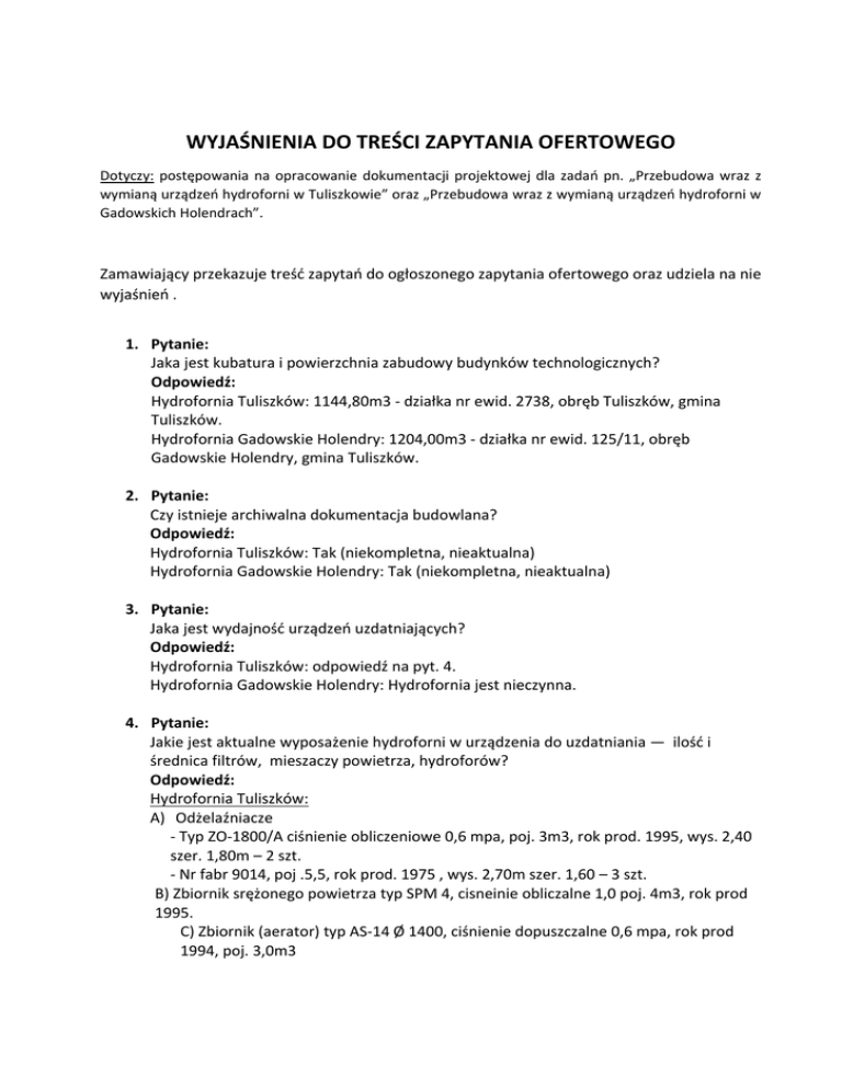 WYJAŚNIENIA DO TREŚCI ZAPYTANIA OFERTOWEGO Dotyczy: postępowania na opracowanie dokumentacji projektowej dla zadań pn. „Przebudowa wraz z wymianą urządzeń hydroforni w Tuliszkowie” oraz „Przebudowa wraz z wymianą urządzeń hydroforni w Gadowskich Holendrach”. Zamawiający przekazuje treść zapytań do ogłoszonego zapytania ofertowego oraz udziela na nie wyjaśnień . 1. Pytanie: Jaka jest kubatura i powierzchnia zabudowy budynków technologicznych? Odpowiedź: Hydrofornia Tuliszków: 1144,80m3 - działka nr ewid. 2738, obręb Tuliszków, gmina Tuliszków. Hydrofornia Gadowskie Holendry: 1204,00m3 - działka nr ewid. 125/11, obręb Gadowskie Holendry, gmina Tuliszków. 2. Pytanie: Czy istnieje archiwalna dokumentacja budowlana? Odpowiedź: Hydrofornia Tuliszków: Tak (niekompletna, nieaktualna) Hydrofornia Gadowskie Holendry: Tak (niekompletna, nieaktualna) 3. Pytanie: Jaka jest wydajność urządzeń uzdatniających? Odpowiedź: Hydrofornia Tuliszków: odpowiedź na pyt. 4. Hydrofornia Gadowskie Holendry: Hydrofornia jest nieczynna. 4. Pytanie: Jakie jest aktualne wyposażenie hydroforni w urządzenia do uzdatniania — ilość i średnica filtrów, mieszaczy powietrza, hydroforów? Odpowiedź: Hydrofornia Tuliszków: A) Odżelaźniacze - Typ ZO-1800/A ciśnienie obliczeniowe 0,6 mpa, poj. 3m3, rok prod. 1995, wys. 2,40 szer. 1,80m – 2 szt. - Nr fabr 9014, poj .5,5, rok prod. 1975 , wys. 2,70m szer. 1,60 – 3 szt. B) Zbiornik srężonego powietrza typ SPM 4, cisneinie obliczalne 1,0 poj. 4m3, rok prod 1995. C) Zbiornik (aerator) typ AS-14 Ø 1400, ciśnienie dopuszczalne 0,6 mpa, rok prod 1994, poj. 3,0m3 Hydrofornia Gadowskie Holendry: - Hydrofor 2000l – 3 szt. - Zbiornik ciśnieniowy poj .1,0 m3 - Pompy 11kW typ 160M-2A – 4 szt. - Odżelaźniacze 1400 l, rok prod. 1987, - 4 szt. 5. Pytanie: Czy obiekty objęte są nadzorem konserwatorskim? Odpowiedź: Nie 6. Pytanie: Jednocześnie wnosimy o zmianę terminu realizacji dokumentacji, gdyż proponowany termin 15.04.2016 r. jest terminem mało realnym. Mając na uwadze, że podpisanie umowy nastąpić może na początku lutego to na realizację zadania zostanie 2 - 2,5 miesięcy, co przy konieczności uzyskania map do celów projektowych sporządzenia inwentaryzacji, dokonania uzgodnień oraz opracowania i uzgodnienia z Inwestorem koncepcji rozwiązania nie pozostawia czasu na właściwe prace projektowe. Proponujemy zmianę terminu umownego na 15,05.2016 r. Odpowiedź: Zamawiający nie przewiduje możliwości zmiany terminu realizacji zamówienia.