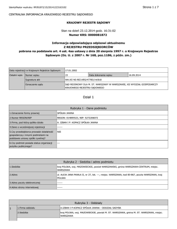 Strona 1 z 7 Identyfikator wydruku: RP/81872/15/20141223163102 CENTRALNA INFORMACJA KRAJOWEGO REJESTRU SĄDOWEGO KRAJOWY REJESTR SĄDOWY Stan na dzień 23.12.2014 godz. 16:31:02 Numer KRS: 0000081872 Informacja odpowiadająca odpisowi aktualnemu Z REJESTRU PRZEDSIĘBIORCÓW pobrana na podstawie art. 4 ust. 4aa ustawy z dnia 20 sierpnia 1997 r. o Krajowym Rejestrze Sądowym (Dz. U. z 2007 r. Nr 168, poz.1186, z późn. zm.) Data rejestracji w Krajowym Rejestrze Sądowym 17.01.2002 Ostatni wpis Numer wpisu 15 Sygnatura akt WA.XII NS-REJ.KRS/47785/14/818 Oznaczenie sądu SĄD REJONOWY DLA M. ST. WARSZAWY W WARSZAWIE, XII WYDZIAŁ GOSPODARCZY KRAJOWEGO REJESTRU SĄDOWEGO Data dokonania wpisu 16.09.2014 Dział 1 Rubryka 1 - Dane podmiotu 1.Oznaczenie formy prawnej SPÓŁKA JAWNA 2.Numer REGON/NIP REGON: 014895523, NIP: 5272206072 3.Firma, pod którą spółka działa A. IZBAN I P. KOPACZ SPÓŁKA JAWNA 4.Dane o wcześniejszej rejestracji ------ 5.Czy przedsiębiorca prowadzi działalność gospodarczą z innymi podmiotami na podstawie umowy spółki cywilnej? NIE 6.Czy podmiot posiada status organizacji pożytku publicznego? --- Rubryka 2 - Siedziba i adres podmiotu 1.Siedziba kraj POLSKA, woj. MAZOWIECKIE, powiat WARSZAWSKI, gmina WARSZAWA-CENTRUM, miejsc. WARSZAWA 2.Adres ul. ALEJA JANA PAWŁA II, nr 27, lok. ---, miejsc. WARSZAWA, kod 00-867, poczta WARSZAWA, kraj POLSKA 3.Adres poczty elektronicznej ------ 4.Adres strony internetowej ------ Rubryka 3 - Oddziały 1 1.Firma oddziału A.IZBAN I P.KOPACZ SPÓŁKA JAWNA - ODDZIAŁ SADYBA 2.Siedziba kraj POLSKA, woj. MAZOWIECKIE, powiat M. ST. WARSZAWA, gmina M. ST. WARSZAWA, miejsc. WARSZAWA Strona 2 z 7 Identyfikator wydruku: RP/81872/15/20141223163102 3.Adres ul. POWSIŃSKA, nr 31, lok. ---, miejsc. WARSZAWA, kod 02-903, poczta WARSZAWA, kraj POLSKA Rubryka 4 - Informacje o umowie 1.Informacje o zawarciu lub zmianie umowy spółki 1 UMOWA SPÓŁKI CYWILNEJ ZAWARTA DNIA 24 SIERPNIA 1998 ROKU I ZMIENIONA ANEKSEM Z DNIA: -06 CZERWCA 2000 ROKU -01 WRZESNIA 2000 ROKU -10 MARCA 2001 ROKU -06 GRUDNIA 2001 ROKU. Rubryka 5 1.Czas, na jaki została utworzona spółka NIEOZNACZONY Rubryka 6 - Sposób powstania spółki Brak wpisów Rubryka 7 - Dane wspólników 1 2 1.Nazwisko / Nazwa lub firma IZBAN 2.Imiona AGNIESZKA 3.Numer PESEL/REGON 68011500609 4.Numer KRS ****** 5.Czy wspólnik pozostaje w związku małżeńskim? TAK 6.Czy została zawarta małżeńska umowa majątkowa? TAK 7.Czy powstała rozdzielność majątkowa między małżonkami ? TAK 8.Czy wspólnik ma ograniczoną zdolność do czynności prawnych? NIE 1.Nazwisko / Nazwa lub firma KOPACZ 2.Imiona PIOTR ERYK 3.Numer PESEL/REGON 72051800977 4.Numer KRS ****** 5.Czy wspólnik pozostaje w związku małżeńskim? TAK 6.Czy została zawarta małżeńska umowa majątkowa? NIE 7.Czy powstała rozdzielność majątkowa między małżonkami ? NIE 8.Czy wspólnik ma ograniczoną zdolność do czynności prawnych? NIE Strona 3 z 7 Identyfikator wydruku: RP/81872/15/20141223163102 Dział 2 Rubryka 1 - Uprawnieni do reprezentowania spółki 1.Nazwa organu uprawnionego do reprezentowania podmiotu WSPÓLNICY REPREZENTUJĄCY SPÓŁKĘ 2.Sposób reprezentacji podmiotu DO REPREZENTOWANIA SPÓŁKI UPRAWNIONY JEST KAŻDY WSPÓLNIK SAMODZIELNIE Podrubryka 1 Dane wspólników reprezentujących spółkę 1 2 1.Nazwisko / Nazwa lub firma IZBAN 2.Imiona AGNIESZKA 3.Numer PESEL/REGON 68011500609 4.Numer KRS **** 1.Nazwisko / Nazwa lub firma KOPACZ 2.Imiona PIOTR ERYK 3.Numer PESEL/REGON 72051800977 4.Numer KRS **** Rubryka 2 - Nie dotyczy Brak wpisów Rubryka 3 - Prokurenci Brak wpisów Dział 3 Rubryka 1 - Przedmiot działalności 1.Przedmiot przeważającej działalności przedsiębiorcy 1 --- 2.Przedmiot pozostałej działalności przedsiębiorcy 1 52, 31, Z, SPRZEDAŻ DETALICZNA WYROBÓW FARMACEUTYCZNYCH 2 52, 32, Z, SPRZEDAŻ DETALICZNA ARTYKUŁÓW MEDYCZNYCH I ORTOPEDYCZNYCH 3 52, 33, Z, SPRZEDAŻ DETALICZNA KOSMETYKÓW I ARTYKUŁÓW TOALETOWYCH Rubryka 2 - Wzmianki o złożonych dokumentach Rodzaj dokumentu Nr kolejny w polu Data złożenia Za okres od do 1.Wzmianka o złożeniu rocznego sprawozdania finansowego 1 13.05.2003 ZA 2002 2 30.06.2004 2003 3 12.07.2005 2004 ROK 4 27.06.2006 01.01.2005 - 31.12.2005 5 12.10.2007 2006 Strona 4 z 7 Identyfikator wydruku: RP/81872/15/20141223163102 6 12.12.2008 2007 ROK 7 26.03.2010 2008 ROK 8 09.11.2010 2009 R. 9 03.08.2011 2010 R. 10 12.07.2013 01.01.2011-31.12.2011 11 12.07.2013 01.01.2012-31.12.2012 12 15.07.2014 OD 01.01.2013 DO 31.12.2013 3.Wzmianka o złożeniu uchwały 1 lub postanowienia o 2 zatwierdzeniu sprawozdania 3 finansowego ***** ZA 2002 ***** 2003 ***** 2004 ROK 4 ***** 01.01.2005 - 31.12.2005 5 ***** 2006 6 ***** 2007 ROK 7 ***** 2008 ROK 8 ***** 2009 R. 9 ***** 2010 R. 10 ***** 2011 ROK 11 ***** 2012 ROK 12 ***** OD 01.01.2013 DO 31.12.2013 Rubryka 3 - Sprawozdania grupy kapitałowej Brak wpisów Rubryka 4 - Przedmiot działalności statutowej organizacji pożytku publicznego Brak wpisów Dział 4 Rubryka 1 - Zaległości 1 2 1.Charakter zaległości NA RZECZ ZUS 2.Oznaczenie organu wystawiającego tytuł wykonawczy, data wszczęcia egzekucji i numer tytułu wykonawczego DYREKTOR I ODDZIAŁU ZAKŁADU UBEZPIECZEŃ SPOŁECZNYCH W WARSZAWIE, 05.09.2012, TW1440312019336 3.Wysokość zaległości 40 943,10 ZŁ 4.Informacja o zakończeniu egzekucji ---, --- 1.Charakter zaległości NA RZECZ ZUS 2.Oznaczenie organu wystawiającego tytuł wykonawczy, data wszczęcia egzekucji i numer tytułu wykonawczego DYREKTOR I ODDZIAŁU ZAKŁADU UBEZPIECZEŃ SPOŁECZNYCH W WARSZAWIE, 05.09.2012, TW1440312019350 3.Wysokość zaległości 37 393,20 ZŁ Identyfikator wydruku: RP/81872/15/20141223163102 3 4 5 6 7 8 9 Strona 5 z 7 4.Informacja o zakończeniu egzekucji ---, --- 1.Charakter zaległości NA RZECZ ZUS 2.Oznaczenie organu wystawiającego tytuł wykonawczy, data wszczęcia egzekucji i numer tytułu wykonawczego DYREKTOR I ODDZIAŁU ZAKŁADU UBEZPIECZEŃ SPOŁECZ