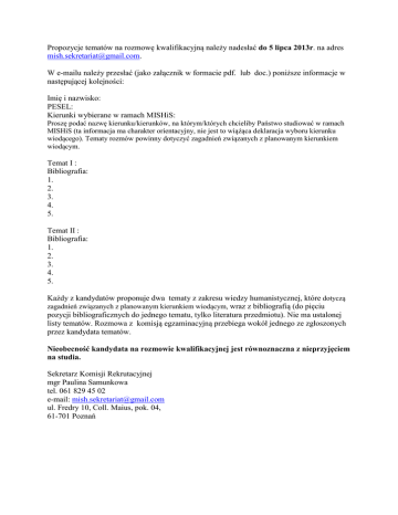 Propozycje tematów na rozmowę kwalifikacyjną należy nadesłać do 5 lipca 2013r. na adres [email protected]. W e-mailu należy przesłać (jako załącznik w formacie pdf. lub doc.) poniższe informacje w następującej kolejności: Imię i nazwisko: PESEL: Kierunki wybierane w ramach MISHiS: Proszę podać nazwę kierunku/kierunków, na którym/których chcieliby Państwo studiować w ramach MISHiS (ta informacja ma charakter orientacyjny, nie jest to wiążąca deklaracja wyboru kierunku wiodącego). Tematy rozmów powinny dotyczyć zagadnień związanych z planowanym kierunkiem wiodącym. Temat I : Bibliografia: 1. 2. 3. 4. 5. Temat II : Bibliografia: 1. 2. 3. 4. 5. Każdy z kandydatów proponuje dwa tematy z zakresu wiedzy humanistycznej, które dotyczą zagadnień związanych z planowanym kierunkiem wiodącym, wraz z bibliografią (do pięciu pozycji bibliograficznych do jednego tematu, tylko literatura przedmiotu). Nie ma ustalonej listy tematów. Rozmowa z komisją egzaminacyjną przebiega wokół jednego ze zgłoszonych przez kandydata tematów. Nieobecność kandydata na rozmowie kwalifikacyjnej jest równoznaczna z nieprzyjęciem na studia. Sekretarz Komisji Rekrutacyjnej mgr Paulina Samunkowa tel. 061 829 45 02 e-mail: [email protected] ul. Fredry 10, Coll. Maius, pok. 04, 61-701 Poznań
