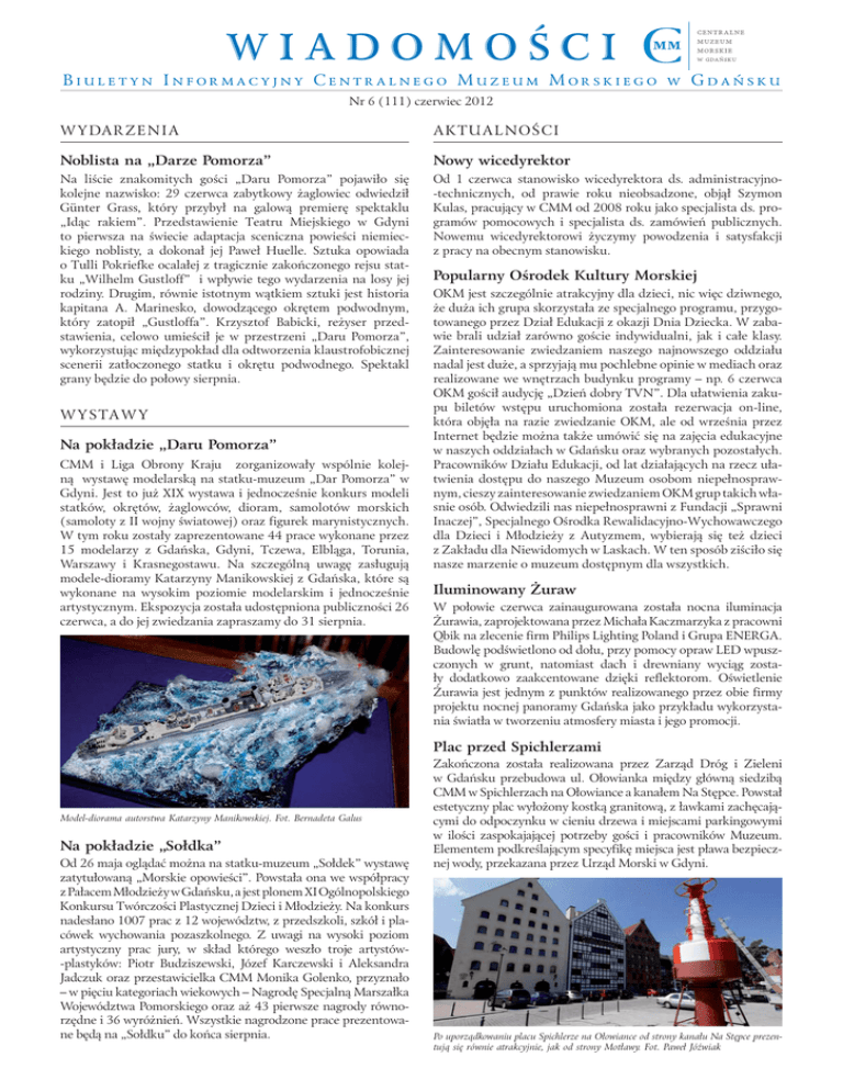 WIADOMOŚCI BIULETYN INFORMACYJNY CENTRALNEGO MUZEUM MORSKIEGO W GDAŃSKU Nr 6 (111) czerwiec 2012 WY DARZENIA AKTUALNOŚCI Noblista na „Darze Pomorza” Nowy wicedyrektor Na liście znakomitych gości „Daru Pomorza” pojawiło się kolejne nazwisko: 29 czerwca zabytkowy żaglowiec odwiedził Günter Grass, który przybył na galową premierę spektaklu „Idąc rakiem”. Przedstawienie Teatru Miejskiego w Gdyni to pierwsza na świecie adaptacja sceniczna powieści niemieckiego noblisty, a dokonał jej Paweł Huelle. Sztuka opowiada o Tulli Pokriefke ocalałej z tragicznie zakończonego rejsu statku „Wilhelm Gustloff” i wpływie tego wydarzenia na losy jej rodziny. Drugim, równie istotnym wątkiem sztuki jest historia kapitana A. Marinesko, dowodzącego okrętem podwodnym, który zatopił „Gustloffa”. Krzysztof Babicki, reżyser przedstawienia, celowo umieścił je w przestrzeni „Daru Pomorza”, wykorzystując międzypokład dla odtworzenia klaustrofobicznej scenerii zatłoczonego statku i okrętu podwodnego. Spektakl grany będzie do połowy sierpnia. Od 1 czerwca stanowisko wicedyrektora ds. administracyjno-technicznych, od prawie roku nieobsadzone, objął Szymon Kulas, pracujący w CMM od 2008 roku jako specjalista ds. programów pomocowych i specjalista ds. zamówień publicznych. Nowemu wicedyrektorowi życzymy powodzenia i satysfakcji z pracy na obecnym stanowisku. WY S TA WY Na pokładzie „Daru Pomorza” CMM i Liga Obrony Kraju zorganizowały wspólnie kolejną wystawę modelarską na statku-muzeum „Dar Pomorza” w Gdyni. Jest to już XIX wystawa i jednocześnie konkurs modeli statków, okrętów, żaglowców, dioram, samolotów morskich (samoloty z II wojny światowej) oraz figurek marynistycznych. W tym roku zostały zaprezentowane 44 prace wykonane przez 15 modelarzy z Gdańska, Gdyni, Tczewa, Elbląga, Torunia, Warszawy i Krasnegostawu. Na szczególną uwagę zasługują modele-dioramy Katarzyny Manikowskiej z Gdańska, które są wykonane na wysokim poziomie modelarskim i jednocześnie artystycznym. Ekspozycja została udostępniona publiczności 26 czerwca, a do jej zwiedzania zapraszamy do 31 sierpnia. Popularny Ośrodek Kultury Morskiej OKM jest szczególnie atrakcyjny dla dzieci, nic więc dziwnego, że duża ich grupa skorzystała ze specjalnego programu, przygotowanego przez Dział Edukacji z okazji Dnia Dziecka. W zabawie brali udział zarówno goście indywidualni, jak i całe klasy. Zainteresowanie zwiedzaniem naszego najnowszego oddziału nadal jest duże, a sprzyjają mu pochlebne opinie w mediach oraz realizowane we wnętrzach budynku programy – np. 6 czerwca OKM gościł audycję „Dzień dobry TVN”. Dla ułatwienia zakupu biletów wstępu uruchomiona została rezerwacja on-line, która objęła na razie zwiedzanie OKM, ale od września przez Internet będzie można także umówić się na zajęcia edukacyjne w naszych oddziałach w Gdańsku oraz wybranych pozostałych. Pracowników Działu Edukacji, od lat działających na rzecz ułatwienia dostępu do naszego Muzeum osobom niepełnosprawnym, cieszy zainteresowanie zwiedzaniem OKM grup takich własnie osób. Odwiedzili nas niepełnosprawni z Fundacji „Sprawni Inaczej”, Specjalnego Ośrodka Rewalidacyjno-Wychowawczego dla Dzieci i Młodzieży z Autyzmem, wybierają się też dzieci z Zakładu dla Niewidomych w Laskach. W ten sposób ziściło się nasze marzenie o muzeum dostępnym dla wszystkich. Iluminowany Żuraw W połowie czerwca zainaugurowana została nocna iluminacja Żurawia, zaprojektowana przez Michała Kaczmarzyka z pracowni Qbik na zlecenie firm Philips Lighting Poland i Grupa ENERGA. Budowlę podświetlono od dołu, przy pomocy opraw LED wpuszczonych w grunt, natomiast dach i drewniany wyciąg zostały dodatkowo zaakcentowane dzięki reflektorom. Oświetlenie Żurawia jest jednym z punktów realizowanego przez obie firmy projektu nocnej panoramy Gdańska jako przykładu wykorzystania światła w tworzeniu atmosfery miasta i jego promocji. Plac przed Spichlerzami Model-diorama autorstwa Katarzyny Manikowskiej. Fot. Bernadeta Galus Na pokładzie „Sołdka” Od 26 maja oglądać można na statku-muzeum „Sołdek” wystawę zatytułowaną „Morskie opowieści”. Powstała ona we współpracy z Pałacem Młodzieży w Gdańsku, a jest plonem XI Ogólnopolskiego Konkursu Twórczości Plastycznej Dzieci i Młodzieży. Na konkurs nadesłano 1007 prac z 12 województw, z przedszkoli, szkół i placówek wychowania pozaszkolnego. Z uwagi na wysoki poziom artystyczny prac jury, w skład którego weszło troje artystów-plastyków: Piotr Budziszewski, Józef Karczewski i Aleksandra Jadczuk oraz przestawicielka CMM Monika Golenko, przyznało – w pięciu kategoriach wiekowych – Nagrodę Specjalną Marszałka Województwa Pomorskiego oraz aż 43 pierwsze nagrody równorzędne i 36 wyróżnień. Wszystkie nagrodzone prace prezentowane będą na „Sołdku” do końca sierpnia. Zakończona została realizowana przez Zarząd Dróg i Zieleni w Gdańsku przebudowa ul. Ołowianka między główną siedzibą CMM w Spichlerzach na Ołowiance a kanałem Na Stępce. Powstał estetyczny plac wyłożony kostką granitową, z ławkami zachęcającymi do odpoczynku w cieniu drzewa i miejscami parkingowymi w ilości zaspokajającej potrzeby gości i pracowników Muzeum. Elementem podkreślającym specyfikę miejsca jest pława bezpiecznej wody, przekazana przez Urząd Morski w Gdyni. Po uporządkowaniu placu Spichlerze na Ołowiance od strony kanału Na Stępce prezentują się równie atrakcyjnie, jak od strony Motławy. Fot. Paweł Jóźwiak NAGRODY Laur Muzeum Morskiego Walne Zebranie Towarzystwa Przyjaciół CMM było okazją do wręczenia „Lauru Muzeum Morskiego” – ustanowionej przez TP CMM dorocznej nagrody, honorującej tych pracowników Muzeum, którzy mają na koncie wyróżniające się osiągnięcia naukowe, wystawiennicze lub organizacyjne. W tym roku nagrody otrzyma
