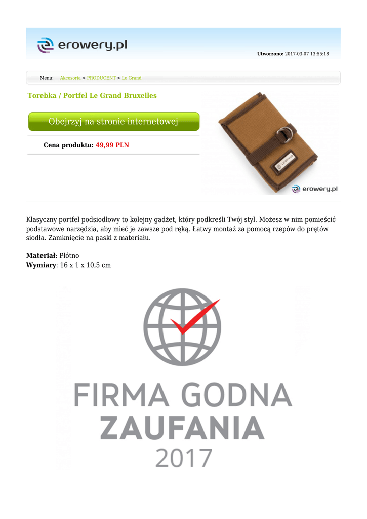 Utworzono: 2017-03-07 13:55:18 Menu: Akcesoria > PRODUCENT > Le Grand Torebka / Portfel Le Grand Bruxelles Obejrzyj na stronie internetowej Cena produktu: 49,99 PLN Klasyczny portfel podsiodłowy to kolejny gadżet, który podkreśli Twój styl. Możesz w nim pomieścić podstawowe narzędzia, aby mieć je zawsze pod ręką. Łatwy montaż za pomocą rzepów do prętów siodła. Zamknięcie na paski z materiału. Materiał: Płótno Wymiary: 16 x 1 x 10,5 cm Producent Opcja fotelika dziecięcego Rodzaj Przeznaczenie Le Grand Nie Miejska Miejsce montażu Pod siodło, Kieszeń Kolor Brązowy_#663300 Akcesoria - Mimo dołożenia wszelkich starań nie gwarantujemy, że publikowane opisy i specyfikacje techniczne niezawierają uchybień lub błędów, które nie mogą jednak być podstawą do roszczeń. W przypadku jakichkolwiek wątpliwości, przed podjęciem decyzji prosimy o kontakt. Adres: www.erowery.pl Telefon: 605 515 185, 34 361 16 71 Email: [email protected]