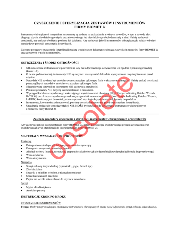 CZYSZCZENIE I STERYLIZACJA ZESTAWÓW I INSTRUMENTÓW FIRMY BIOMET 3i Instrumenty chirurgiczne i skrzynki na instrumenty są podatne na uszkodzenia z różnych powodów, w tym z powodu zbyt długiego użycia, niewłaściwego użycia oraz nieostrożnego lub niewłaściwego obchodzenia się z nimi. Należy zachować ostrożność, aby uniknąć obniżenia poziomu ich działania. Aby zachować jakość instrumentów chirurgicznych, należy wdrożyć standardowy protokół czyszczenia i sterylizacji. Zalecane procedury czyszczenia i sterylizacji podane w niniejszym dokumencie dotyczą wszystkich zestawów firmy BIOMET 3i oraz zawartych w nich instrumentów. OSTRZEŻENIA I ŚRODKI OSTROŻNOŚCI • • • • so • • te • NIE umieszczać instrumentów z powrotem na tacy bez odpowiedniego oczyszczenia ich zgodnie z poniższą procedurą (kroki 1–8). O ile nie podano inaczej, instrumenty NIE są sterylne i muszą zostać dokładnie wyczyszczone i wysterylizowane przed użyciem. Narzędzia NIE powinny być autoklawowane z użyciem cyklu typu flash w skrzynce na narzędzia. Należy unikać sterylizacji poszczególnych narzędzi w autoklawie z użyciem cyklu typu flash. Nieopakowane skrzynki na instrumenty NIE zachowują sterylności. Poniższe procedury NIE dotyczą instrumentarium z zasilaniem. W przypadku klucza zapadkowego wskazującego wysoki moment obrotowy (High Torque Indicating Ratchet Wrench, H-TIRW) oraz klucza zapadkowego wskazującego niski moment obrotowy (Low Torque Indicating Ratchet Wrench, L-TIRW) konieczny jest demontaż; proszę zapoznać się z instrukcją demontażu dołączoną do produktu. Instrumenty, które można zdemontować, powinny zostać zdemontowane przed czyszczeniem i sterylizacją. Urządzenie myjące do termodezynfekcji NIE MOŻE być używane do czyszczenia instrumentów chirurgicznych i zestawów firmy Biomet 3i. le • Zalecane procedury czyszczenia i sterylizacji instrumentów chirurgicznych oraz zestawów Aby zachować jakość instrumentarium firmy BIOMET 3i, należy przestrzegać zwalidowanego procesu czyszczenia oraz zwalidowanych cykli sterylizacji do instrumentarium firmy BIOMET 3i. ob MATERIAŁY WYMAGANE DO PROCEDURY Roztwory • Detergent o neutralnym pH lub specjalny roztwór czyszczący • Detergent z enzymami proteolitycznymi • Alkohol etylowy (etanol), nie używać preparatów alkoholowych do dezynfekcji powierzchni (alkoholu izopropylowego) • Woda użytkowa • Woda destylowana Narzędzia • Sprzęt ochrony indywidualnej (rękawiczki, gogle, fartuch itp.) • Zlewki szklane • Szczotki z miękkim włosiem, o różnych rozmiarach • Szczotka z cienkich drucików • Papier lub torebki zatwierdzone do użycia w autoklawie Sprzęt • • Myjka ultradźwiękowa Autoklaw parowy INSTRUKCJE KROK PO KROKU CZYSZCZENIE INSTRUMENTÓW Uwaga: Osoby przeprowadzające czyszczenie instrumentów chirurgicznych muszą nosić odpowiedni sprzęt ochrony indywidualnej. Po zakończeniu zabiegu chirurgicznego należy zebrać wszystkie instrumenty i przygotować roztwór do namaczania na bazie wody użytkowej (letniej lub ciepłej) i detergentu o neutralnym pH w rozcieńczeniu zalecanym przez producenta detergentu. Ułożyć instrumenty w jednej warstwie na dnie szklanej zlewki z rozcieńczonym roztworem. Namaczać instrumenty przez co najmniej dziesięć (10) minut. Uwaga: Ważne jest, aby instrumenty wyczyścić możliwie jak najszybciej; jeśli natychmiastowe czyszczenie nie jest możliwe, należy kontynuować namaczanie instrumentów, aby nie dopuścić do zaschnięcia krwi na powierzchniach. 2. Płukać pod bieżącą wodą użytkową przez co najmniej dwie (2) minuty, jednocześnie szorując zewnętrzne powierzchnie poszczególnych instrumentów szczotką z miękkim włosiem, aby usunąć widoczne zabrudzenia; wewnętrzne światła określonych instrumentów czyścić małymi szczotkami. 3. W przypadku instrumentów z wewnętrzną irygacją należy przetkać każde światło cienkim drutem, aby usunąć wszelkie pozostałości. Uwaga: Ten krok powinien zostać wykonany możliwie jak najszybciej po użyciu, aby usunąć wszelkie fragmenty kostne lub materiał organiczny, które mogłyby zatkać kanał i uniemożliwić przepływ wody. 4. W czystej zlewce przygotować roztwór do mycia ultradźwiękowego, wykorzystując wodę destylowaną i specjalny detergent enzymatyczny zgodnie z zaleceniami producenta detergentu. 5. Umieścić wszystkie instrumenty w jednej warstwie w zlewce z roztworem. Zlewkę z instrumentami włożyć do myjki ultradźwiękowej i włączyć urządzenie na pięć (5) minut. 6. Wyjąć każdy instrument i powtórzyć proces czyszczenia szczotką; przetkać światła instrumentów posiadających kanały wewnętrzne. Uwaga: Jakość działania wewnętrznego systemu irygacji wiertła może ulec pogorszeniu po wielokrotnych cyklach sterylizacji. 7. Wypłukać instrumenty, umieszczając je na jedną (1) minutę w stałym strumieniu bieżącej wody użytkowej. Uwaga: Ten krok jest istotny, aby zapobiec powstawaniu plam. 8. Sprawdzić każdy instrument wzrokowo i skontrolować pod kątem czystości, pozostałości fragmentów kostnych, widocznych zabrudzeń lub pozostałości oraz pod kątem widocznych uszkodzeń i/lub zużycia. W razie konieczności powtórzyć czyszczenie szczotką. Odłożyć instrumenty należące do zestawu firmy BIOMET 3i w celu opakowania. le te 1. CZYSZCZENIE ZESTAWU CHIRURGICZNEGO Odłączyć wkładkę od tacy chirurgicznej. Wyszorować wszystkie powierzchnie tacy chirurgicznej i wkładki łagodnym mydłem, używając szczotki o miękkim włosiu. so 9. 10. Wypłukać oba elementy pod bieżącą wodą użytkową przez co najmniej dwie (2) minuty i sprawdzić powierzchnie pod kątem czystości. 11. Ponownie zmontować zestaw chirurgiczny, umieszczając wkładkę z powrotem w tacy i układając wyczyszczone instrumenty w odpowiednich uchwytach. ob PAKOWANIE DO STERYLIZATORA 12. Polać alkoholem etylowym tacę ch