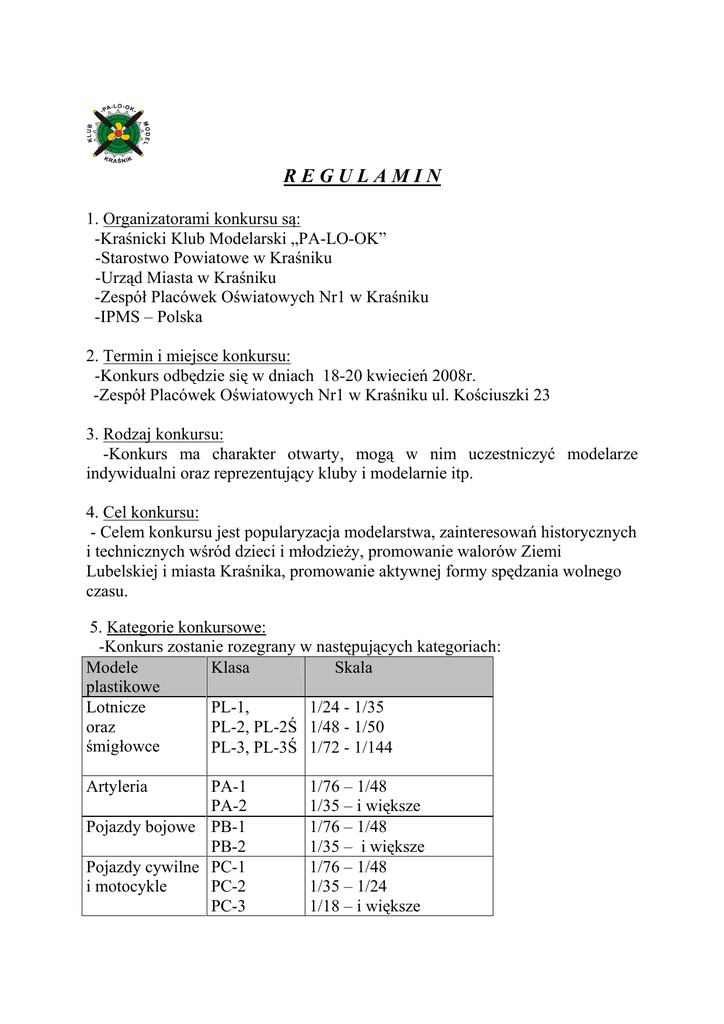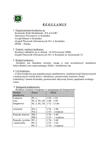 REGULAMIN 1. Organizatorami konkursu są: -Kraśnicki Klub Modelarski „PA-LO-OK” -Starostwo Powiatowe w Kraśniku -Urząd Miasta w Kraśniku -Zespół Placówek Oświatowych Nr1 w Kraśniku -IPMS – Polska 2. Termin i miejsce konkursu: -Konkurs odbędzie się w dniach 18-20 kwiecień 2008r. -Zespół Placówek Oświatowych Nr1 w Kraśniku ul. Kościuszki 23 3. Rodzaj konkursu: -Konkurs ma charakter otwarty, mogą w nim uczestniczyć modelarze indywidualni oraz reprezentujący kluby i modelarnie itp. 4. Cel konkursu: - Celem konkursu jest popularyzacja modelarstwa, zainteresowań historycznych i technicznych wśród dzieci i młodzieży, promowanie walorów Ziemi Lubelskiej i miasta Kraśnika, promowanie aktywnej formy spędzania wolnego czasu. 5. Kategorie konkursowe: -Konkurs zostanie rozegrany w następujących kategoriach: Modele Klasa Skala plastikowe Lotnicze PL-1, 1/24 - 1/35 oraz PL-2, PL-2Ś 1/48 - 1/50 śmigłowce PL-3, PL-3Ś 1/72 - 1/144 Artyleria PA-1 PA-2 Pojazdy bojowe PB-1 PB-2 Pojazdy cywilne PC-1 i motocykle PC-2 PC-3 1/76 – 1/48 1/35 – i większe 1/76 – 1/48 1/35 – i większe 1/76 – 1/48 1/35 – 1/24 1/18 – i większe Żaglowce PZ-1 PZ-2 Statki (okręty) PM-1 motorowe PM-2 Figurki PF-1 PF-2 KARTONOWE KLASA 1/200 – i większe 1/250 – i mniejsze 1/200 – i większe 1/250 – i mniejsze 1/24 –1/35 1/9 – 1/16 RODZAJ Lotnicze Samoloty śmigłowe jednosilnikowe Samoloty śmigłowe wielosilnikowe Samoloty odrzutowe Śmigłowce Kosmiczne Kołowe Gąsienicowe Szynowe (także pociągi pancerne) Kołowe i gąsienicowe Żaglowce Motorowce KS-1 KS-2 KO KŚ KKR Pojazdy KK wojskowe KG Pojazdy cywilne KSZ Statki Budowle Figurki Dioramy: lotnicze kołowe morskie INNE (otwarta) Przekroje Modele od podstaw KC KŻ KM KB KF DL DK DM KLASA PR MP Wykonanie z dowolnych materiałów, powierzchnia i skala dowolna. RODZAJ Modele plastikowe i kartonowe, skala dowolna Materiał, skala dowolny, dopuszcza się użycie w modelu 10% części fabrycznych GRUPY WIEKOWE: M - młodzik do 12 lat (urodzeni w roku 1996 i później), J - junior 13 - 17 lat (urodzeni w latach 1991 - 1995), S - senior, powyżej 18 lat (urodzenie do 1990 r.). 6. Uczestnictwo w konkursie: -W konkursie może uczestniczyć modelarz wystawiający dowolną ilość własnoręcznie wykonanych modeli w każdej klasie, -Dokumentacja nie jest obowiązkowa, w przypadku, gdy zawodnik chce uzyskać większą ilość punktów w konkursie, wymagany jest opis wykonanych przeróbek elementów, schematy malowań, foto, co najmniej rysunki w trzech rzutach i instrukcji zestawu, nie koniecznie oryginał. -Konkurs w każdej klasie i kategorii wiekowej zostanie rozegrany przy udziale minimum pięciu modeli. -W przypadku niewystarczającej liczby modeli, organizatorzy zastrzegają sobie prawo do łączenia kategorii wiekowych i konkursowych, -W przypadku wątpliwości komisji sędziowskiej co do autorstwa modelu, sędziowie przewiduję możliwość przeprowadzenia rozmowy wyjaśniającej z zawodnikiem. 7. Zgłoszenia do konkursu: -Udział do konkursu można zgłosić w dniu dostarczenia modeli. -Karty zgłoszeniowe będą wypełniane przy dostarczeniu modeli. - Karty zgłoszeniowe (startowe) niewyraźnie wypełnione będą dyskwalikowały dany model. -W zgłoszeniu obowiązkowe będą następujące informacje: nazwisko, imię, wiek, młodzik do 12 lat, junior od 13 do 17 lat, senior od 18 lat -miejscowość lub klub. -Typ modelu, do jakiej klasy należy model, skala, zestaw. Szczegóły w karcie zgłoszenia -Nie obowiązkowe; adres zamieszkania. 8. Przyjmowanie modeli: -Zgłoszone modele przyjmowane będą w dniach 18.04.2008 od godz. 12.00 do 18.00, 19.04.2007 r. od godz. 9.00 do 13.00. Inne godz. ustalić z Tomaszem. Frączkiem. kom. 0-691 377 763 [email protected] UWAGA: Modelarze którzy deklarują chęć przenocowania w Kraśniku z soboty na niedziele, modele będzie można dostarczyć w sobotę bezpośrednio przed oceną modeli, ale nie później jak do godz. 13.00. -Nocleg zapewniony jest z soboty na niedziele, na terenie szkoły, prosimy zaopatrzyć się w koce lub śpiwory -Organizatorzy nie odpowiadają za uszkodzenia modeli nieprawidłowym ich pakowaniem i transportem. 9. Opłata startowa: Będzie pobierana tylko od seniorów w wysokości 10zł. 10. Ocena modeli: -Modele oceni i podziału nagród dokona Komisja Sędziowska powołana przez Organizatorów (sędzia główny). 11. Nagrody i wyróżnienia: -Zdobywcy trzech pierwszych miejsc w odpowiednich kategoriach otrzymają nagrody, medale, dyplomy, -Przewidziane są wyróżnienia i puchary, -Każdy z uczestników otrzyma dyplom pamiątkowy za uczestnictwo. 12. Wystawę modeli i zakończenie konkursu: -Zakończenie konkursu nastąpi 20 kwietnia 2007. o godz.13.00. 13. Adresy i telefony kontaktowe: Zespół Placówek Oświatowych Nr 1 ul. Kościuszki 23 23-200 Kraśnik tel.: 0-81 825 24 25 K.K.M. ,,PA-LO-OK” ul. Szewska 10b 23-200 Kraśnik kom. 0-691 377 763 e-mail. [email protected] Zapraszają organizatorzy. W imieniu organizatorów Tomasz Frączek