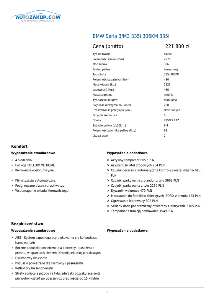 BMW Seria 3/M3 335i 306KM 335i Cena (brutto): 221 800 zł Typ nadwozia coupe Pojemność silnika (ccm) 2979 Moc silnika 306 Rodzaj paliwa benzynowy Typ silnika 335i 306KM Pojemność bagażnika (litry) 430 Masa własna (kg.) 1525 Ładowność (kg.) 480 Klasa/segment średnia Typ skrzyni biegów manualna Prędkość maksymalna (km/h) 250 Częstotliwość przeglądu (km.) Brak danych Przyspieszenie (s.) 5 Opony 225/45 R17 Zużycie paliwa (l/100km.) 8.4 Pojemność zbiornika paliwa (litry) 63 Liczba drzwi 2 Komfort Wyposażenie standardowe Wyposażenie dodatkowe ✓ 4 siedzenia ✕ Aktywny tempomat 6057 PLN ✓ Funkcja FOLLOW ME HOME ✕ Asystent świateł drogowych 704 PLN ✓ Kierownica wielofunkcyjna ✕ Czujnik deszczu z automatyczną kontrolą świateł mijania 610 PLN ✓ Klimatyzacja automatyczna ✕ Czujniki parkowania z przodu i z tyłu 3662 PLN ✓ Podgrzewane dysze spryskiwaczy ✕ Czujniki parkowania z tyłu 2254 PLN ✓ Wspomaganie układu kierowniczego ✕ Dywaniki welurowe 470 PLN ✕ Mocowanie do fotelików dziecięcych ISOFIX z przodu 423 PLN ✕ Ogrzewanie kierownicy 892 PLN ✕ Szklany dach panoramiczny otwierany elektrycznie 5165 PLN ✕ Tempomat z funkcją hamowania 1549 PLN Bezpieczeństwo Wyposażenie standardowe Wyposażenie dodatkowe ✓ ABS - System zapobiegający blokowaniu się kół podczas hamowania\n ✓ Boczne poduszki powietrzne dla kierowcy i pasażera z przodu, w oparciach siedzeń (chroniąceklatkę piersiową)\n ✓ Dwutonowy klakson\n ✓ Poduszki powietrzne dla kierowcy i pasażera\n ✓ Reflektory biksenonowe\n ✓ Strefy zgniotu z przodu i z tyłu, zderzaki odzyskujące swój pierwotny kształt po uderzeniuz prędkością do 15 km/h\n 1 ✓ Światła do jazdy dziennej\n ✓ Trójkąt ostrzegawczy i apteczka\n ✓ Tryb kontroli trakcji (DTC)\n ✓ Układ dynamicznej kontroli stabilności (DSC) z systemem automatycznej kontroli trakcji (ASC+T)\n Dodatki Wyposażenie standardowe Wyposażenie dodatkowe ✓ 6-biegowa manualna skrzynia biegów ✕ Aktywny układ kierowniczy 6104 PLN ✓ Aerodynamiczne okrągłe osłony lusterek zewnętrznychw ✕ Diodowe elementy świetlne 1409 PLN kolorze karoserii ✓ Aktywne zagłówki z przodu, regulowane, automatyczny ✕ Dodatkowe gniazda 12V 188 PLN zaciskna wypadek zderzenia ✓ Atrapa chłodnicy z chromowanym grillem i ✕ Dostęp komfortowy 3240 PLN chromowanymobramowaniem ✓ Bezpośredni wtrysk benzyny High Precision Injection ✕ Hak holowniczy ze zdejmowaną kulą 4132 PLN ✓ Chromowana listwa boczna ✕ Interfejs audio USB 1409 PLN ✓ Chromowane obramowania szyb ✕ Internet 470 PLN ✓ Chromowane progi drzwiowe z emblematem BMW ✕ Lakier metalizowany 3944 PLN ✓ Czujnik kolizji ✕ Listwy ozdobne czarne błyszczące 704 PLN ✓ Dynamiczne światła stop, intensywność świateł ✕ Listwy ozdobne drewno szlachetne bambus 2301 PLN dostosowanado siły hamowania ✓ Elektryczna regulacja foteli z pamięcią ustawień ✕ Listwy ozdobne drewno szlachetne korzeń orzecha 2301 PLN ✓ Elektryczne szyby z przodu i z tyłu ✕ Listwy ozdobne drewno szlachetne orzech jasny 2301 PLN ✓ Elektryczny podajnik pasa bezpieczeństwa dla kierowcy i ✕ Listwy ozdobne szlifowane aluminium 1690 PLN pasażeraz przodu ✓ Elementy zewnętrzne w kolorze karoserii ✕ Lusterka zewnętrzne i wewnętrzne ✓ Gniazdo AUX-IN ✕ Obramowania Shadow Line BMW Individual,na wysoki połysk ✓ Hamulce tarczowe z przodu i z tyłu, wentylowane i ✕ Obręcze kół ze stopu lekkiego Star Spoke 189z ogumieniem przyciemnianeautomatycznie 2723 PLN 2441 PLN perforowane mieszanym, 18 cali 3052 PLN ✓ Immobilizer ✕ Obręcze kół ze stopu lekkiego Star Spoke 193 Mz ✓ Komfortowe wsiadanie dla kierowcy i pasażera ✕ Obręcze kół ze stopu lekkiego Star Spoke 230z ogumieniem ✓ Lakier niemetalizowany ✕ Obręcze kół ze stopu lekkiego V Spoke 342z ogumieniem ogumieniem mieszanym, 18 cali 0 PLN mieszanym, 19 cali 6197 PLN mieszanym, 18 cali 3052 PLN ✓ Listwy ozdobne satynowo srebrne mat ✕ Ogrzewanie foteli przednich 1737 PLN ✓ Lusterka zewnętrzne regulowane elektrycznie, ogrzewane, ✕ Ogrzewanie postojowe sterowane pilotem 6526 PLN asferyczne ✓ Mocowanie fotelików dziecięcych ISOFIX na zewnętrznych ✕ Podparcie lędźwiowe w fotelach przednich 1455 PLN siedzeniach tylnich ✓ Norma emisji spalin Euro 5 ✕ Podsufitka BMW Individual w kolorze antracytowym 1127 ✓ Obręcze kół ze stopu lekkiego Star Spoke 340z ogumieniem ✕ Podłokietnik PLN z przodu, przesuwany 704 PLN mieszanym, 17 cali ✓ Oparcie kanapy tylnej dzielone asymetrycznie (60:40); dla ✕ Połączenie tkaniny i Alcantary Blue Shadow 0 PLN M3o zredukowanej masie 2 ✓ Opony z funkcją jazdy awaryjnej Runflat z czujnikiem ✕ Połączenie tkaniny i skóry Pearlpoint 3709 PLN uszkodzenia opony ✓ Oświetlenie powitalne, światła obrysowe z boku i światła ✕ Przygotowanie do telefonu 1268 PLN tylneaktywowane przyciskiem otwórz w pilocie radiowym ✓ Osłony przeciwsłoneczne z podświetlanymi lusterkami do ✕ Przygotowanie do telefonu komórkowego ze złączem makijażu Bluetooth 3615 PLN ✓ Oznaczenie modelu ✕ Przygotowanie do zmieniarki CD 329 PLN ✓ Pakiet dla niepalących z otwartym schowkiem z przodu ✕ Radio BMW Professional 986 PLN konsoli centralnej ✓ Pakiet serwisowy BMW Service Inclusive 5 lat / 100 000 ✕ Reflektory adaptacyjne 2113 PLN km,pokrywa koszty serwisowania oraz robociznę ✓ Poduszki powietrzne chroniące głowę z przodu i z tyłu ✕ Rękaw na narty 939 PLN ✓ Podłokietnik centralny z tyłu, zawiera 2 uchwyty na napoje ✕ Rolety przeciwsłoneczne dla szyb tylnych ✓ Podłokietnik przedni w konsoli centralnej, składany, ze ✕ Rozszerzenie interfejsu audio o telefony komórkowe 470 PLN bocznychpodnoszone i opuszczane ręcznie 1596 PLN schowkiem ✓ Pojedyncze okrągłe końcówki układu wydechowego, matowy ✕ Sportowa automatyczna skrzynia biegów z podwójnym chrom,z lewej i z prawej strony sprzęgłem 11268 PLN