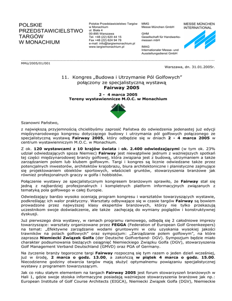 POLSKIE PRZEDSTAWICIELSTWO TARGÓW W MONACHIUM Polskie Przedstawicielstwo Targów w Monachium ul. Biała 4 00-895 Warszawa Tel. +48 (22) 620 44 15 Fax +48 (22) 624 94 78 e-mail: [email protected] www.targiwmonachium.pl MMG Messe München GmbH MESSE MÜNCHEN INTERNATIONAL GHM Gesellschaft für Handwerksmessen mbH IMAG Internationaler Messe- und Ausstellungsdienst GmbH …………………………………………………………………………………………………………………………………………………………….... MMü/2005/01/001 Warszawa, dn. 31.01.2005r. 11. Kongres „Budowa i Utrzymanie Pól Golfowych” połączony ze specjalistyczną wystawą Fairway 2005 2 - 4 marca 2005 Tereny wystawiennicze M.O.C. w Monachium Szanowni Państwo, z największą przyjemnością chcielibyśmy zaprosić Państwa do odwiedzenia jedenastej już edycji międzynarodowego kongresu dotyczącego budowy i utrzymania pól golfowych połączonego ze specjalistyczną wystawą Fairway 2005, który odbędzie się w dniach 2 - 4 marca 2005 w centrum wystawienniczym M.O.C. w Monachium. Z ok. 120 wystawcami z 10 krajów świata i ok. 2.400 odwiedzającymi (w tym ok. 23% udział odwiedzających spoza Niemiec) Fairway jest niewątpliwie jednym z ważniejszych spotkań tej części międzynarodowej branży golfowej, która związana jest z budową, utrzymaniem a także zarządzaniem polem lub klubem golfowym. Targi i kongres są licznie odwiedzane także przez potencjalnych inwestorów, architektów krajobrazu, biura architektoniczne i planistyczne zajmujące się projektowaniem obiektów sportowych, właścicieli gruntów, stowarzyszenia branżowe jak również profesjonalnych graczy w golfa i hobbistów. Połączenie wystawy ze specjalistycznym kongresem branżowym sprawiło, że Fairway stał się jedną z najbardziej profesjonalnych i kompletnych platform informacyjnych związanych z tematyką pola golfowego w całej Europie. Odwiedzający bardzo wysoko oceniają program kongresu i warsztatów towarzyszących wystawie, podkreślając ich walor praktyczny. Warsztaty odbywające się w czasie targów Fairway są bowiem prowadzone przez najwyższej klasy ekspertów branżowych, którzy nie tylko przekazują uczestnikom swoje doświadczenie, ale także zachęcają do wymiany poglądów i konstruktywnej dyskusji. Już pierwszego dnia wystawy, w ramach programu ramowego, odbędą się 2 całodniowe imprezy towarzyszące: warsztaty organizowane przez FEGGA (Federation of European Golf Greenkeepers) na temat: „Efektywne zarządzanie wodami gruntowymi w celu uzyskania wysokiej jakości trawników na polach golfowych” oraz sympozjum: „Zarządzanie polem golfowym”, na które zaprasza Niemiecki Związek Golfa (der Deutsche Golfverband- DGV). Sympozjum będzie miało charakter podsumowania bieżących osiągnięć Niemieckiego Związku Golfa (DGV), stowarzyszenia Golf Management Verband Deutschland (GMVD) oraz PGA of Germany. Na życzenie branży tegoroczne targi Fairway rozpoczną się tym razem o jeden dzień wcześniej, już w środę, 2 marca o godz. 13.00, a zakończą w piątek 4 marca o godz. 15.00. Niecodzienne godziny otwarcia targów mają służyć optymalnemu powiązaniu specjalistycznej wystawy z programem towarzyszącym. Jak co roku stałym elementem na targach Fairway 2005 jest forum stowarzyszeń branżowych w Hali 1, gdzie swoje stoiska informacyjne posiadają ważniejsze stowarzyszenia branżowe jak np.: European Institute of Golf Course Architects (EIGCA), Niemiecki Związek Golfa (DGV), Niemieckie Stowarzyszenie Greenkeeperów (der Greenkeeper-Verband Deutschland, GVD), Golf Management Verband Deutschland (GMVD) oraz Austriacki Związek Golfa (ÖGV). Ceny biletów wstępu na wystawę + kongres: Bilet jednodniowy (wystawa + warsztaty FEGGA): 15 EUR/ szt. Bilet na całe targi (wystawa + warsztaty FEGGA): 20 EUR/ szt. Katalog wystawców: 7 EUR + 22% VAT /szt. Wszystkich zainteresowanych zakupem biletów wstępu na targi i kongres prosimy o wypełnienie i odesłanie faksem poniższego formularza zamówienia. Szczegółowe informacje na temat targów Fairway 2005 oraz towarzyszącego im kongresu mogą Państwo uzyskać na stronie www.fairway.de lub w Polskim Przedstawicielstwie Targów w Monachium, tel. 22/ 620 44 15, faks: 22/ 624 94 78, e-mail: [email protected] Polskie Przedstawicielstwo nie tylko prowadzi przedsprzedaż biletów wstępu i katalogów, ale również pomaga w organizacji wyjazdu na targi oraz rezerwacji hoteli w Monachium. Z poważaniem Joanna Biernacka Project Manager Polskie Przedstawicielstwo Targów w Monachium …………………………………………………………………………………………………………………………………………………………….... Zamówienie BILET JEDNODNIOWY /15 EUR ilość: ............. BILET NA CAŁE TARGI /20 EUR ilość: ............ KATALOG /7 EUR + 22% vat ilość: ............ (wystawa + warsztaty FEGGA) (wystawa + warsztaty FEGGA) Zamówienia prosimy przesłać faksem na nr: 22/ 624 94 78 lub e-mailem na adres: [email protected] ; W zamówieniach składanych drogą elektroniczną bardzo prosimy o podanie danych potrzebnych do wystawienia faktury. • po otrzymaniu zamówienia Przedstawicielstwo wystawia Państwu fakturę pro forma, która jest przesyłana e-mailem, na adres podany przez Państwa w poniższym formularzu; • faktury są wystawiane w złotówkach wg średniego kursu NBP obowiązującego w dniu wystawienia faktury pro forma; Warunkiem wysłania biletów jest dokonanie przez Państwa wpłaty na podstawie przesłanej przez Przedstawicielstwo faktury pro forma. Bilety są wysyłane pocztą poleconą wraz z oryginałem faktury. Bardzo prosimy o przesyłanie kopii potwierdzenia wpłaty faksem na nr: 22/624 94 78 . • do biletów wstępu dołączany jest bilet uprawniający do bezpłatnego korzystania z komunikacji miejskiej w Monachium w okresie ważności biletu wstępu 