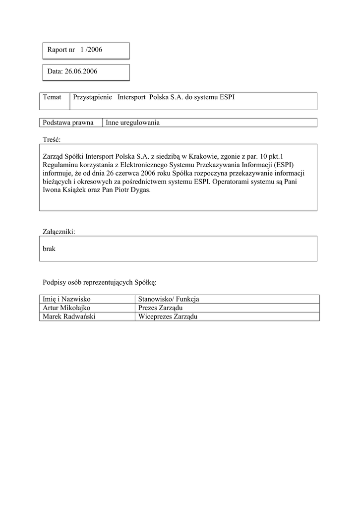 Raport nr 1 /2006 Data: 26.06.2006 Temat Przyst pienie Intersport Polska S.A. do systemu ESPI Podstawa prawna Inne uregulowania Tre : Zarz d Spó!ki Intersport Polska S.A. z siedzib w Krakowie, zgonie z par. 10 pkt.1 Regulaminu korzystania z Elektronicznego Systemu Przekazywania Informacji (ESPI) informuje, -e od dnia 26 czerwca 2006 roku Spó!ka rozpoczyna przekazywanie informacji bie- cych i okresowych za po rednictwem systemu ESPI. Operatorami systemu s Pani Iwona Ksi -ek oraz Pan Piotr Dygas. Za! czniki: brak Podpisy osób reprezentuj cych Spó!k3: Imi3 i Nazwisko Artur Miko!ajko Marek Radwa8ski Stanowisko/ Funkcja Prezes Zarz du Wiceprezes Zarz du