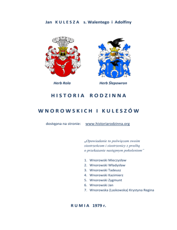 Jan K U L E S Z A s. Walentego i Adolfiny Herb Rola Herb Ślepowron HISTORIA RODZINNA WNOROWSKICH I KULESZÓW dostępna na stronie: www.historiarodzinna.org „Opowiadanie to poświęcam swoim siostrzeńcom i siostrzenicy z prośbą o przekazanie następnym pokoleniom” 1. 2. 3. 4. 5. 6. 7. Wnorowski Mieczysław Wnorowski Władysław Wnorowski Tadeusz Wnorowski Kazimierz Wnorowski Zygmunt Wnorowski Jan Wnorowska (Laskowska) Krystyna Regina R U M I A 1979 r. Historia Rodzinna Wnorowskich i Kuleszów Wieś Wnory Pażochy jest wsią niewielką, położoną w byłym powiecie Wysokie Mazowieckie, byłe województwo białostockie, obecnie łomżyńskie. Wieś ta jest jedną z siedmiu wsi o nazwie Wnory. Przez wieś tę przechodził gościniec tak zwany trakt z Mazowsza przez Podlasie aż na Litwę. Liczni posłowie przejeżdżali tym gościńcem. Na południe od wsi były pastwiska. Na południowym-zachodzie był las. Składał się on z przewagą drzew liściastych, ponieważ był to teren podmokły. W lesie tym spotkać można było różne gatunki krzewów, jak maliny, porzeczki i inne. Występowały też rośliny o smacznych, czerwonych jagodach zwanych kamionkami, a które zdobiły teren swym rubinowym wyglądem. A ile tam było ptactwa! Świergot ptaków, zwłaszcza wiosną przypominał prawdziwą kapelę połączoną z rechotaniem żab. Na wschód i północ były pola uprawne. Dzieliły się one na trzy części, tak zwaną trójpolówkę. Na jednej części rosła pszenica i żyto; na drugiej – uprawiano zboża jare, jak jęczmień, owies i sadzono ziemniaki. Pole na trzeciej części odpoczywało i był to tak zwany ugór. Na ugorze tym pasły się już od wczesnej wiosny krowy, owce, gęsi, a nawet świnie. Gdy zasiane zostały zboża jare i posadzono ziemniaki, ugór był zaorywany i był przygotowywany pod uprawę żyta i pszenicy. We Wnorach Pażochach gospodarstwo rolne WNOROWSKICH miało przeszło 200 mórg dużych (300 mórg prętowych). Na tym gospodarstwie gospodarzył i żył Melchior WNOROWSKI z synem Józefem. W roku 1801 przychodzi na świat jeszcze jeden syn, któremu dano na imię GABRIEL. Chłopiec rósł zdrowo i rozwijał się dobrze, a w gospodarstwie WNOROWSKICH życie toczyło się normalnym trybem. Siano, koszono, młócono i tak rok po roku schodził. Chłopiec rósł i na swój wiek był nadzwyczaj rozwinięty. Zaczynał gromadzić wokół siebie chłopców – kolegów w swoim wieku i starszych. Organizował zabawy w wojsko, starał się ich zainteresować. Gabrielem interesowali się i starsi ludzie i twierdzili, że z niego wyrośnie jakiś wojskowy. Naukę pobierał u krewnego, który przyjeżdżał z Warszawy. Krewny twierdził, że Gabriel jest bardzo zdolny. Namawiał zatem ojca Gabriela, aby go oddał na naukę do Warszawy. Rodzice chłopca zgodzili się i przygotowali dla niego wyprawkę. Po ukończonych pracach polowych, a było to późną jesienią Gabriel wraz z ojcem Melchiorem i kuzynem wyruszył do Warszawy. W Warszawie się zadomowił. Wyniki w nauce osiągał bardzo dobre. Ojciec tęsknił za synem. Gdy nadeszła pora wypoczynku po przerobionym materiale, ojciec przybywał do syna do Warszawy i zabierał go do rodzinnej wsi 2 Historia Rodzinna Wnorowskich i Kuleszów Wnory Pażochy. Spotkawszy się przedtem z nauczycielami Gabriela, dziękował im serdecznie za nauczanie i wychowywanie syna. Będąc w Warszawie nabył ogłady wielkomiejskiej. Był dobrze wychowany. Przechodząc koło znajomych, się im kłaniał. Z kolegami z rodzinnej wsi rozmawiał na różne tematy i nie starał się wśród nich wywyższać. Po zasłużonym wypoczynku w rodzinnej wsi nadszedł czas by wracać do Warszawy i dalej się uczyć. Na nauce zeszło mu kilka ładnych lat. Wyrósł i zmężniał. W roku 1819 otrzymał wiadomość o śmierci ojca. Matka pisała, żeby natychmiast wracał i zajął się gospodarstwem, gdyż jego brat Józef jest słabego zdrowia i nie może sam prowadzić gospodarstwa. Gabriel zmartwił się. Najgorsze to, że nie mógł dalej kontynuować nauki. Po rozważeniu sprawy, pożegnał się z profesorami, wrócił na wieś i zajął się gospodarstwem. Gospodarstwo to było zaniedbane. Wiadomo było, że ojciec przed śmiercią chorował, a jego brat Józef był słabego zdrowia. Myślał sobie od czego tu zacząć. Wziął ster swoje ręce i rozpoczął prowadzenie gospodarstwa. Brakowało mu pieniędzy. Nie upadał jednak na duchu. Organizował handlowe wyprawy do Warszawy. Wraz z innymi woził na sprzedaż zboże i inne produkty rolne, żeby zdobyć trochę pieniędzy. Inni mu odradzali, twierdząc, że takie wyprawy może przypłacić życiem, ponieważ grasują rabusie i nie jeden wpadł już w ich ręce. Przestrogi jego nie odstraszyły. Każda wyprawa do Warszawy kończyła się sukcesem. Wracał zdrowy i cały z całym utargiem. Handel zbożem szedł mu coraz lepiej, bo nawiązywał coraz to szersze kontakty z różnymi kupcami. Mimo śmierci ojca, w gospodarstwie zaczynało dziać się coraz lepiej. Sąsiedzi mówili, że taki sobie „studenciak”, a gospodarzyć to potrafi. Grzeczności i uprzejmości mu nie brakowało. Został przez wszystkich po lubiany. Nie tylko zajmował się pracą w polu, lecz także pomagał i matce przy pracach kuchennych. I tak rok po roku w gospodarstwie WNOROWSKICH było coraz lepiej i dostatniej. W 1827r. Umiera mu matka. Na Gabriela spada jeszcze większy ciężar. Musi się od tej pory zająć nie tylko pracą w polu, lecz także i w domu. Bratu Józefowi mimo, że zdrowie się poprawiło, ale nie można było na niego liczyć. Przeszło dwa lata był bez gospodyni. W końcu w 1829r. ożenił się Gabriel Wnorowski we wsi Grodzkie Stare z Adolfiną Grodzką. Ślub odbył się w Kuleszach Kościelnych bardzo uroczyście. Po ślubie Gabriel zabrał żonę do siebie tzn. do Pażoch. Tak to Gabriel uwolnił się od prac kuchennych. Teraz tymi sprawami zajmowała się jego żona. I teraz mógł je
