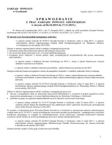 ZARZĄD POWIATU w Gryficach Gryfice, dnia 17.11.2015 r. S PRAW O Z DAN I E Z PRAC ZARZĄDU POWIATU GRYFICKIEGO w okresie od 06.10.2015 do 17.11.2015 r. W okresie od 6 października 2015 r. do 17 listopada 2015 r. odbyło się sześć posiedzeń Zarządu Powiatu Gryfickiego (06.10.2015, 09.10.2015, 13.10.2015, 21.10.2015, 28.10.2015, 12.11.2015 r.). W okresie tym Zarząd podjął następujące uchwały: - w sprawie zmiany uchwały Nr 59/20/15 Zarządu Powiatu w Gryficach z dnia 11 maja 2015 r. w sprawie zatwierdzenia arkusza organizacyjnego Zespołu Szkół Ponadgimnazjalnych im. Zbigniewa Herberta w Trzebiatowie na rok szkolny 2015/2016. Zmiany w arkuszu organizacyjnym szkoły wynikają z następujących przyczyn: udzielenia urlopu dla poratowania zdrowia dla jednego nauczyciela, nie utworzenia grupy policyjnej w kl. I Liceum Ogólnokształcącego, rezygnacji przez rodziców z dwóch godzin zajęć rewalidacyjnych przydzielonych dla ucznia nauczanego indywidualnie. - w sprawie zmian w budżecie Powiatu Gryfickiego na 2015 r., zmian w planie finansowym zwanym układem wykonawczym budżetu. - w sprawie zmian w układzie wykonawczym budżetu – planie finansowym powiatu na rok 2015. Niniejszą uchwałą Zarząd uszczegóławia zmiany do paragrafów dochodów i wydatków jednostek, które je realizują. - w sprawie zmian w budżecie Powiatu Gryfickiego na 2015 r., zmian w planie finansowym zwanym układem wykonawczym budżetu, w planie finansowym zadań z zakresu administracji rządowej i innych zadań zleconych ustawami. - w sprawie zmiany uchwały Nr 63/20/15 Zarządu Powiatu w Gryficach z dnia 11 maja 2015 r. w sprawie zatwierdzenia arkusza organizacyjnego Zespołu Szkół Ponadgimnazjalnych im. Wincentego Witosa w Płotach na rok szkolny 2015/2016. Zmiany w arkuszu organizacyjnym szkoły wynikają z następujących przyczyn: decyzji o uzupełnieniu etatu na stanowisku nauczyciela bibliotekarza w wymiarze 6 godzin tygodniowo przez nauczyciela zatrudnionego w Liceum Ogólnokształcącym im. Bolesława Chrobrego w Gryficach, podziału na grupy na zajęciach międzyoddziałowych na lekcjach wychowania fizycznego. - w sprawie zmiany uchwały Nr 33/15/15 Zarządu Powiatu w Gryficach z dnia 23 marca 2015 r. w sprawie ustalenia stawek dotacji dla niepublicznych oraz publicznych szkół i placówek oświatowych, prowadzonych przez osoby fizyczne i prawne w roku 2015. W związku z wykazaniem przez Prywatną Szkołę Zawodową w Gryficach w miesięcznym arkuszu informacyjnym według stanu na 01.10.2015 r. ucznia posiadającego orzeczenie poradni psychologiczno - pedagogicznej o potrzebie kształcenia specjalnego ze względu na niepełnosprawność: uczeń niesłyszący, zaistniała konieczność ustalenia wysokości stawki dotacji na ucznia posiadającego powyższy rodzaj niepełnosprawności. - w sprawie zmiany uchwały Nr 62/20/15 Zarządu Powiatu w Gryficach z dnia 11 maja 2015 r. w sprawie zatwierdzenia arkusza organizacyjnego Młodzieżowego Ośrodka Wychowawczego im. Janusza Korczaka w Rewalu na rok szkolny 2015/2016. Zmiana uchwały wynika z liczby grup wychowawczych Ośrodka. 1 - w sprawie zmiany uchwały Nr 62/20/15 Zarządu Powiatu w Gryficach z dnia 11 maja 2015 r. w sprawie zatwierdzenia arkusza organizacyjnego Młodzieżowego Ośrodka Wychowawczego im. Janusza Korczaka w Rewalu na rok szkolny 2015/2016. Zmiana uchwały spowodowana jest udzieleniem nauczycielowi urlopu dla poratowania zdrowia. - w sprawie zmian w budżecie Powiatu Gryfickiego na 2015 r., zmian w planie finansowym zwanym układem wykonawczym budżetu, w planie finansowym zadań z zakresu administracji rządowej i innych zadań zleconych ustawami. - w sprawie udzielenia Dyrektorowi Powiatowego Centrum Pomocy Rodzinie pełnomocnictwa do podpisywania wniosków, umów, porozumień partnerskich oraz podejmowania wszelkich czynności związanych z realizacją partnerskiego projektu pozakonkursowego w ramach Osi Priorytetowej VII, Działania 7.1 Regionalnego Programu Operacyjnego Województwa Zachodniopomorskiego na lata 2014 - 2020, współfinansowanego ze środków Europejskiego Funduszu Społecznego, Europejskiego Funduszu Rozwoju Regionalnego i budżetu państwa. - w sprawie zmian w budżecie Powiatu Gryfickiego na 2015 r., zmian w planie finansowym zwanym układem wykonawczym budżetu, w planie finansowym zadań z zakresu administracji rządowej i innych zadań zleconych ustawami. - w sprawie przyjęcia projektu budżetu Powiatu Gryfickiego na rok 2016 oraz wieloletniej prognozy finansowej Powiatu Gryfickiego na lata 2016-2030. - w sprawie udzielenia dotacji na rok budżetowy 2016 dla: Liceum Ogólnokształcącego Równe Szanse w Gryficach, Ośrodka Rehabilitacyjno – Edukacyjno – Wychowawczego w Gryficach, Prywatnej Szkoły Zawodowej w Gryficach, Liceum Ogólnokształcącego dla Dorosłych w Płotach, Liceum Ogólnokształcącego dla Dorosłych „TOM” w Gryficach, Liceum Ogólnokształcącego „TOM” w Gryficach, Policealnego Studium Zawodowego „TOM” w Gryficach, Policealnego Studium Ochrony Fizycznej Osób i Mienia „TOM” w Gryficach, Liceum Ogólnokształcącego „Privata Res” w Trzebiatowie, Zasadniczej Szkoły Zawodowej w Trzebiatowie Wojewódzkiego Zakładu Doskonalenia Zawodowego w Szczecinie. Wszystkie wnioski zostały złożone w terminie i spełniają warunki uprawniające do uzyskania dotacji. W trakcie posiedzeń Zarząd przyjął i skierował do Rady Powiatu następujące projekty uchwał: - w sprawie zmiany uchwały Nr III/24/14 Rady Powiatu Gryfickiego oraz zmian w budżecie powiatu na 2015 rok. - w sprawie zmiany uchwały Nr III/25/14 Rady Powiatu Gryfickiego w sprawie uchwalenia zmiany wieloletniej prognozy finansowej Powiatu Gryfickiego na 2015 – 2030. - w sprawie przyjęcia informacji o przebiegu wykonania budżetu za I półrocze 2015 roku, o kształtowaniu się wieloletniej prognozy finansowej za I półrocze 2015 roku. - w sprawie wyrażenia zgody na realizację projektu pozakonku