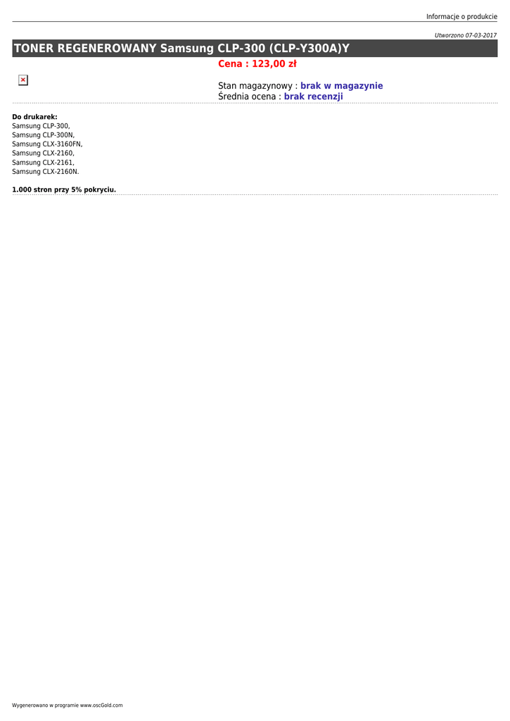 Informacje o produkcie Utworzono 07-03-2017 TONER REGENEROWANY Samsung CLP-300 (CLP-Y300A)Y Cena : 123,00 zł Stan magazynowy : brak w magazynie Średnia ocena : brak recenzji Do drukarek: Samsung CLP-300, Samsung CLP-300N, Samsung CLX-3160FN, Samsung CLX-2160, Samsung CLX-2161, Samsung CLX-2160N. 1.000 stron przy 5% pokryciu. Wygenerowano w programie www.oscGold.com
