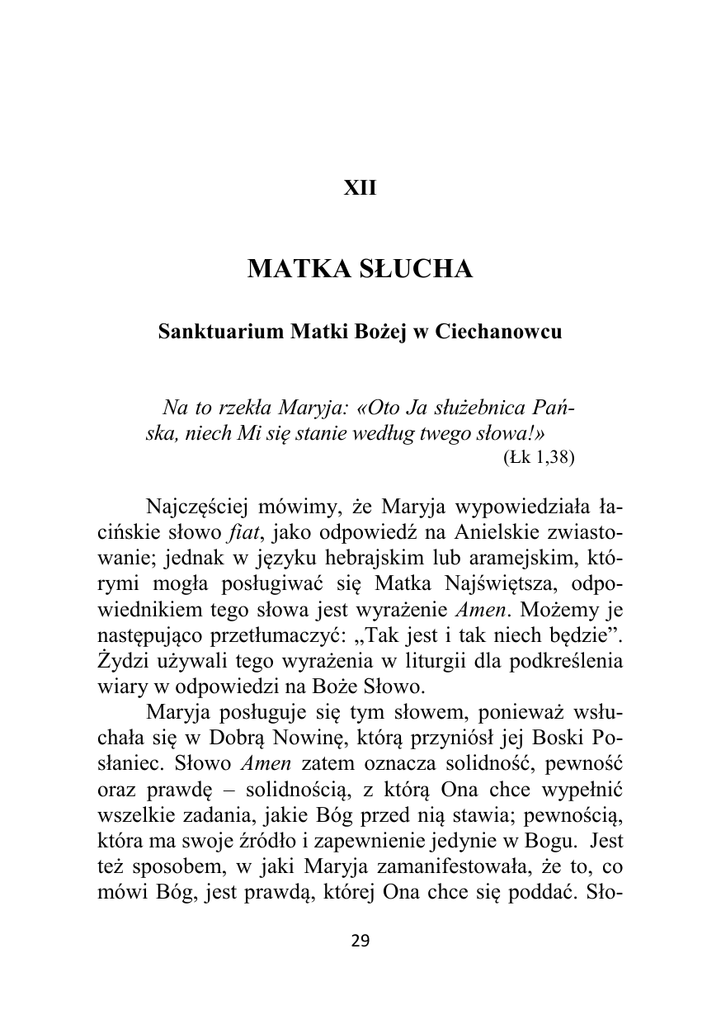 XII MATKA SŁUCHA Sanktuarium Matki Bożej w Ciechanowcu Na to rzekła Maryja: «Oto Ja służebnica Pańska, niech Mi się stanie według twego słowa!» (Łk 1,38) Najczęściej mówimy, że Maryja wypowiedziała łacińskie słowo fiat, jako odpowiedź na Anielskie zwiastowanie; jednak w języku hebrajskim lub aramejskim, którymi mogła posługiwać się Matka Najświętsza, odpowiednikiem tego słowa jest wyrażenie Amen. Możemy je następująco przetłumaczyć: „Tak jest i tak niech będzie”. Żydzi używali tego wyrażenia w liturgii dla podkreślenia wiary w odpowiedzi na Boże Słowo. Maryja posługuje się tym słowem, ponieważ wsłuchała się w Dobrą Nowinę, którą przyniósł jej Boski Posłaniec. Słowo Amen zatem oznacza solidność, pewność oraz prawdę – solidnością, z którą Ona chce wypełnić wszelkie zadania, jakie Bóg przed nią stawia; pewnością, która ma swoje źródło i zapewnienie jedynie w Bogu. Jest też sposobem, w jaki Maryja zamanifestowała, że to, co mówi Bóg, jest prawdą, której Ona chce się poddać. Sło29 wo Amen to powiedzieć Bogu „tak” i pragnąć, aby się to, co Pan zaplanował, wypełniło. Amen to szukać woli i działania Boga w moim życiu, nawet jeśli miałoby mnie ono wieść na krzyż. Amen, to nauczyć się od Maryi jak słuchać, gdy Bóg przemawia i jak Słowo Boże wypełniać. Każdego więc, kto tych słów moich słucha i wypełnia je, można porównać z człowiekiem roztropnym, który dom swój zbudował na skale. (Mt 7,24). W parafii ciechanowieckiej od 400 lat znajduje się piękny wizerunek Bogurodzicy z Dzieciątkiem. Przed nim przez wieki wypraszano za wstawiennictwem Maryi różne łaski u Boga. Przyszedł jednak czas, że obraz popadł w zapomnienie i trwało to blisko dwa stulecia. Dopiero niedawno została przywrócona pamięć i wskrzeszono kult, potwierdzony biskupimi koronami. Na wizerunku z Ciechanowca jest rzadko spotykany szczegół – Maryja ma odsłonięte prawe ucho, podkreślone także przez swą wielkość. Z dużym uchem kontrastują drobne usta. Maryja mniej mówi, a bardziej słucha. Czuła jest na głos Boży, ale także na wołanie swoich dzieci – braci i sióstr Jezusa. I drugi wyjątkowy detal – w prawej dłoni biała róża bez kolców, która jest symbolem bogactwa cnót. Tylko z takim „dorobkiem” człowiek jest w stanie usłyszeć głos Boga i wołanie ludzi. 30