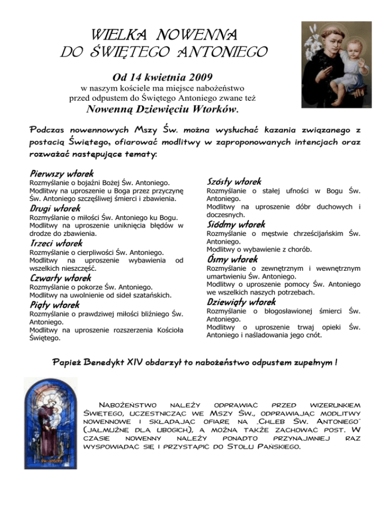 WIELKA NOWENNA DO ŚWIĘTEGO ANTONIEGO Od 14 kwietnia 2009 w naszym kościele ma miejsce naboŜeństwo przed odpustem do Świętego Antoniego zwane teŜ Nowenną Dziewięciu Wtorków. Podczas nowennowych Mszy Św. można wysłuchać kazania związanego z postacią Świętego, Świętego ofiarować modlitwy w zaproponowanych intencjach oraz rozważać następujące tematy: tematy: Pierwszy wtorek Rozmyślanie o bojaźni BoŜej Św. Antoniego. Modlitwy na uproszenie u Boga przez przyczynę Św. Antoniego szczęśliwej śmierci i zbawienia. wtorek Drugi wto rek Rozmyślanie o miłości Św. Antoniego ku Bogu. Modlitwy na uproszenie uniknięcia błędów w drodze do zbawienia. Trzeci wtorek Rozmyślanie o cierpliwości Św. Antoniego. Modlitwy na uproszenie wybawienia wszelkich nieszczęść. od Czwarty wtorek Rozmyślanie o pokorze Św. Antoniego. Modlitwy na uwolnienie od sideł szatańskich. Piąty wtorek Rozmyślanie o prawdziwej miłości bliźniego Św. Antoniego. Modlitwy na uproszenie rozszerzenia Kościoła Świętego. Szósty wtorek Rozmyślanie o stałej ufności w Bogu Św. Antoniego. Modlitwy na uproszenie dóbr duchowych i doczesnych. Siódmy wtorek Rozmyślanie o męstwie chrześcijańskim Św. Antoniego. Modlitwy o wybawienie z chorób. Ósmy wtorek Rozmyślanie o zewnętrznym i wewnętrznym umartwieniu Św. Antoniego. Modlitwy o uproszenie pomocy Św. Antoniego we wszelkich naszych potrzebach. Dziewiąty wtorek Rozmyślanie o błogosławionej śmierci Antoniego. Modlitwy o uproszenie trwaj opieki Antoniego i naśladowania jego cnót. Św. Św. Papież Papież Benedykt XIV obdarzył to to nabożeństwo odpustem zupełnym ! Nabożeństwo należy odprawiać przed wizerunkiem Świętego, uczestnicząc we Mszy Św., odprawiając modlitwy nowennowe i składając ofiarę na „Chleb Św. Antoniego” (jałmużnę dla ubogich), a można także zachować post. W czasie nowenny należy ponadto przynajmniej raz wyspowiadać się i przystąpić do Stołu Pańskiego.