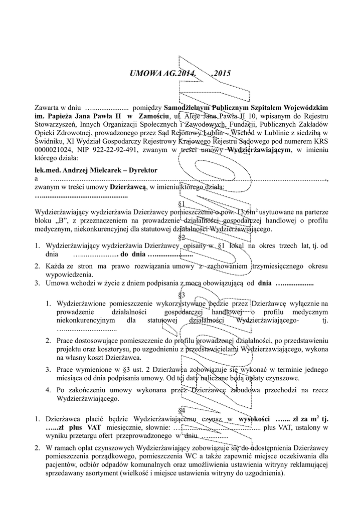 UMOWA AG.2014. .2015 Zawarta w dniu ….................... pomiędzy Samodzielnym Publicznym Szpitalem Wojewódzkim im. Papieża Jana Pawła II w Zamościu, ul. Aleje Jana Pawła II 10, wpisanym do Rejestru Stowarzyszeń, Innych Organizacji Społecznych i Zawodowych, Fundacji, Publicznych Zakładów Opieki Zdrowotnej, prowadzonego przez Sąd Rejonowy Lublin – Wschód w Lublinie z siedzibą w Świdniku, XI Wydział Gospodarczy Rejestrowy Krajowego Rejestru Sądowego pod numerem KRS 0000021024, NIP 922-22-92-491, zwanym w treści umowy Wydzierżawiającym, w imieniu którego działa: lek.med. Andrzej Mielcarek – Dyrektor a …..................................................................................................................................................., zwanym w treści umowy Dzierżawcą, w imieniu którego działa: …............................................... §1 Wydzierżawiający wydzierżawia Dzierżawcy pomieszczenie o pow. 13,6m 2 usytuowane na parterze bloku „B”, z przeznaczeniem na prowadzenie działalności gospodarczej handlowej o profilu medycznym, niekonkurencyjnej dla statutowej działalności Wydzierżawiającego. §2 1. Wydzierżawiający wydzierżawia Dzierżawcy opisany w §1 lokal na okres trzech lat, tj. od dnia …..................... do dnia …..................... 2. Każda ze stron ma prawo rozwiązania umowy z zachowaniem trzymiesięcznego okresu wypowiedzenia. 3. Umowa wchodzi w życie z dniem podpisania z mocą obowiązującą od dnia …................. §3 1. Wydzierżawione pomieszczenie wykorzystywane będzie przez Dzierżawcę wyłącznie na prowadzenie działalności gospodarczej handlowej o profilu medycznym niekonkurencyjnym dla statutowej działalności Wydzierżawiającegotj. …............................. 2. Prace dostosowujące pomieszczenie do profilu prowadzonej działalności, po przedstawieniu projektu oraz kosztorysu, po uzgodnieniu z przedstawicielami Wydzierżawiającego, wykona na własny koszt Dzierżawca. 3. Prace wymienione w §3 ust. 2 Dzierżawca zobowiązuje się wykonać w terminie jednego miesiąca od dnia podpisania umowy. Od tej daty naliczane będą opłaty czynszowe. 4. Po zakończeniu umowy wykonana przez Dzierżawcę zabudowa przechodzi na rzecz Wydzierżawiającego. §4 1. Dzierżawca płacić będzie Wydzierżawiającemu czynsz w wysokości ….... zł za m2 tj. …...zł plus VAT miesięcznie, słownie: …............................................ plus VAT, ustalony w wyniku przetargu ofert przeprowadzonego w dniu …........... 2. W ramach opłat czynszowych Wydzierżawiający zobowiązuje się do udostępnienia Dzierżawcy pomieszczenia porządkowego, pomieszczenia WC a także zapewnić miejsce oczekiwania dla pacjentów, odbiór odpadów komunalnych oraz umożliwienia ustawienia witryny reklamującej sprzedawany asortyment (wielkość i miejsce ustawienia witryny do uzgodnienia). 3. Ustalony czynsz płatny będzie miesięcznie, w terminie 30 dni od daty wystawienia faktury, w kasie lub na konto Wydzierżawiającego. 4. W razie zwłoki w uiszczeniu należności, Wydzierżawiającemu służy prawo doliczenia odsetek ustawowych. 5. Ustalona kwota czynszu wzrasta o wskaźnik inflacji ogłaszany przez GUS na koniec roku, bez konieczności wypowiadania umowy, po pisemnym zawiadomieniu Dzierżawcy. Nowy czynsz naliczany będzie od 1 lutego kolejnego roku. 6. Zabezpieczeniem należności za ustalone opłaty jest weksel własny in blanco, złożony przez Dzierżawcę w dniu podpisania umowy. §5 Wszelkie opłaty z tytułu umowy ponosi Dzierżawca. §6 1. W przypadku zalegania z zapłatą czynszu na kwotę równą dwumiesięcznej stawce czynszu, Wydzierżawiający zastrzega sobie prawo natychmiastowego rozwiązania umowy dzierżawy bez wypowiedzenia oraz prawo uruchomienia weksla. 2. W przypadku rozwiązania umowy Dzierżawca zobowiązany jest opuścić przedmiot dzierżawy w wyznaczonym przez Wydzierżawiającego terminie. §7 Dzierżawca bierze pełną odpowiedzialność za : jakość świadczonych usług stan sanitarny obiektu i urządzeń utrzymanie porządku w zajmowanym pomieszczeniu przestrzeganie obowiązujących przepisów, w tym sanitarnych i bhp zabezpieczenie użytkowanego pomieszczenia i wyposażenia przed kradzieżą prowadzenie działalności w sposób zorganizowany, tzn. nie zakłócający rytmu pracy poszczególnym jednostkom szpitalnym. §8 Wyposażenie zajmowanego pomieszczenia leży po stronie Dzierżawcy. - §9 Dzierżawcy nie wolno wprowadzać żadnych zmian modernizacyjnych ani technicznych obiektu bez uzgodnień na piśmie od Dyrekcji Szpitala. §10 Dzierżawca zobowiązany jest pokryć wszelkie szkody powstałe z Jego winy lub z winy personelu. §11 Zobowiązuje się Dzierżawcę do przestrzegania zasad jakościowych obowiązujących w Szpitalu a określonych przez wdrożone Systemy Zarządzania: Jakością, Środowiskowego oraz BHP a) Należy : - przestrzegać wymagań prawnych ochrony środowiska i BHP w zakresie podpisanej ze Szpitalem umowy - posiadać wymagane prawem decyzje wynikające z ochrony środowiska - minimalizować ilości powstających odpadów - zabierać z terenu Szpitala wszelkie odpady powstałe w czasie świadczenia usług. b) Na terenie Szpitala nie wolno: - myć pojazdów i sprzętu - spalać odpadów - wylewać niebezpiecznych substancji do gleby lub do kanalizacji - wwozić jakichkolwiek odpadów. 2. W sytuacjach wątpliwych i nieokreślonych powyższymi zasadami należy zwracać się do Pełnomocnika ds. Systemu Zarządzania Środowiskowego oraz BHP. §12 Dzierżawca bez zgody Wydzierżawiającego nie może oddać przedmiotu dzierżawy osobie trzeciej do bezpłatnego używania ani go wydzierżawiać. §13 Dzierżawcę obowiązują i obciążają drobne naprawy wydzierżawianego pomieszczenia. §14 Dzierżawca upoważnia Wydzierżawiającego do wystawiania faktur VAT bez jego podpisu. §15 1. Każda zmiana postanowień niniejszej umowy wymaga 