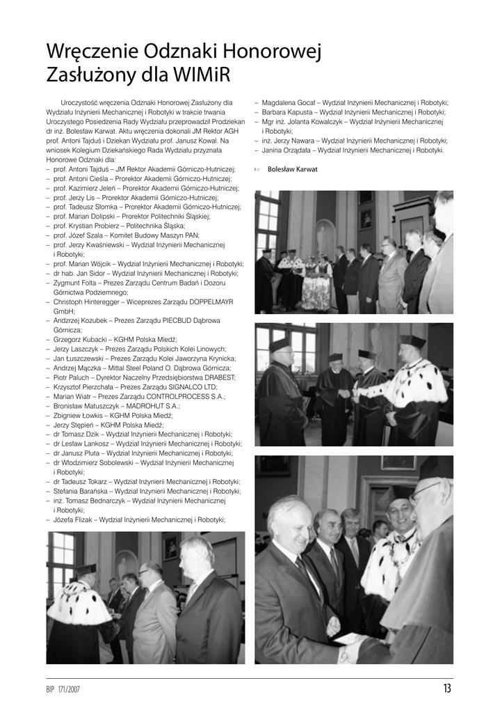 Wręczenie Odznaki Honorowej Zasłużony dla WIMiR Uroczystość wręczenia Odznaki Honorowej Zasłużony dla Wydziału Inżynierii Mechanicznej i Robotyki w trakcie trwania Uroczystego Posiedzenia Rady Wydziału przeprowadził Prodziekan dr inż. Bolesław Karwat. Aktu wręczenia dokonali JM Rektor AGH prof. Antoni Tajduś i Dziekan Wydziału prof. Janusz Kowal. Na wniosek Kolegium Dziekańskiego Rada Wydziału przyznała Honorowe Odznaki dla: – prof. Antoni Tajduś – JM Rektor Akademii Górniczo-Hutniczej; – prof. Antoni Cieśla – Prorektor Akademii Górniczo-Hutniczej; – prof. Kazimierz Jeleń – Prorektor Akademii Górniczo-Hutniczej; – prof. Jerzy Lis – Prorektor Akademii Górniczo-Hutniczej; – prof. Tadeusz Słomka – Prorektor Akademii Górniczo-Hutniczej; – prof. Marian Dolipski – Prorektor Politechniki Śląskiej; – prof. Krystian Probierz – Politechnika Śląska; – prof. Józef Szala – Komitet Budowy Maszyn PAN; – prof. Jerzy Kwaśniewski – Wydział Inżynierii Mechanicznej i Robotyki; – prof. Marian Wójcik – Wydział Inżynierii Mechanicznej i Robotyki; – dr hab. Jan Sidor – Wydział Inżynierii Mechanicznej i Robotyki; – Zygmunt Folta – Prezes Zarządu Centrum Badań i Dozoru Górnictwa Podziemnego; – Christoph Hinteregger – Wiceprezes Zarządu DOPPELMAYR GmbH; – Andzrzej Kozubek – Prezes Zarządu PIECBUD Dąbrowa Górnicza; – Grzegorz Kubacki – KGHM Polska Miedź; – Jerzy Laszczyk – Prezes Zarządu Polskich Kolei Linowych; – Jan Łuszczewski – Prezes Zarządu Kolei Jaworzyna Krynicka; – Andrzej Mączka – Mittal Steel Poland O. Dąbrowa Górnicza; – Piotr Paluch – Dyrektor Naczelny Przedsiębiorstwa DRABEST; – Krzysztof Pierzchała – Prezes Zarządu SIGNALCO LTD; – Marian Wiatr – Prezes Zarządu CONTROLPROCESS S.A.; – Bronisław Matuszczyk – MADROHUT S.A.; – Zbigniew Łowkis – KGHM Polska Miedź; – Jerzy Stępień – KGHM Polska Miedź; – dr Tomasz Dzik – Wydział Inżynierii Mechanicznej i Robotyki; – dr Lesław Lankosz – Wydział Inżynierii Mechanicznej i Robotyki; – dr Janusz Pluta – Wydział Inżynierii Mechanicznej i Robotyki; – dr Włodzimierz Sobolewski – Wydział Inżynierii Mechanicznej i Robotyki; – dr Tadeusz Tokarz – Wydział Inżynierii Mechanicznej i Robotyki; – Stefania Barańska – Wydział Inżynierii Mechanicznej i Robotyki; – inż. Tomasz Bednarczyk – Wydział Inżynierii Mechanicznej i Robotyki; – Józefa Flizak – Wydział Inżynierii Mechanicznej i Robotyki; BIP 171 / 2007 – Magdalena Gocał – Wydział Inżynierii Mechanicznej i Robotyki; – Barbara Kapusta – Wydział Inżynierii Mechanicznej i Robotyki; – Mgr inż. Jolanta Kowalczyk – Wydział Inżynierii Mechanicznej i Robotyki; – inż. Jerzy Nawara – Wydział Inżynierii Mechanicznej i Robotyki; – Janina Orządała – Wydział Inżynierii Mechanicznej i Robotyki. Bolesław Karwat 13
