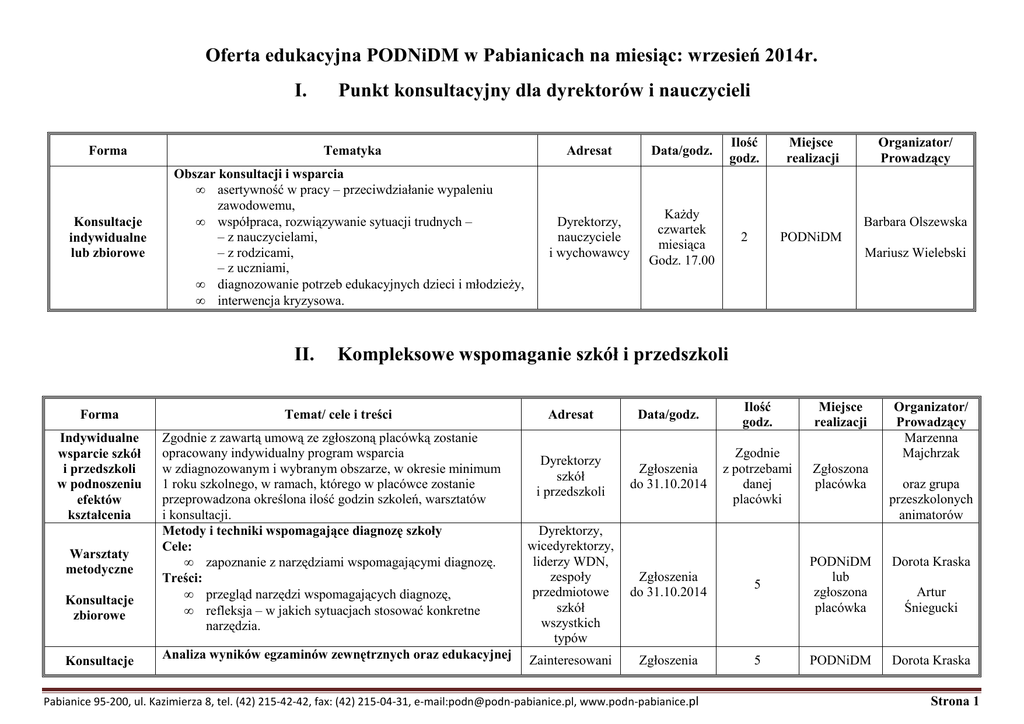 Oferta edukacyjna PODNiDM w Pabianicach na miesiąc: wrzesień 2014r. I. Punkt konsultacyjny dla dyrektorów i nauczycieli Forma Tematyka Adresat Data/godz. Ilość godz. Miejsce realizacji Konsultacje indywidualne lub zbiorowe Obszar konsultacji i wsparcia • asertywność w pracy – przeciwdziałanie wypaleniu zawodowemu, • współpraca, rozwiązywanie sytuacji trudnych – – z nauczycielami, – z rodzicami, – z uczniami, • diagnozowanie potrzeb edukacyjnych dzieci i młodzieży, • interwencja kryzysowa. Dyrektorzy, nauczyciele i wychowawcy Każdy czwartek miesiąca Godz. 17.00 2 PODNiDM II. Forma Indywidualne wsparcie szkół i przedszkoli w podnoszeniu efektów kształcenia Warsztaty metodyczne Konsultacje zbiorowe Konsultacje Organizator/ Prowadzący Barbara Olszewska Mariusz Wielebski Kompleksowe wspomaganie szkół i przedszkoli Temat/ cele i treści Zgodnie z zawartą umową ze zgłoszoną placówką zostanie opracowany indywidualny program wsparcia w zdiagnozowanym i wybranym obszarze, w okresie minimum 1 roku szkolnego, w ramach, którego w placówce zostanie przeprowadzona określona ilość godzin szkoleń, warsztatów i konsultacji. Metody i techniki wspomagające diagnozę szkoły Cele: • zapoznanie z narzędziami wspomagającymi diagnozę. Treści: • przegląd narzędzi wspomagających diagnozę, • refleksja – w jakich sytuacjach stosować konkretne narzędzia. Analiza wyników egzaminów zewnętrznych oraz edukacyjnej Adresat Data/godz. Ilość godz. Miejsce realizacji Dyrektorzy szkół i przedszkoli Zgłoszenia do 31.10.2014 Zgodnie z potrzebami danej placówki Zgłoszona placówka Dyrektorzy, wicedyrektorzy, liderzy WDN, zespoły przedmiotowe szkół wszystkich typów 5 PODNiDM lub zgłoszona placówka Dorota Kraska Zgłoszenia do 31.10.2014 Zainteresowani Zgłoszenia 5 PODNiDM Dorota Kraska Pabianice 95-200, ul. Kazimierza 8, tel. (42) 215-42-42, fax: (42) 215-04-31, e-mail:[email protected], www.podn-pabianice.pl Organizator/ Prowadzący Marzenna Majchrzak oraz grupa przeszkolonych animatorów Artur Śniegucki Strona 1 zbiorowe wartości dodanej – doskonalenie efektywności pracy szkoły Cele: • zapoznanie z terminologią stosowaną w analizie egzaminów zewnętrznych, • doskonalenie umiejętności analizy egzaminów zewnętrznych i EWD za pomocą różnych technik, • doskonalenie umiejętności formułowania wniosków do dalszej pracy, • podniesienie jakości kształcenia w szkołach. Treści: • analiza ilościowa, jakościowa i kontekstowa, • wskaźnik EWD, • terminy statystyczne stosowane w analizie egzaminów zewnętrznych, • wnioski do dalszej pracy. III. nauczyciele do 31.10.2014 lub zgłoszona placówka Zespoły przedmiotowe szkół Artur Śniegucki Konferencje (K), seminaria (S), warsztaty metodyczne (W) 1. Edukacja przedszkolna K/S/W Temat/ cele i treści Wady wymowy u dziecka w wieku przedszkolnym- rozpoznawanie i terapia Cel: • zapoznanie nauczycieli z najczęściej spotykanymi wadami wymowy Kurs u dzieci i ich wpływem na dalsze osiągnięcia edukacyjne oraz rozwój doskonalący emocjonalny. Treści: • przyczyny wad wymowy, ich rodzaje, wczesne rozpoznawanie i korygowanie, współpraca nauczyciela z logopedą. Adresat Data/godz. Nauczyciele wychowania przedszkolnego Ilość godz. 11.09.2014 Godz. 15.00 5 Miejsce realizacji Organizator/ Prowadzący PM Nr 16 ul. Bugaj 58 Mariola Jóźwik z udziałem logopedy p. K. Bekier 2. Edukacja wczesnoszkolna, w tym wspieranie rozwoju dziecka młodszego w związku z obniżeniem wieku realizacji obowiązku szkolnego K/S/W Temat/ cele i treści Sieć Sieć nauczycieli edukacji wczesnoszkolnej w związku z obniżeniem wieku realizacji obowiązku szkolnego Adresat Nauczyciele edukacji Data/godz. Spotkania co 2 miesiące Pabianice 95-200, ul. Kazimierza 8, tel. (42) 215-42-42, fax: (42) 215-04-31, e-mail:[email protected], www.podn-pabianice.pl Ilość godz. 2 Miejsce realizacji PODNiDM oraz Organizator/ Prowadzący Aldona Biegańska Strona 2 Cele: • • K W W wczesnoszkolnej wsparcie w realizacji pomocy psychologiczno – pedagogicznej w szkole, integracja nauczycieli edukacji wczesnoszkolnej z psychologami PPP i metodykami PODNiDM w Pabianicach. Treści: • pomoc psychologiczno – pedagogiczna w prawie oświatowym, • diagnoza: psychologiczna logopedyczna dzieci, • praca z dzieckiem – dostosowanie do indywidualnych możliwości dziecka, • kiedy kierujemy do PPP?, • opinie, a orzeczenia wydawane przez PPP, • inne wynikające z potrzeb grupy. Pobyt sześciolatka w szkole wyzwaniem dla nauczycieli Treści i cele: • adaptacja sześciolatka w szkole i następstwa z tym związane, • rozwój fizyczny, psychiczny, emocjonalny i społeczny sześciolatka w porównaniu z siedmiolatkiem, • rozwiązania metodyczne w obliczu reformy i zmian w pracy nauczyciela uczniów klasy I. Organizacja pracy na zajęciach języka angielskiego - zarządzanie klasą w praktyce Cele: • wprowadzenie modyfikacji stylu pracy z uczniami klas I – III. Treści: • uwarunkowania rozwojowe i poznawcze dzieci w wieku 6-9 lat, • budowanie autorytetu nauczyciela nie będącego wychowawcą, • budowanie pozytywnych relacji pomiędzy uczniem a nauczycielem, • pomysły na wprowadzenie atmosfery sprzyjającej uczeniu się z zachowaniem dyscypliny. Edukacyjne i wychowawcze konteksty rozwoju dziecka w wieku wczesnoszkolnym Cele: • zapoznanie nauczycieli z uwarunkowaniami wszechstronnego rozwoju dziecka w wieku wczesnoszkolnym. Treści: • przybliżenie zagadnień z zakresu psychologii, pedagogiki, filozofii, socjologii odnośnie rozwoju dziecka we wczesnych etapach jego harmonogram spotkań do ustalenia poszczególne szkoły Małgorzata Stępień – psycholog, logopeda PPP w Pabianicach Marzenna Majchrzak Nauczyciele edukacji wczesnoszkolnej 08.09.2014 Godz. 16.00 3 Nauczyciele języka angielskiego edukacji wczesnoszkolnej 09.09.2014 Godz. 15.00 4 PODNiDM Wioletta RóżyckaŚpionek Dyrektorz