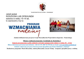 WOJEWÓDZTWO KUJAWSKO – POMORSKIE Jeżeli jesteś RODZICEM LUB OPIEKUNEM dziecka w wieku 10-14 lat, to zapraszamy Cię na Zadanie dofinansowane jest przez Urząd Marszałkowski Województwa Kujawsko - Pomorskiego Miejsce realizacji programu: Grudziądz ul. Kościelna 1 Zajęcia przeznaczone są dla rodziców (również zastępczych) i dzieci w wieku 10 – 14 lat Bliższe informacje pod numerami telefonów: 660 221 547, 888 726 785 lub na stronie: www.poradnia-grudziadz.pl Zadanie realizowane jest przez Stowarzyszenie Specjalistyczna Pomoc Rodzinom „Nadzieja” Realizatorzy programu: Maria Burzyńska, Andrzej Burzyński, Lucyna Torłop – terapeuci, specjaliści pracy z rodziną